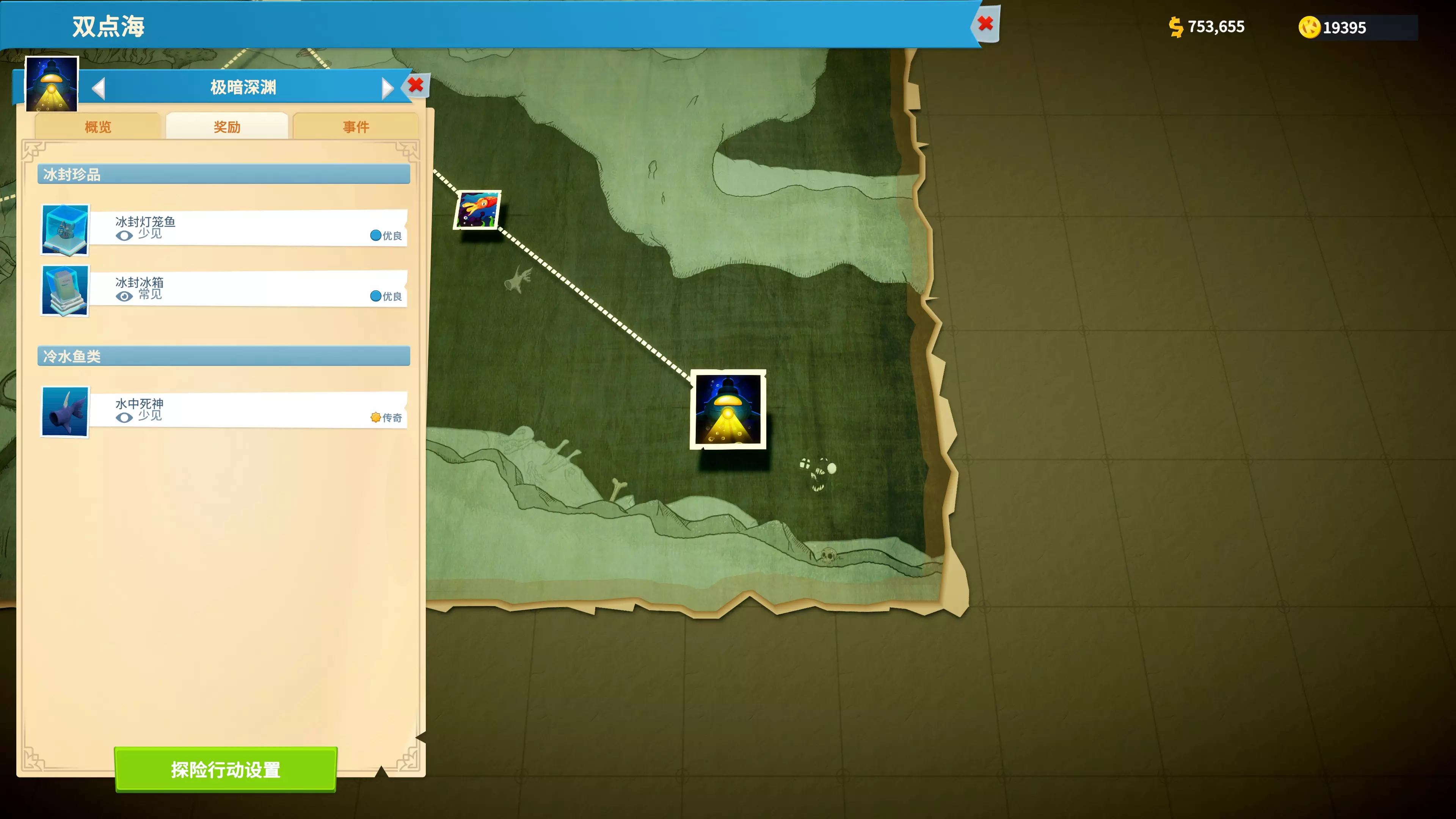 获取冰封灯笼鱼 游戏无法直接获得鲜活的灯笼鱼,需要从冰封状态解冻。 首先需要到双点海的极暗深渊进行探险活动,获得冰封灯笼鱼。
