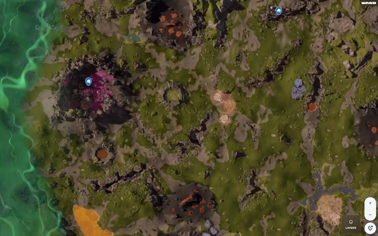 CRRO“孢子岩”位于地图最东侧,隶属于Clever Robotics。这里到处都是蓝色孢子,外星生物不断刷新,还有一只歌利亚害虫守卫该区域。目前来说都是标准配置。 从科波菲尔出发,你可以走它北边的小路,避开大部分害虫。蓝图宝箱位于悬崖顶部的一个小平台上,就在一台破损的雷达状机器后面。