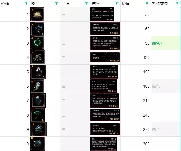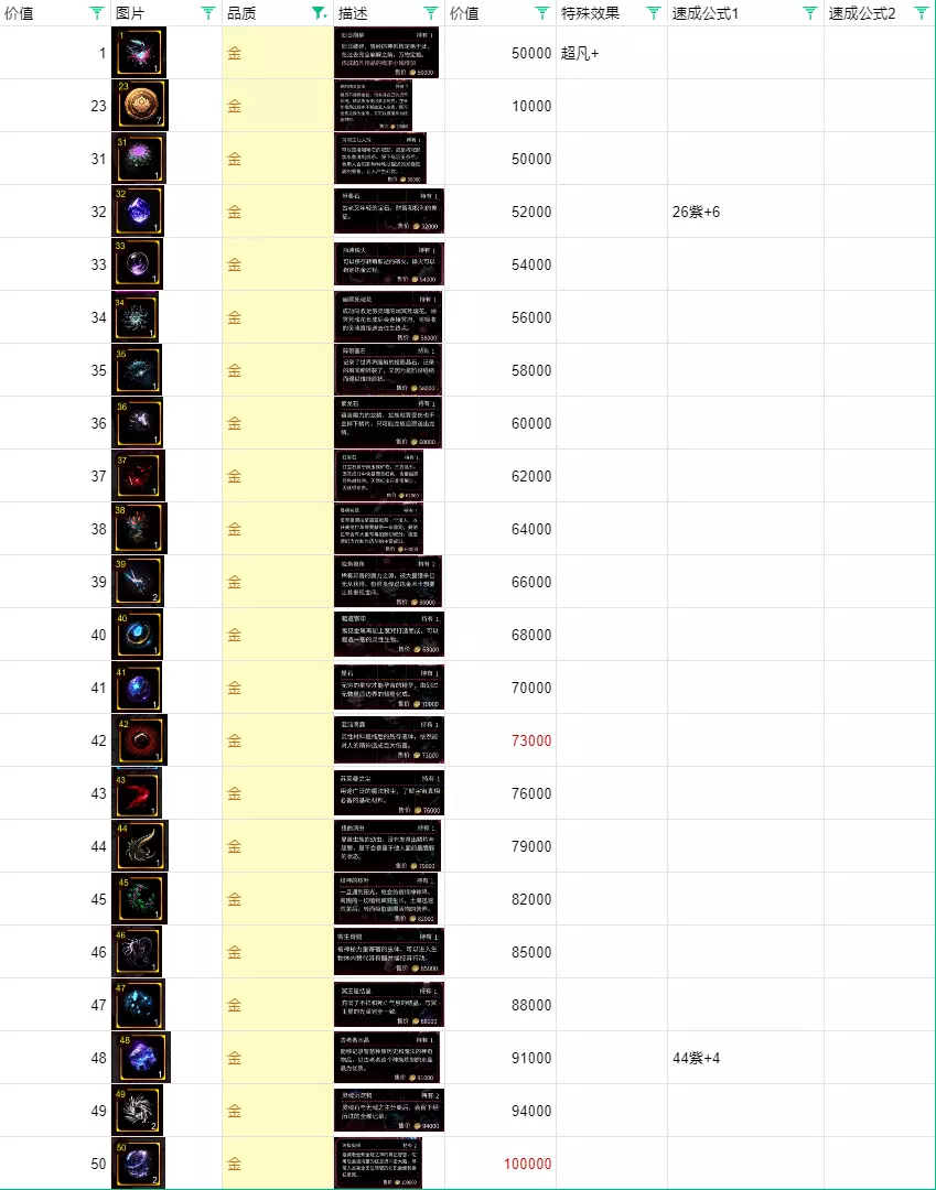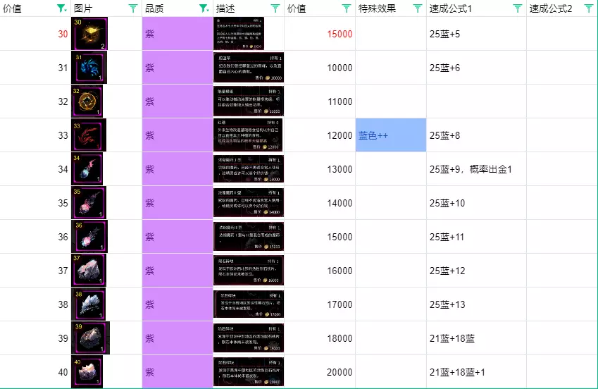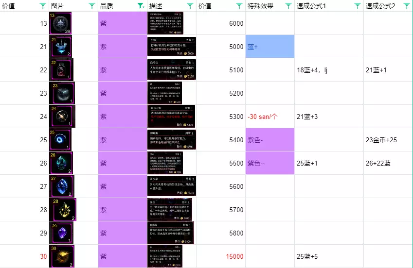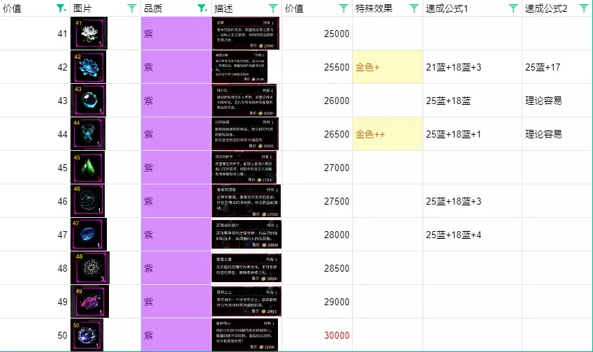 绿色与蓝色合成,蓝色卖掉的净利润是50%。 紫色: 点数21开始会出现紫色,一直到50点。 旅客会赠送点数13的货币。 紫色的概率在等级5时特别低,强烈建议升到6级或7级后再考虑全部解锁。 优先合成出紫33,固定配方会用到。 紫42、45在炼金等级提升后很容易刷出。 金48可以用紫44加4合成,概率方面靠数量堆上去就行,准备十几二十组,看运气。 【21紫-30紫】