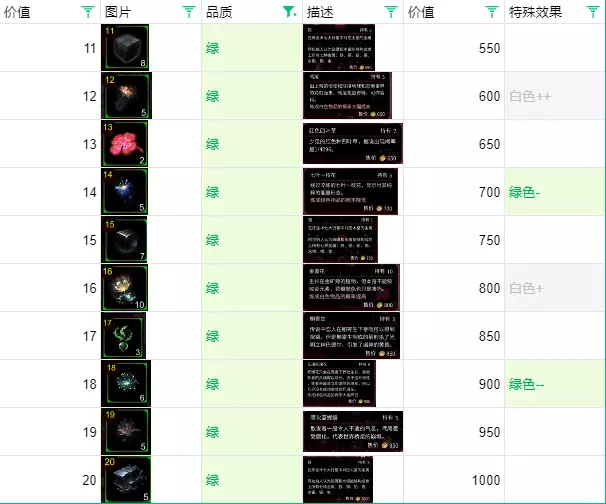 绿色 点数11-20为绿色。 百合绿,绿色物品卖掉的净利润是40%,前期如果实在缺钱可以倒卖一下。 想尽快解锁炼金等级:多炼制14绿和18绿,后面非常有用,尤其是缺少白1、白2、白3的时候,真的很痛苦。