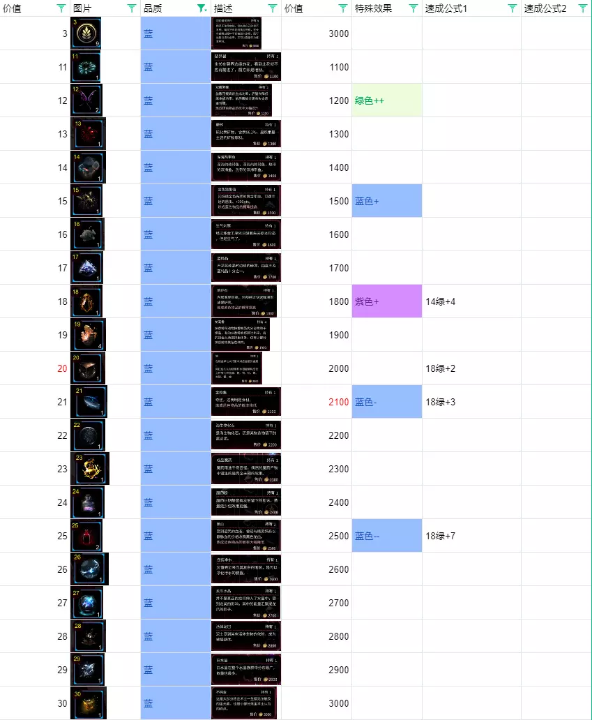 蓝点数11-50均为蓝色。但实际上从26开始的蓝点数不具有特殊效果,没有专门炼制的必要。 旅客有时会赠送3点的蓝色货币,将其出售比拿去炼金更划算。 若想尽快解锁炼金等级,可多炼制18蓝、21蓝和25蓝。 25蓝非常重要,尤其是在你想解锁紫21~紫38时。 18蓝和21蓝的组合适合紫39以上。 【11蓝-30蓝】