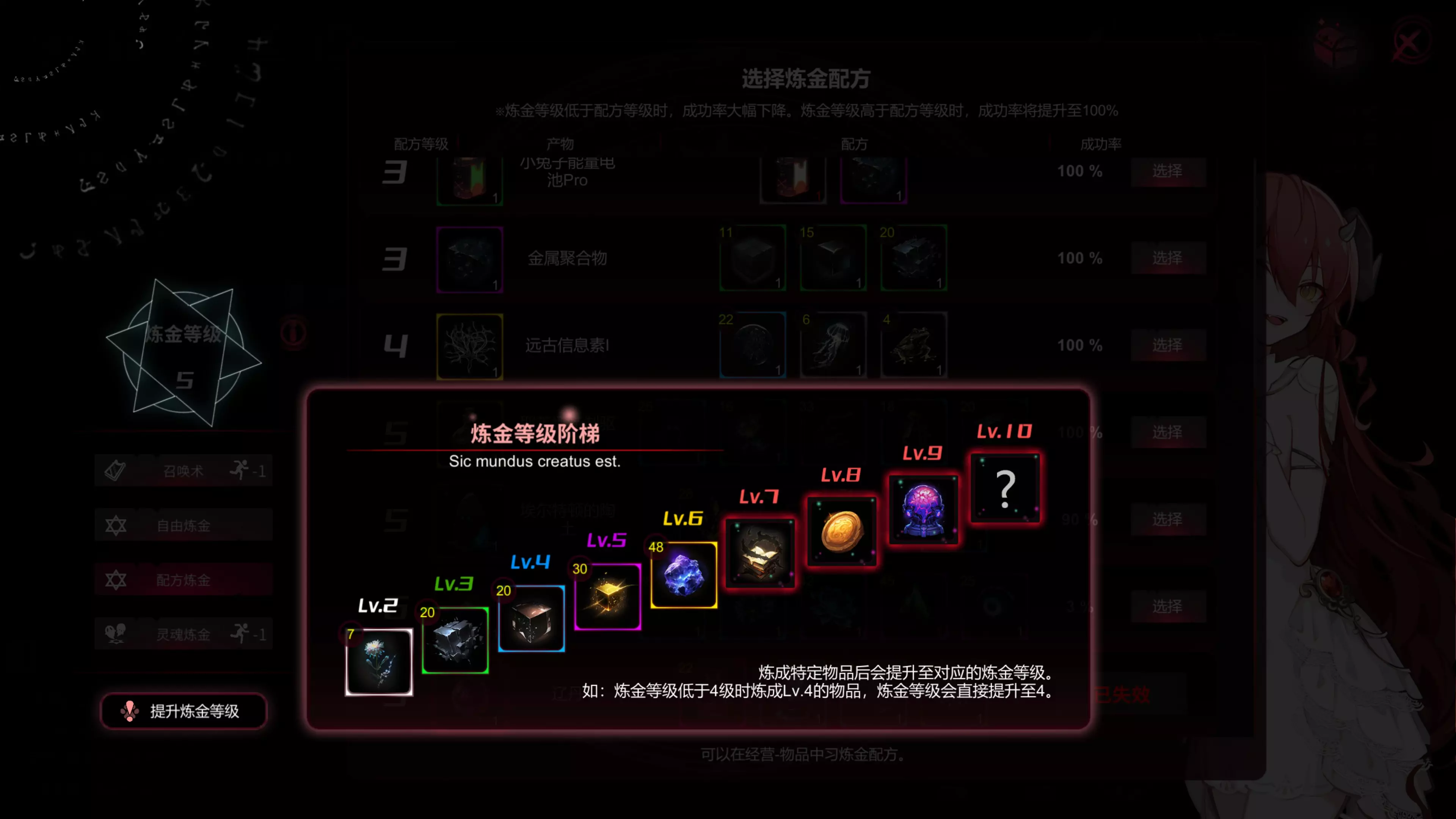 上帝投骰子吗?炼金苦手快到碗里来! 玩法简单说明 会做加法就行。 A+B=C。 本质上炼金就是做数学题,以及概率玄学。 大家都是48,可能你炼出金色传说,他炼出蓝的,呃....运气挺重要。 图鉴不是完全版,随着游戏进度会更新。 更新说明:部分列表附有速成公式,虽然概率感人,但量变会变成质变(呜呜呜).... 炼金等级&神谕&配方 固定配方获取: 1、红龙女士房间升级赠送。 2、主线任务。