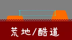 右侧的图像是按照从上到中央、左右、中央之后再左右的顺序操作的结果。 - 如果要在车流量少,或者车流量大但为单向通行等不需要宽幅的地方铺设,使用上方的中央平坦化就足够了。 - 如果因为有弯道或长车辆通行,需要考虑内轮差而希望有一些余量,但又不想增加太多作业量,那么以中间的中央为起点进行左右平坦化。 - 如果有多个AI车队,玩家也会通行,车流量较大,那么就不要怕麻烦,将上方的左右也进行平坦化,形成下方的形状。根据沙子的堆积方式,可能会出现如图像所示的不足情况,因此可以在不足的地方稍微补充堆积,或者从一开始就增加投放量。当地面或地形隆起严重,出现如以下图像所示的路面比预期更粗糙,或因高度差形成接缝的情况,即使做得粗糙些,也可以先堆上沙土进行简单平整,之后重新铺设沙土并再次平整,这样能得到比较整洁的效果。