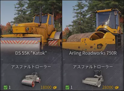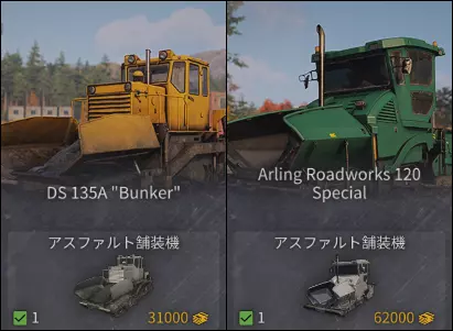 重机名DS 135A "Bunker" Arling Roadworks 120 Special 铺设宽度4.9米 6米 驱动方式履带 履带 差速器-- 入手方法:清理现场(Aftermath)等级14 ・铺设刀片有时会穿透非动态物体。可能是故障。 ・有时会觉得DS135A的移动速度更快? ・120Sp很难放到大型Step39331上。长距离移动使用运输型Zikz605E会更轻松。 压路机,也称为Roller压路机。本指南中应标记为【碾压/压路机】。 碾压宽度比铺设机窄,如果要碾压整个铺设面,必须往返一次,移动距离较长。因此,由于其设计不会因使用时间长或移动速度导致压实不足,优先进行除锈或更换为更高型号的设备也不会有损失。