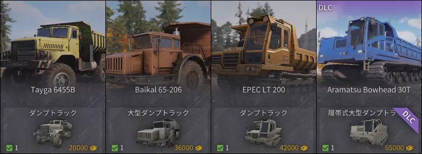 起重机名称 Tayga6455B Baikal65-206 EPEC LT200 Aramatsu Bowhead30T 装载量 10吨 40吨 5吨 20吨 驱动方式 全轮驱动 全时全轮驱动 全时履带 履带 差速锁切换 全时 -- -- -- 获取地点 余波(Aftermath) 沉没(Sunken) 等级13 DLC ・Tayga和Baikal的加速都比较迟缓。可以先启用侧制动器,然后踩下油门,在松开侧制动器的同时让车辆扬起沙土,这样能使最初遇到的巨大沙堆体积有所减小。 ・Baikal在补充物资时会泄漏,行驶过程中会泄漏,铺设物资时也会泄漏,泄漏情况十分严重。不过因其装载量较大,在没有沙土的区域进行物资传递时,作为中转工具还是很方便的。・EPEC LT200感觉与其所需等级不太匹配,但在用于填补接缝和消除台阶等局部铺装上很实用。不过,它的货箱倾斜角度要比其他机型大出一倍以上才能卸下土石,不熟悉的话反而会觉得不好用。 ・如果有阿拉玛兹30T的话,优先购买它。价格虽然高,但性能与之相符,货箱可以360度旋转,因此作业时不受车身朝向影响,非常舒适。推荐购买。 推土机:用于将自卸车运来的土石推平的作业车。对应车型有2台。 带推土机的卡车没有平整功能,只有能推动障碍物的功能。手动平整土地也很困难,所以如果是为了平整土地而购买,需要注意。除了平整地面外,还可以将障碍物(岩石、集装箱等)从场地中推出去,因此使用频率和目的有多种。除锈/升级的优先级较高。