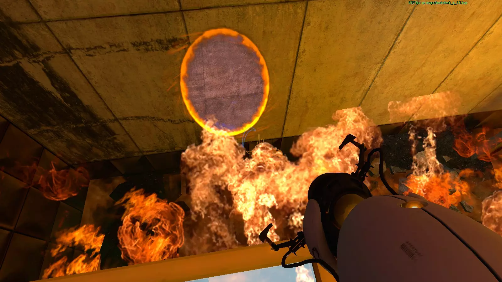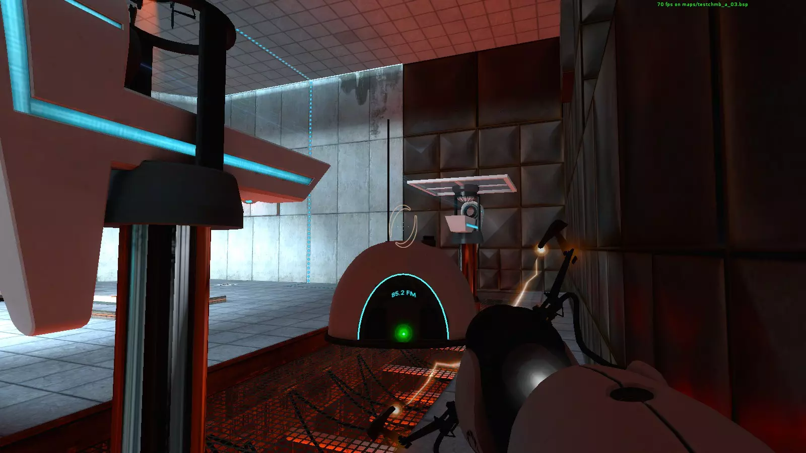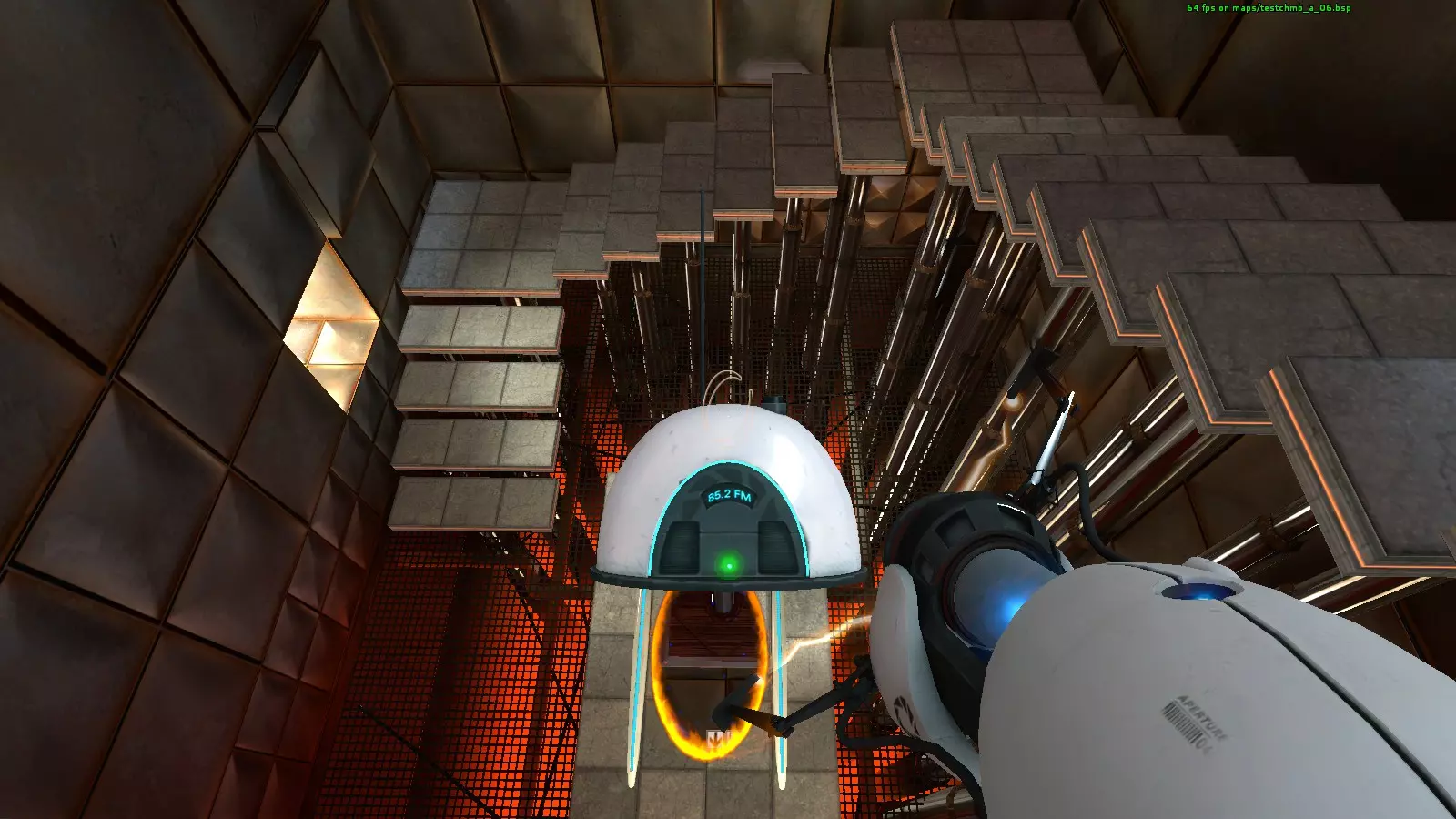 收音机#23 地图:testchmb_a_15.bsp 这是另一个很容易错过的收音机。当你接近旅程终点并即将进入火焰区域时,我意外地把传送门直接开在了收音机上方。你需要先确保自身安全,然后回头看向火焰区域寻找收音机。从安全区看过去,它在墙的右侧;从移动平台看过去,它在墙的左侧。
