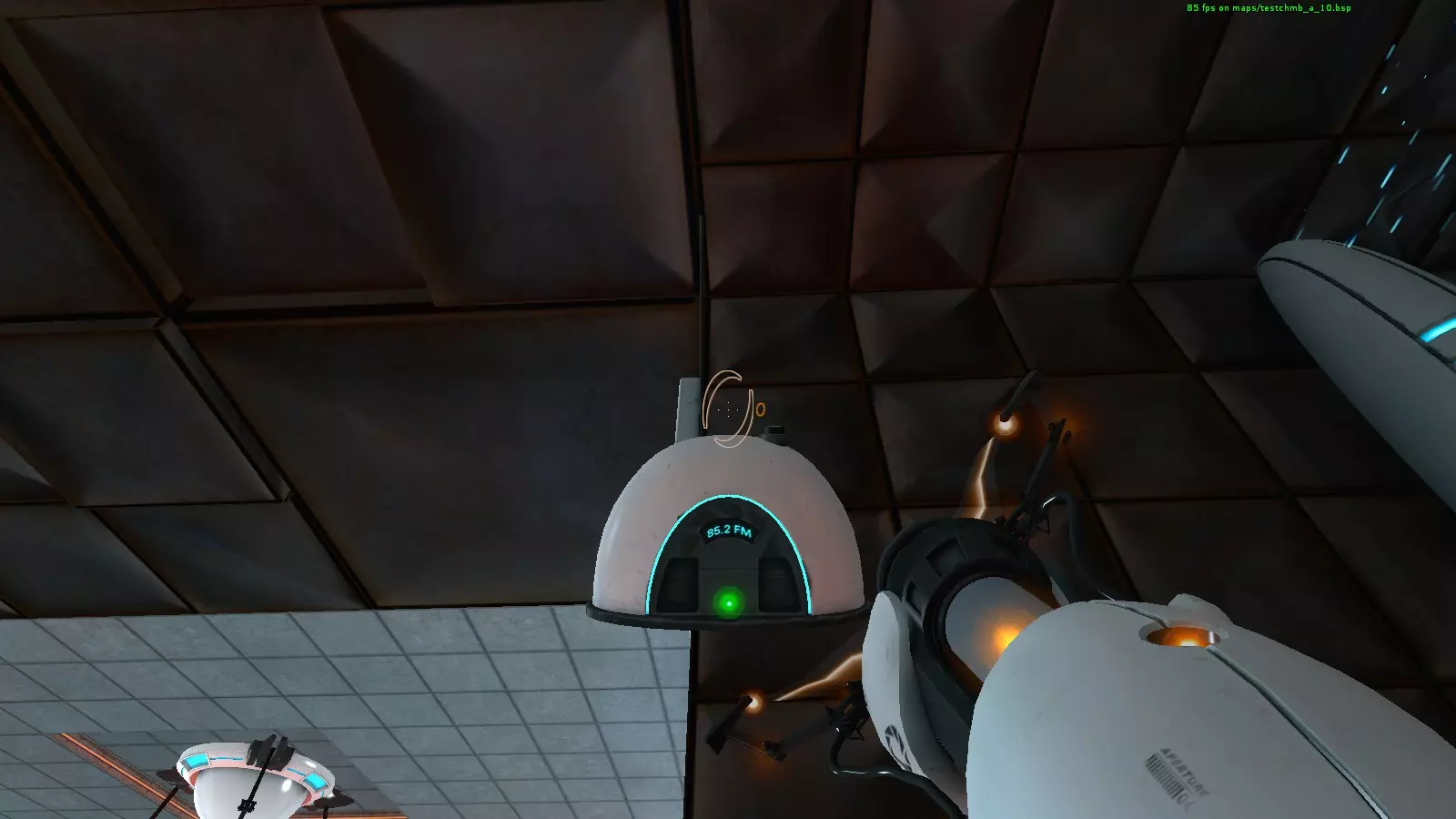 收音机#7 地图:testchmb_a_03.bsp 这个有点难获取。在下一个区域,抬头查看发射那些球体的天花板位置。收音机就位于边缘处,你需要在那里开一个传送门,然后尝试获取它。