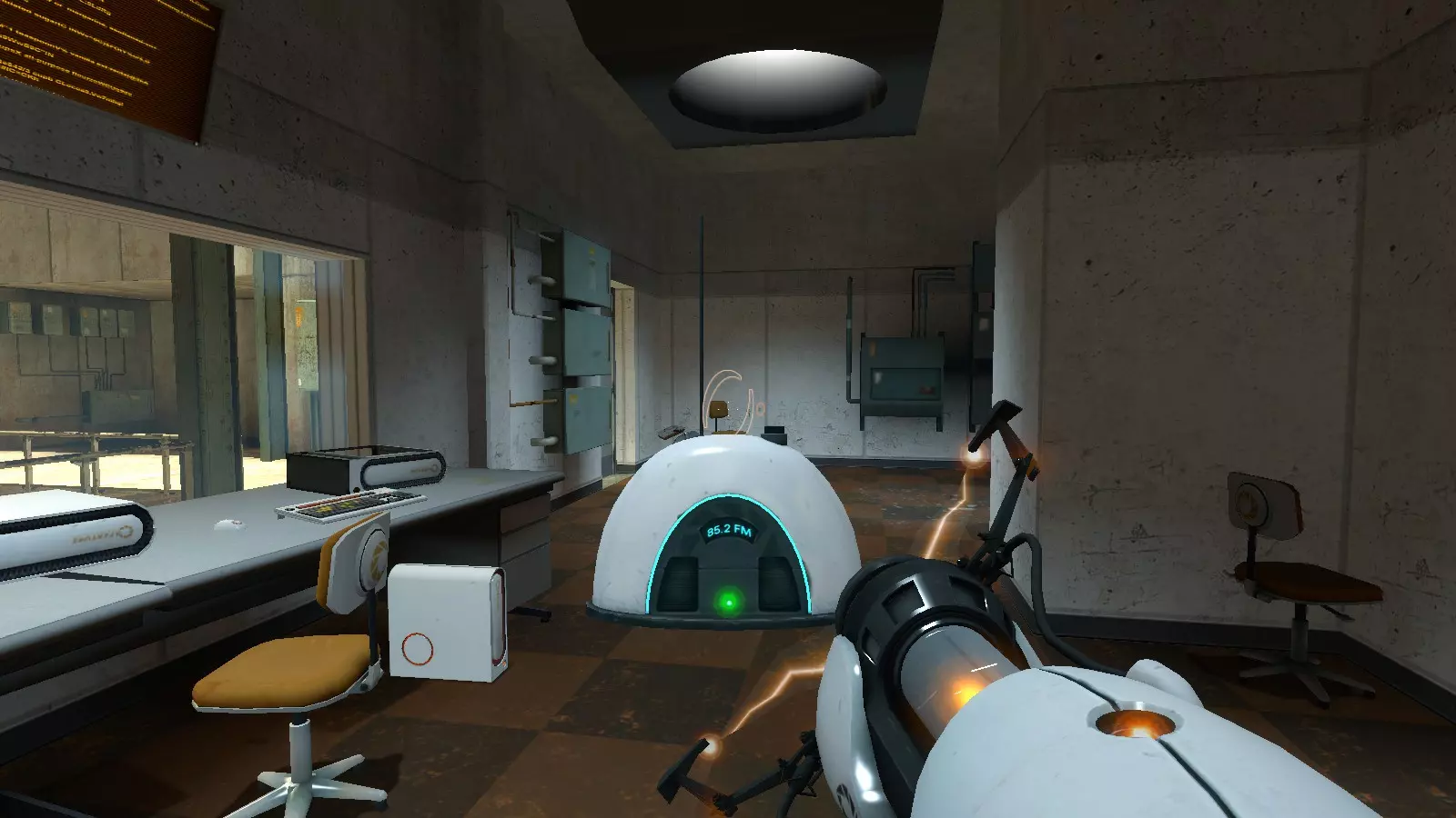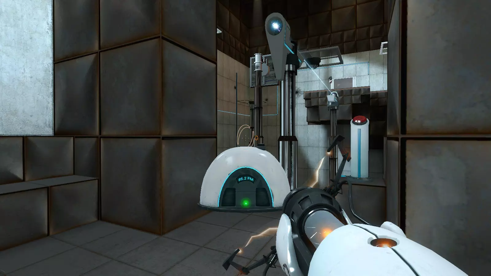 广播#16 地图:testchmb_a_10.bsp 一开始你会遇到力场,抬头看墙上那个稍微突出墙面的立方体,它后面的液压装置上有一台收音机。