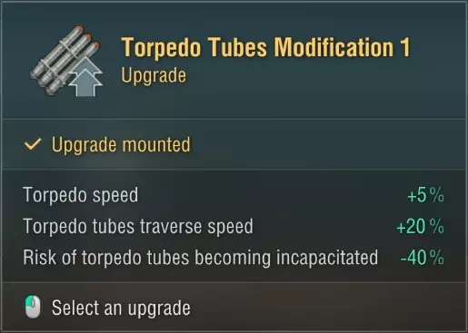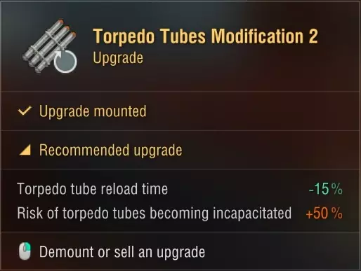 【坚韧】技能将确保更长的生存时间,因为潜艇没有维修小组消耗品。 关键装备 所有 tiers 最有用的装备是更快的鱼雷速度。