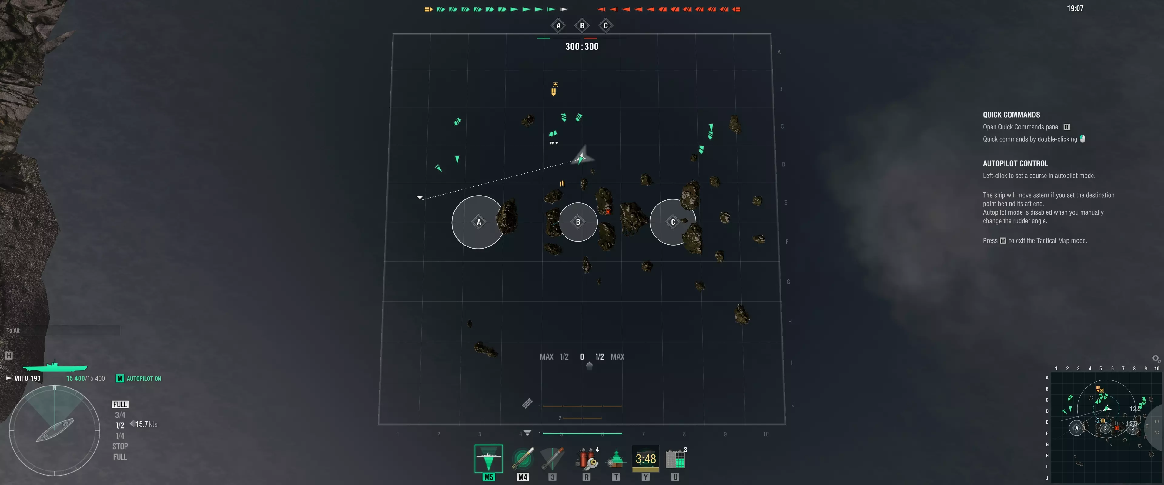 像潜艇一样思考 潜艇是最为笨重的舰船,需要像下棋一样提前规划好几步行动。由于几乎无法倒车,因此占位就是一切。 你需要敏锐地判断何时该进攻、何时该防御,从而确定最佳位置。每一步都必须仔细计算,以避开海中众多隐藏的死亡陷阱! 开局行动 潜艇应尾随附近友方驱逐舰,同时保持一定距离,以便执行进攻或防御机动。 在获取足够情报数据后,第一分钟将能大致了解敌方舰队情况。他们的位置会像一个连线谜题,帮助你缩小最佳行进路线的范围!威胁评估 潜艇必须保持安全距离,该距离约为鱼雷最大射程的80-90%。必须持续监控周围环境,以避免被包围,并应对最具威胁的目标。 各类敌舰的威胁等级概述: 威胁类型 优先级 驱逐舰 1 潜艇 1 巡洋舰 2 战列舰 3 注意:潜艇的主要弱点是与追击舰船进行近距离战斗,或过早被发现而遭到集火攻击。 高级定位 每张随机地图都有数量不等的岛屿,这些岛屿会阻碍移动。应避开B等区域。
