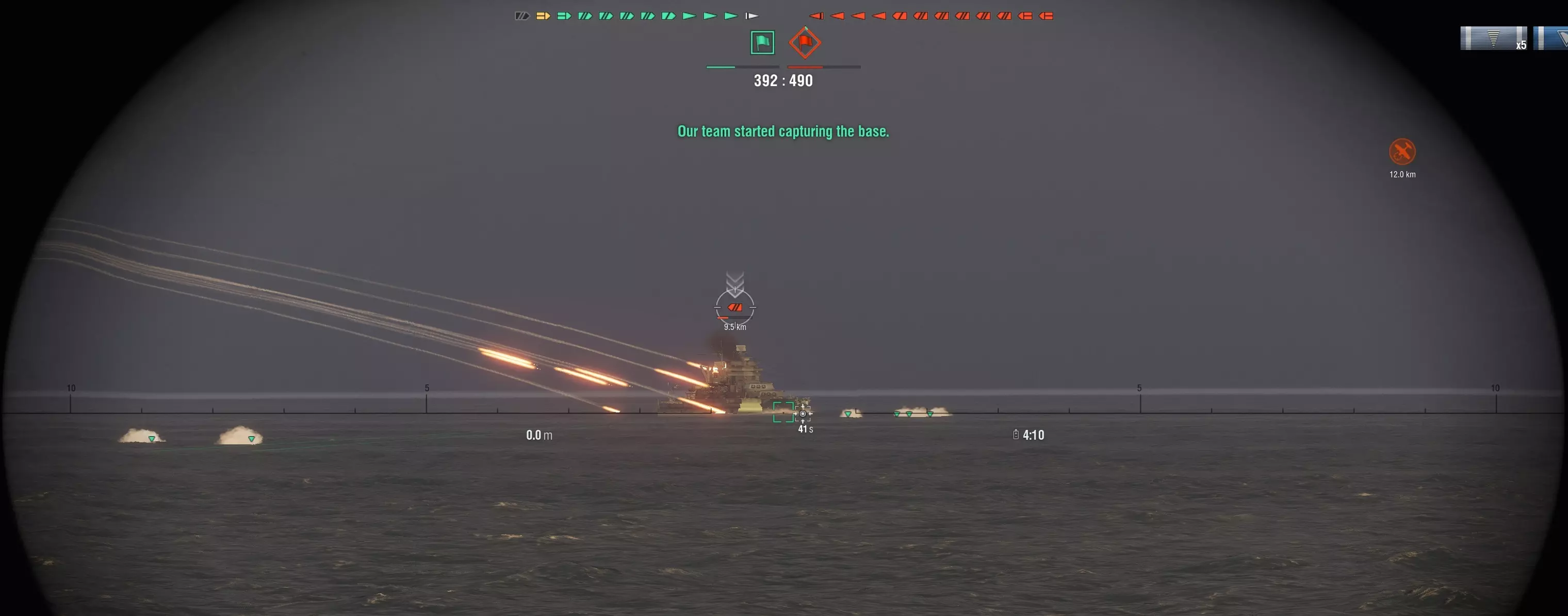 这种复杂技巧一次仅能有效用于两艘舰船: 1. 发射舰首鱼雷时,尝试对首个目标舰船进行双重 ping。 2. 发射舰尾鱼雷前,尝试对第二个目标舰船进行双重 ping。 3. 若首个目标舰船使用了损管且并非战列舰,则刷新对其的 ping。 4. 若前两个目标舰船中有任何一个已驶离较远,则尝试对第三个目标舰船进行双重 ping。 5. 对所有射程内的敌方舰船重复上述流程,并优先攻击低生命值敌人。 注意:最佳伏击地点是自然咽喉要道或可能被占领的区域。 虚假声呐 ping(无鱼雷) 此类 ping 用于干扰和威慑敌方舰船,使其将注意力重新集中在自身生存上、改变航向或被困在岛屿后方。此技巧最适合用于敌方舰船数量超过2艘的舰队。这会迫使敌方分散,从而将其数量削减至可应对的水平。 注意:不会向第3艘及以上的敌方舰船目标发射鱼雷。 延迟声纳 ping 自导鱼雷至少需要一个高亮扇区才能与目标正确连接。如果敌方过早清除声纳 ping,鱼雷的路径就会被干扰,导致完全脱靶。 解决方法是延迟声纳 ping,直到自导鱼雷至少到达目标一半的距离。尽管清除了 ping,但鱼雷在靠近目标时命中率更高。鱼雷三明治 当发射的鱼雷与被标记目标之间的角度差小于约75度时,锁定式制导机制将生效。当目标至少有一个扇区被高亮显示时,鱼雷无需直接瞄准即可发射。