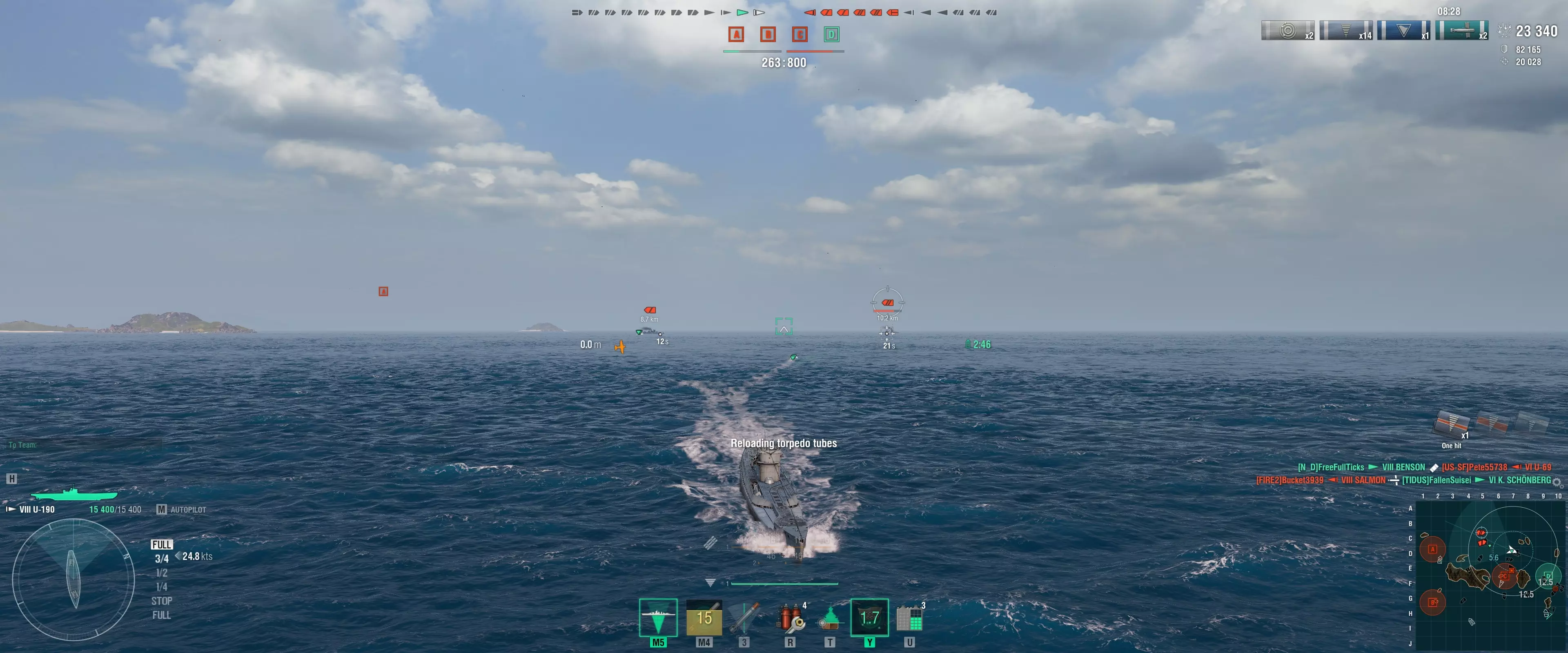 潜艇通过完全转向,可以从船首和船尾发射所有的自导鱼雷,对敌方舰船进行两次射击。为应对敌方撤退的情况,目标仍需处于鱼雷最大射程至少90%的范围内。 背水一战 这种攻击技巧是指潜艇在潜望镜深度悄悄接近敌人至2-3公里距离后,进行近距离齐射鱼雷攻击。这种高风险的攻击行动应仅在没有更好选择时使用。理想的目标是没有水声探测设备且处于孤立状态或未与其他舰船紧密编队的舰船。 近距离战斗(撤退时) 当潜艇被敌人主动追击时,需要以全速前进进行撤退。驱逐舰或巡洋舰这类高速水面舰艇会阻止潜艇完全上浮。此时只能使用声呐 ping 配合艉部自导鱼雷。 潜艇对决 敌方潜艇通常在相同或相近深度进行战斗。对于那些通过改变深度积极规避的敌人,需要使用声呐 ping。 当敌人距离小于 2 公里时,需要在不使用任何 ping 的情况下手动瞄准。自导鱼雷由于比标准鱼雷快得多,仍然是首选。近距离发射时,高亮扇区可能会干扰鱼雷轨迹,因此不建议这样做。 应对航空母舰 航空母舰拥有最精准的反潜机,一旦发现潜艇或潜艇使用 ping,就会自动起飞反潜机。解决方案是手动发射自导鱼雷,因为航空母舰(CV)凭借其强大的损管系统,会长时间免疫 ping。 一路顺风 潜艇是隐秘而谨慎的舰船猎手,不会冒不必要的风险。有限的电池电量需要节省下来,以备紧急情况或规避机动时使用。在困境中,更好的选择是尽可能保全性命,以便他日再战。 版权声明 本指南由 Laguna Queen 等人编写。(2022年)发布于Steam平台,未经作者授权及署名,禁止转载。您可以通过下方的指南评论区与我们联系。 我们仅在Steam平台发布指南,请支持原创作者,拒绝抄袭网站! 您也可以阅读其他游戏的指南:以下是一些内容详尽且针对不同主题和挑战的详细指南: 战机世界 冰汽时代 全面战争:战锤3 哭泣的太阳对于《英雄连2》 对于《死在文兰》 对于《感染幸存者》 加入我们的群组以订阅! 订阅位于我们“莉娜教会”群组置顶公告的详情中。