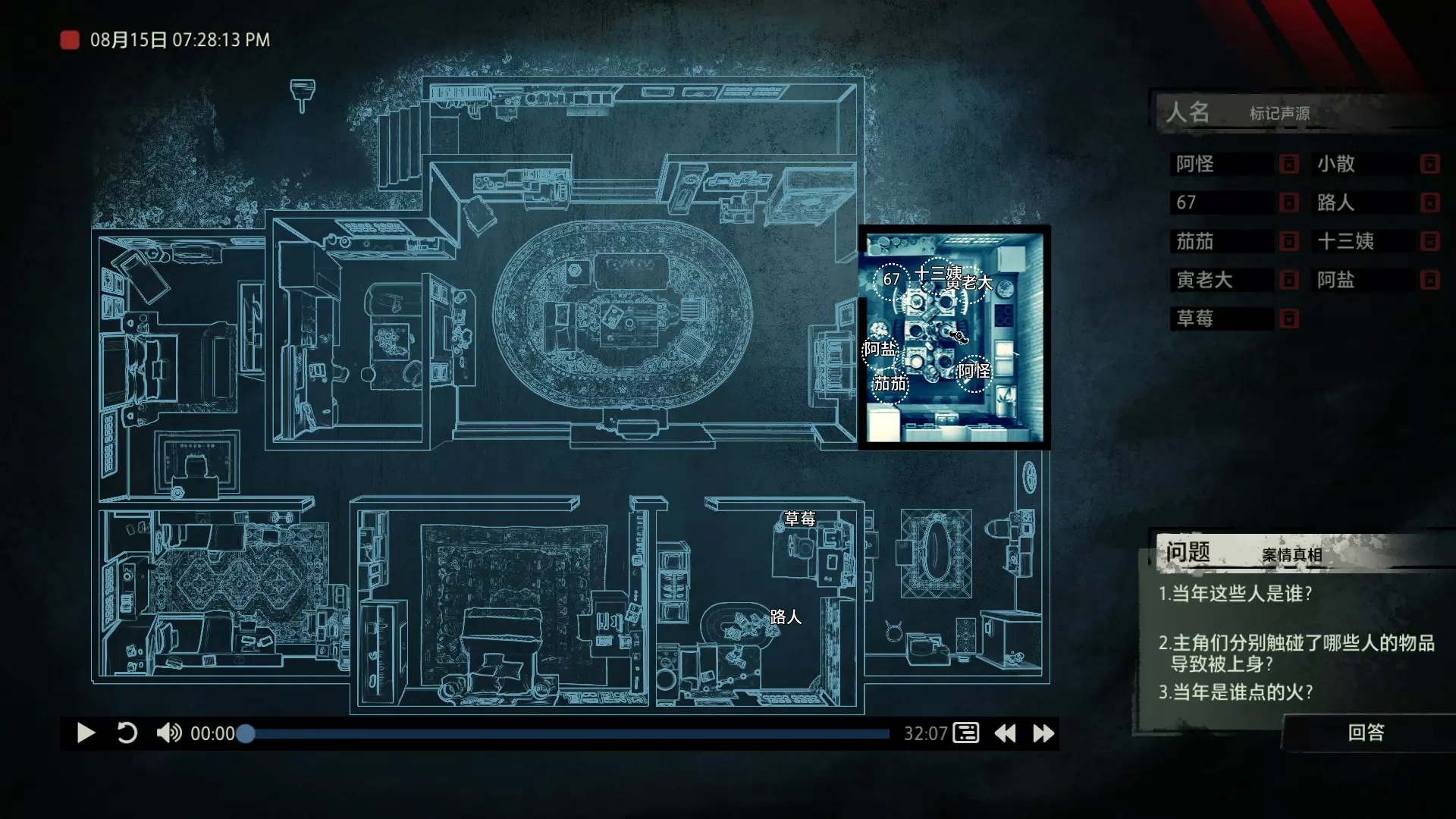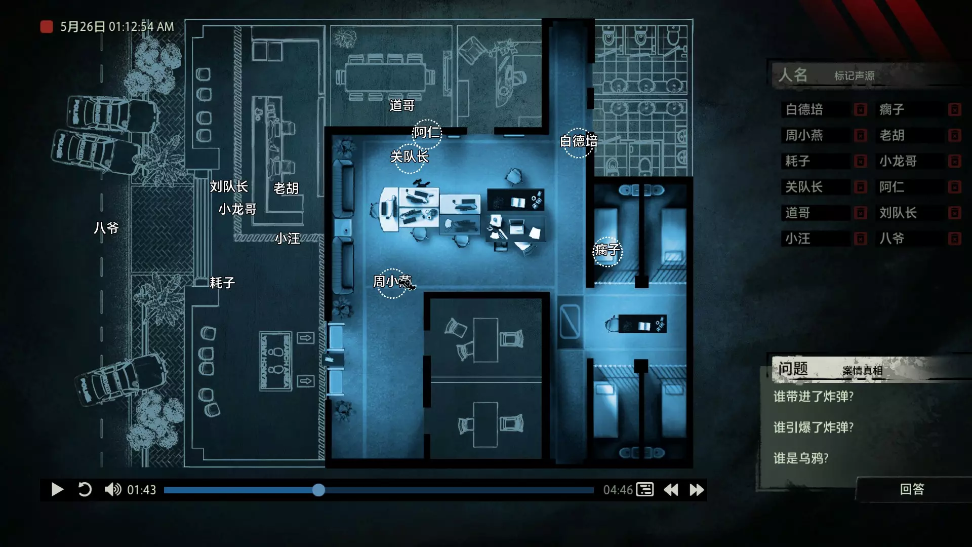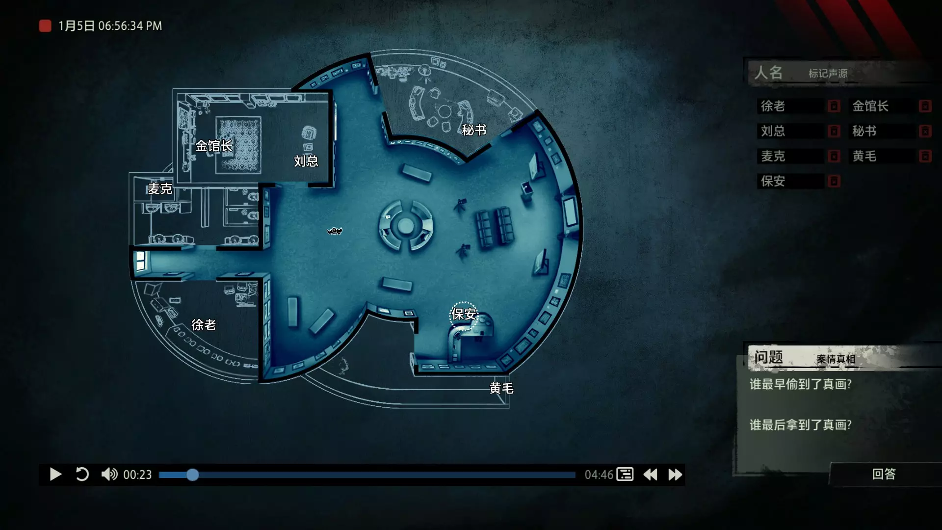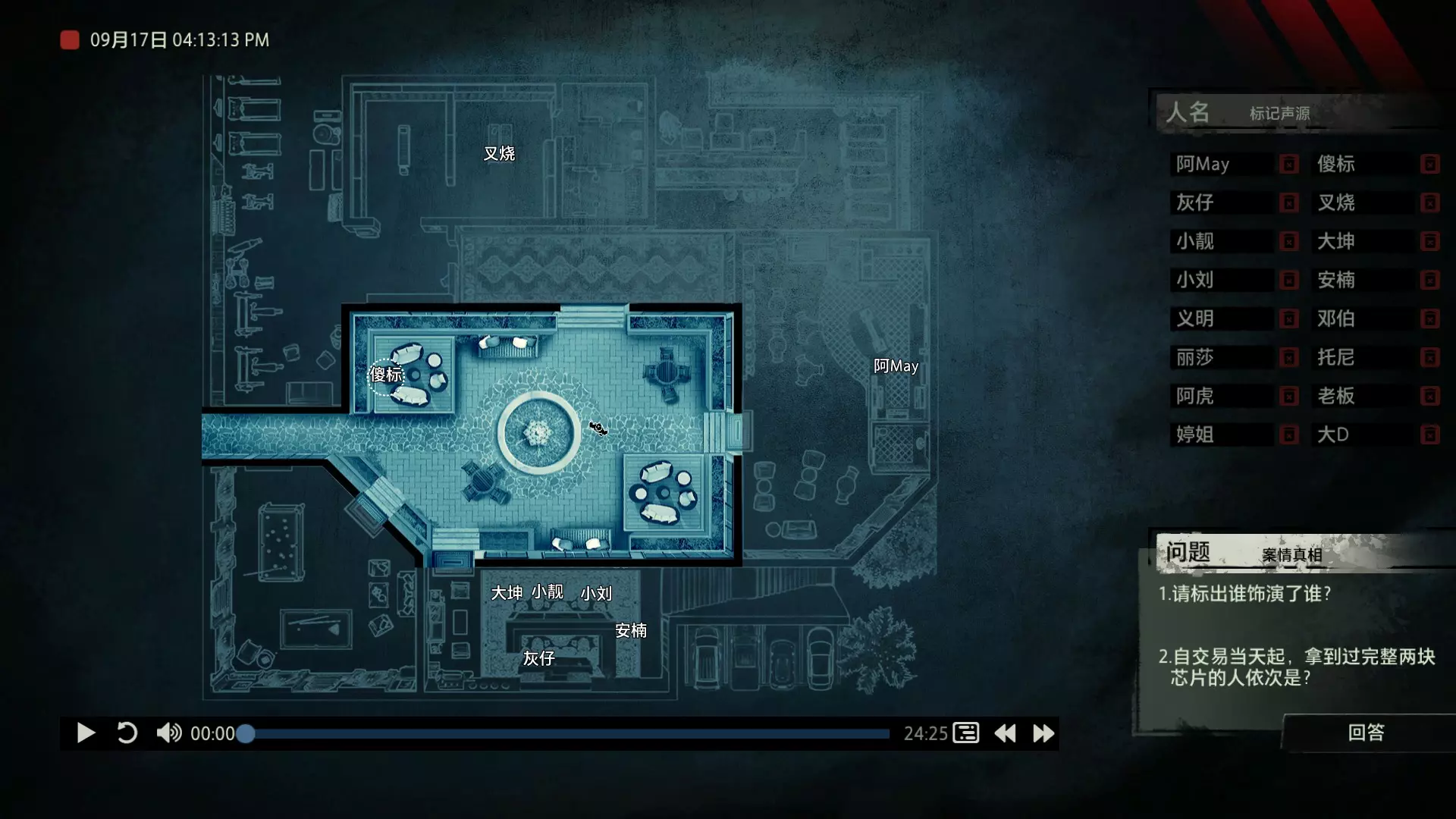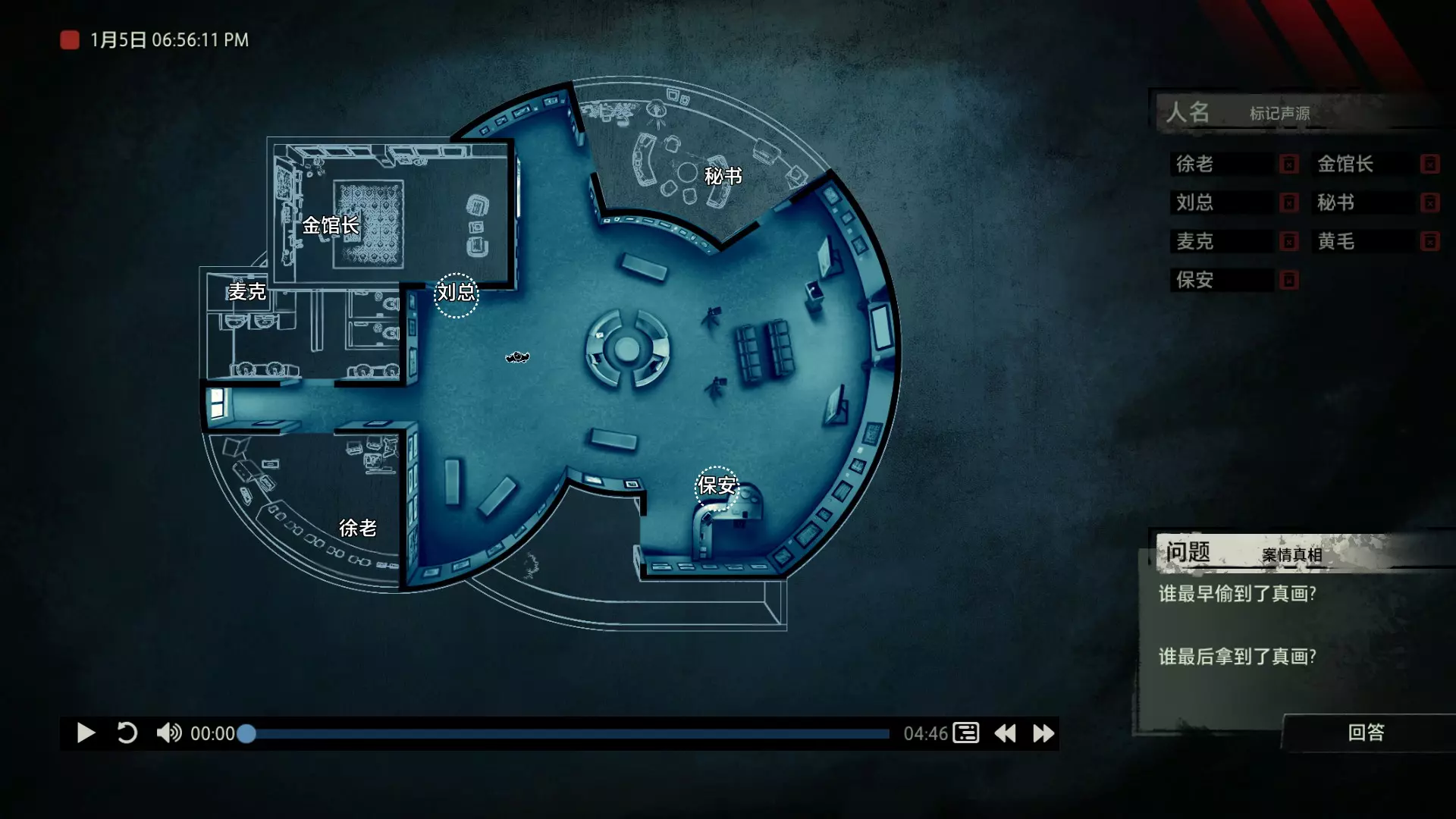 案件中的人物会随着剧情进展而移动到不同的地方,跟随某个人物可以了解到他的一举一动。整个原声音频听上去是连贯的,但可以听到的线索实际上是零碎的。因为录音的收音范围只有一个房间那么大,而地图上却有许多个不同的房间。由于案件过程中时间是平行的,所以想听到同一时间其他人在干什么、说什么,你只能在地图上操控自己前往别的地方。 所以想一次性就了解到案件的全貌是不可能的,听完一遍录音你可能只能收集到某一个人的信息,或者了解到某一个房间发生的事情。想要把故事完整地拼接起来,你得把提供的音频反复听上好几遍,跟随不同的人物,前往不同的地方,最后才能洞悉案件的全貌从而推理出真相。每一个关卡,就是一个案件的谜团,我们需要跟踪几乎全部的人物,从他们的话语里找齐线索和证据,像拼图一样,把每一个板块拼上,来还原案件真相。而有时,要从长达几十分钟的时间里这个人所说过的所有话中甄选出你需要的信息,这无疑是对我们的耐心和细心程度的一种考验。 简单讲,《疑案追声》的玩法可以用下面这个不是公式的公式来表示下:谜团——>全部线索分散在一些关键人物身上——>凑齐全部线索——>真相 关于剧情 以下内容涉及剧透,如想获得原原本本的游戏体验,请不要再往下看 本体第一个故事—双胞胎 双胞胎两兄弟,哥哥是个网红CEO,弟弟是个玩世不恭的富二代。哥哥屡次喝酒打架、寻衅之事被关到派出所时,经常骗警方说自己是弟弟,所有脏水都往弟弟身上泼。而弟弟也一副无所谓的态度,觉得哥哥CEO的形象要维护好,自己担下来没关系。可事情没这么简单!哥哥因为酒驾被抓,在派出所故技重施,骗警方说自己其实是弟弟,然而,警方在哥哥车里发现了毒品!哥哥慌了,承认自己是哥哥的身份,因为欺骗了警方,再加上说不清毒品的来源,弄得自己嫌疑很大。视角来到弟弟这边,对警方坦言,哥哥经常给自己泼脏水,这次因为牵扯毒品,自己不愿意再背黑锅了。然后,在弟弟独处一室,跟外人打电话时,借助声探系统能够听到毒品是弟弟买的,也是弟弟把毒品放进了哥哥的车里,目的就是陷害哥哥,好继承遗产。 本体第二个故事—空画框 有位画家,觉得社会上的艺术风气不好,人们鉴赏艺术品完全靠社会评价的引导,而不是自我的认知。为了尝试改变这种风气,这位画家联合美术馆搞了个活动。画家自己找了个小偷,把自己的画偷走,散播到社会上去,如果谁能从浩如烟海的艺术品市场里找出画家手笔的画作,就说明这是一次美学的回归,活动目的也算达成了。然而,画家的助理动了歪心思,既然都是偷画,干脆自己找人来偷,找幅假画来跟真画掉包,趁机把真画搞到手,卖出去,助理可以赚一笔。活动当天,画家找的小偷A,商人找的小偷B,想买真画的商人,都到位了。秘书在开局电话中说过,她是不过手真品的,所以秘书手里的假画是仿制的赝品(秘书欺骗了想要买画 / 偷画的老总),而老总雇佣的小偷A(也就是开局躲厕所的那个小偷)是高手,在音频开始前早就下手偷到了真画,并且用假画代替了真画。而画家找来的小偷B(找不到展览在哪儿的菜鸡)直接去储藏室拿走了被小偷A丢上去替换的假画。 但是,雇佣小偷A的老总给A打电话时候说到A手里的画是假的(但实际上是真的)导致小偷A以为小偷B手里的画才是真的(小偷A以为还有人比他要早下手)所以小偷A在和小偷B相撞时候趁机掉包了,此时小偷A手里的是假的,小偷B手里的是真的。 然后小偷B逃跑时候直接被保安抓住,真品直接被带回现场。 本体第三个故事—乌鸦 东山市有个黑社会帮派组织,其老大乌鸦特别神秘,没人见过他的长相,因为,乌鸦每赚够一笔钱,就会把小弟们聚集起来,用炸弹一次性炸死。警方盯乌鸦盯了很久了,甚至派警察去帮派内部做卧底。这次,警方判断乌鸦又赚够了一笔钱,到了实施爆炸的时候了,警方想弄清乌鸦的身份并且抓到他。这一天,警方抓住了乌鸦的几个小弟,关在了东山市警察局,询问后得知,这几个小弟要去东山市饭店聚餐,警方判断那里很有可能就是作案地点了。好巧不巧,乌鸦在饭店前踱步,被小偷偷走了两部手机,其中一部是炸弹引爆装置。有位报警的白先生,来到警察局领取自己丢失的手机,领到手机后并没有离开,而是去了警察局的厕所里打电话。帮会里有一位装假肢的小弟,他的腿因为帮乌鸦挡枪被截肢了。乌鸦送了小弟一副假腿,其实就在这一天,趁在聚餐前,这位小弟被乌鸦下药迷倒(瘸子酒量很好,轻易不醉,通关玩家可以去听听小弟同伙的说辞),乌鸦在假腿里放了炸弹。这位小弟是先来的饭店,其余小弟还没来,警方因为得知帮会聚餐,来饭店搜查,抓到了瘸腿小弟,却没看到帮会老大,警方需要把关押的小弟们全部放回去,防止老大起疑心。然而,巧合的是,帮会的小弟们因为各种各样的原因,全部被警方带到了警察局关押,这些应该在饭店被炸死的家伙们,聚集在了一起。他们死里逃生了吗?他们捡回了一条命?做梦!那位来警察局领手机的白先生,拿着手机离开警察局,结果,被警察局门口的小偷偷了手机,小偷想用电话搞诈骗,于是拨通了偷来的诺基亚手机里,唯一的一个电话号码!警方得知了帮会成员们的聚餐时间后,想把他们放回去,免得帮会老大起疑心,破坏了乌鸦的抓捕计划,正当警察们押着小弟们往外走的时候,小弟们面面相觑,他们竟然在警察局集合了!来