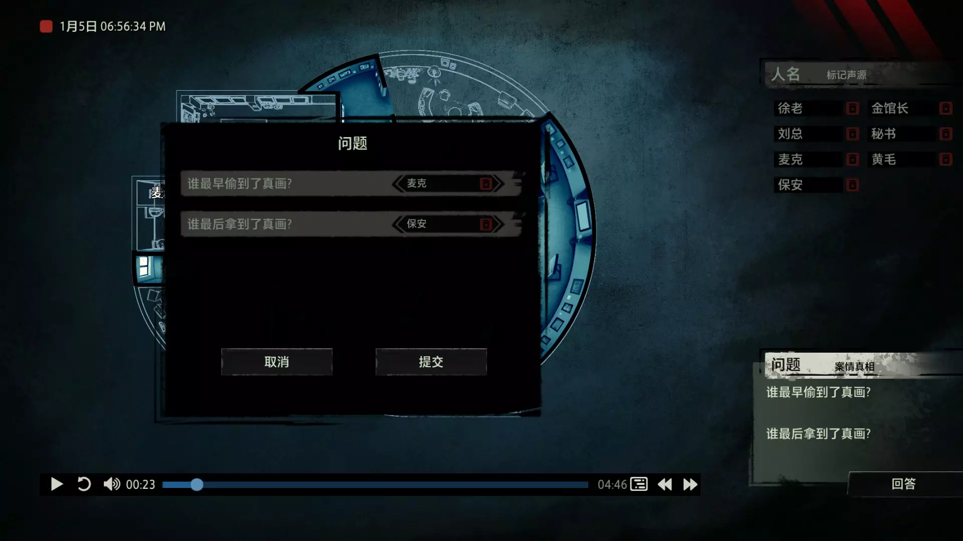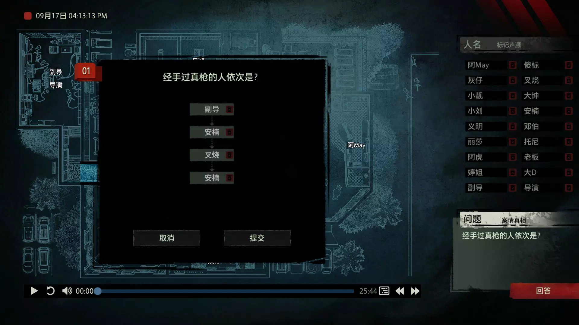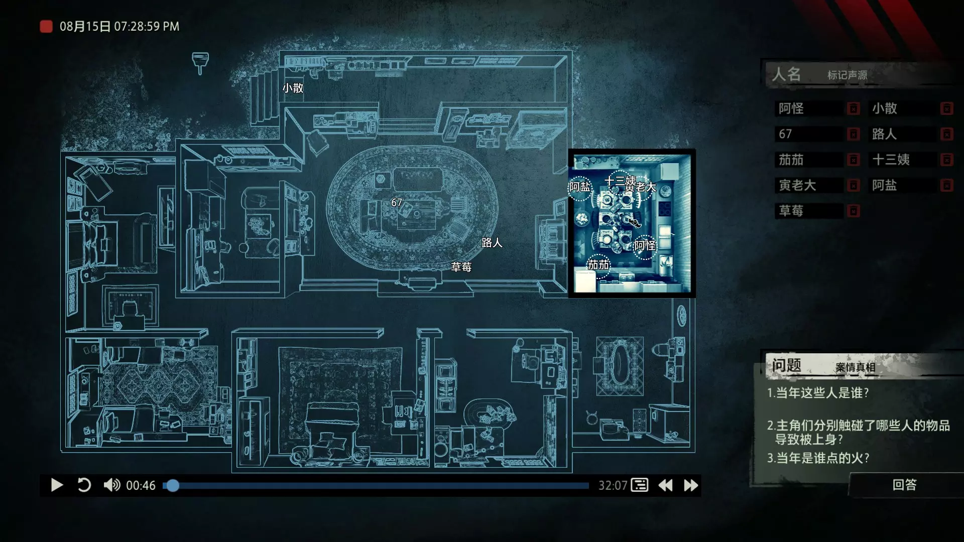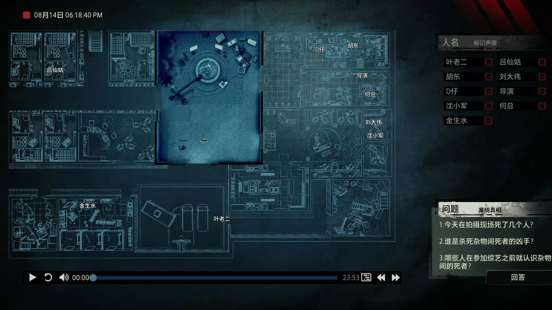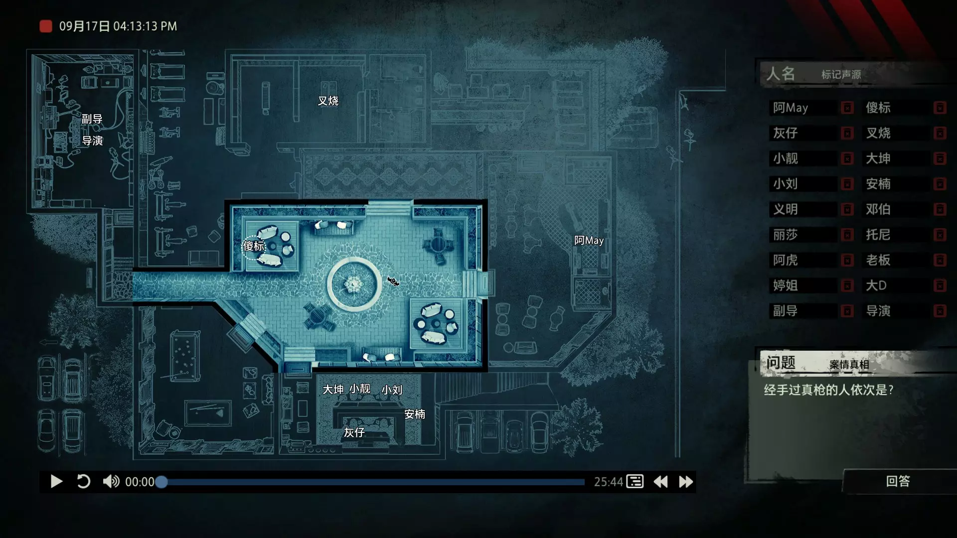案件中的人物会随着剧情进展而移动到不同的地方,跟随某个人物可以了解到他的一举一动。整个原声音频听上去是连贯的,但可以听到的线索实际上是零碎的。因为录音的收音范围只有一个房间那么大,而地图上却有许多个不同的房间。由于案件过程中时间是平行的,所以想听到同一时间其他人在干什么、说什么,你只能在地图上操控自己前往别的地方。 所以想一次性就了解到案件的全貌是不可能的,听完一遍录音你可能只能收集到某一个人的信息,或者了解到某一个房间发生的事情。想要把故事完整地拼接起来,你得把提供的音频反复听上好几遍,跟随不同的人物,前往不同的地方,最后才能洞悉案件的全貌从而推理出真相。每一个关卡,就是一个案件的谜团,我们需要跟踪几乎全部的人物,从他们的话语里找齐线索和证据,像拼图一样,把每一个板块拼上,来还原案件真相。而有时,要从长达几十分钟的时间里这个人所说过的所有话中甄选出你需要的信息,这无疑是对我们的耐心和细心程度的一种考验。 简单讲,《疑案追声》的玩法可以用下面这个不是公式的公式来表示下:谜团——>全部线索分散在一些关键人物身上——>凑齐全部线索——>真相 关于剧情 以下内容涉及剧透,如想获得原原本本的游戏体验,请不要再往下看 本体第一个故事—双胞胎 双胞胎两兄弟,哥哥是个网红CEO,弟弟是个玩世不恭的富二代。哥哥屡次喝酒打架、寻衅之事被关到派出所时,经常骗警方说自己是弟弟,所有脏水都往弟弟身上泼。而弟弟也一副无所谓的态度,觉得哥哥CEO的形象要维护好,自己担下来没关系。可事情没这么简单!哥哥因为酒驾被抓,在派出所故技重施,骗警方说自己其实是弟弟,然而,警方在哥哥车里发现了毒品!哥哥慌了,承认自己是哥哥的身份,因为欺骗了警方,再加上说不清毒品的来源,弄得自己嫌疑很大。视角来到弟弟这边,对警方坦言,哥哥经常给自己泼脏水,这次因为牵扯毒品,自己不愿意再背黑锅了。然后,在弟弟独处一室,跟外人打电话时,借助声探系统能够听到毒品是弟弟买的,也是弟弟把毒品放进了哥哥的车里,目的就是陷害哥哥,好继承遗产。 本体第二个故事—空画框 有位画家,觉得社会上的艺术风气不好,人们鉴赏艺术品完全靠社会评价的引导,而不是自我的认知。为了尝试改变这种风气,这位画家联合美术馆搞了个活动。画家自己找了个小偷,把自己的画偷走,散播到社会上去,如果谁能从浩如烟海的艺术品市场里找出画家手笔的画作,就说明这是一次美学的回归,活动目的也算达成了。然而,画家的助理动了歪心思,既然都是偷画,干脆自己找人来偷,找幅假画来跟真画掉包,趁机把真画搞到手,卖出去,助理可以赚一笔。活动当天,画家找的小偷A,商人找的小偷B,想买真画的商人,都到位了。秘书在开局电话中说过,她是不过手真品的,所以秘书手里的假画是仿制的赝品(秘书欺骗了想要买画 / 偷画的老总),而老总雇佣的小偷A(也就是开局躲厕所的那个小偷)是高手,在音频开始前早就下手偷到了真画,并且用假画代替了真画。而画家找来的小偷B(找不到展览在哪儿的菜鸡)直接去储藏室拿走了被小偷A丢上去替换的假画。 但是,雇佣小偷A的老总给A打电话时候说到A手里的画是假的(但实际上是真的)导致小偷A以为小偷B手里的画才是真的(小偷A以为还有人比他要早下手)所以小偷A在和小偷B相撞时候趁机掉包了,此时小偷A手里的是假的,小偷B手里的是真的。 然后小偷B逃跑时候直接被保安抓住,真品直接被带回现场。 本体第三个故事—乌鸦 东山市有个黑社会帮派组织,其老大乌鸦特别神秘,没人见过他的长相,因为,乌鸦每赚够一笔钱,就会把小弟们聚集起来,用炸弹一次性炸死。警方盯乌鸦盯了很久了,甚至派警察去帮派内部做卧底。这次,警方判断乌鸦又赚够了一笔钱,到了实施爆炸的时候了,警方想弄清乌鸦的身份并且抓到他。这一天,警方抓住了乌鸦的几个小弟,关在了东山市警察局,询问后得知,这几个小弟要去东山市饭店聚餐,警方判断那里很有可能就是作案地点了。好巧不巧,乌鸦在饭店前踱步,被小偷偷走了两部手机,其中一部是炸弹引爆装置。有位报警的白先生,来到警察局领取自己丢失的手机,领到手机后并没有离开,而是去了警察局的厕所里打电话。帮会里有一位装假肢的小弟,他的腿因为帮乌鸦挡枪被截肢了。乌鸦送了小弟一副假腿,其实就在这一天,趁在聚餐前,这位小弟被乌鸦下药迷倒(瘸子酒量很好,轻易不醉,通关玩家可以去听听小弟同伙的说辞),乌鸦在假腿里放了炸弹。这位小弟是先来的饭店,其余小弟还没来,警方因为得知帮会聚餐,来饭店搜查,抓到了瘸腿小弟,却没看到帮会老大,警方需要把关押的小弟们全部放回去,防止老大起疑心。然而,巧合的是,帮会的小弟们因为各种各样的原因,全部被警方带到了警察局关押,这些应该在饭店被炸死的家伙们,聚集在了一起。他们死里逃生了吗?他们捡回了一条命?做梦!那位来警察局领手机的白先生,拿着手机离开警察局,结果,被警察局门口的小偷偷了手机,小偷想用电话搞诈骗,于是拨通了偷来的诺基亚手机里,唯一的一个电话号码!警方得知了帮会成员们的聚餐时间后,想把他们放回去,免得帮会老大起疑心,破坏了乌鸦的抓捕计划,正当警察们押着小弟们往外走的时候,小弟们面面相觑,他们竟然在警察局集合了!来