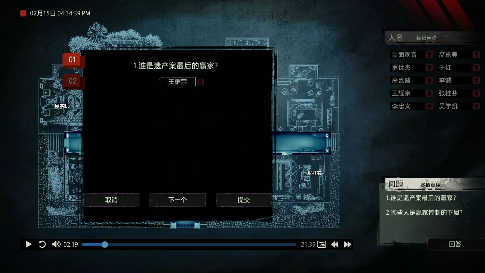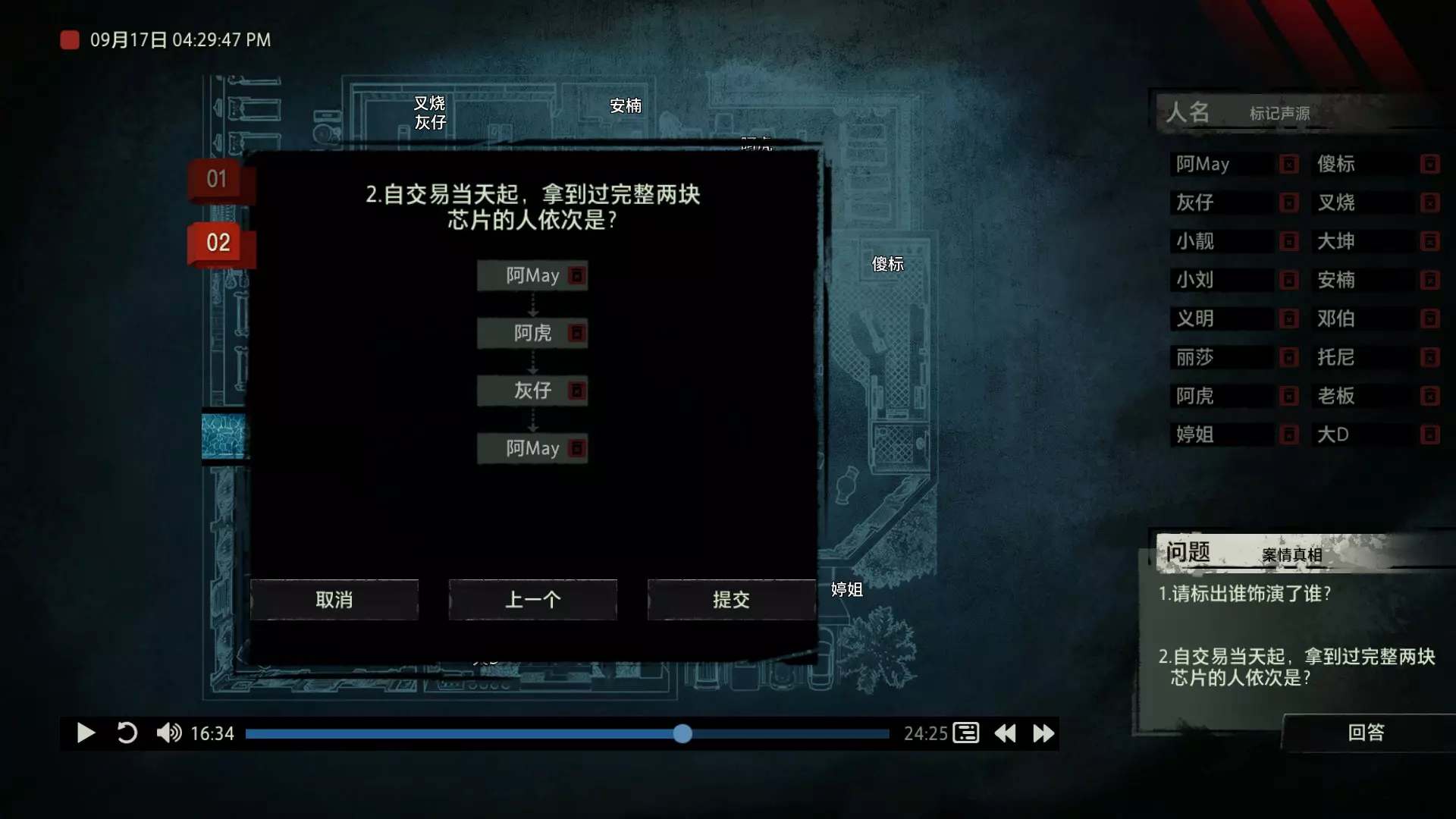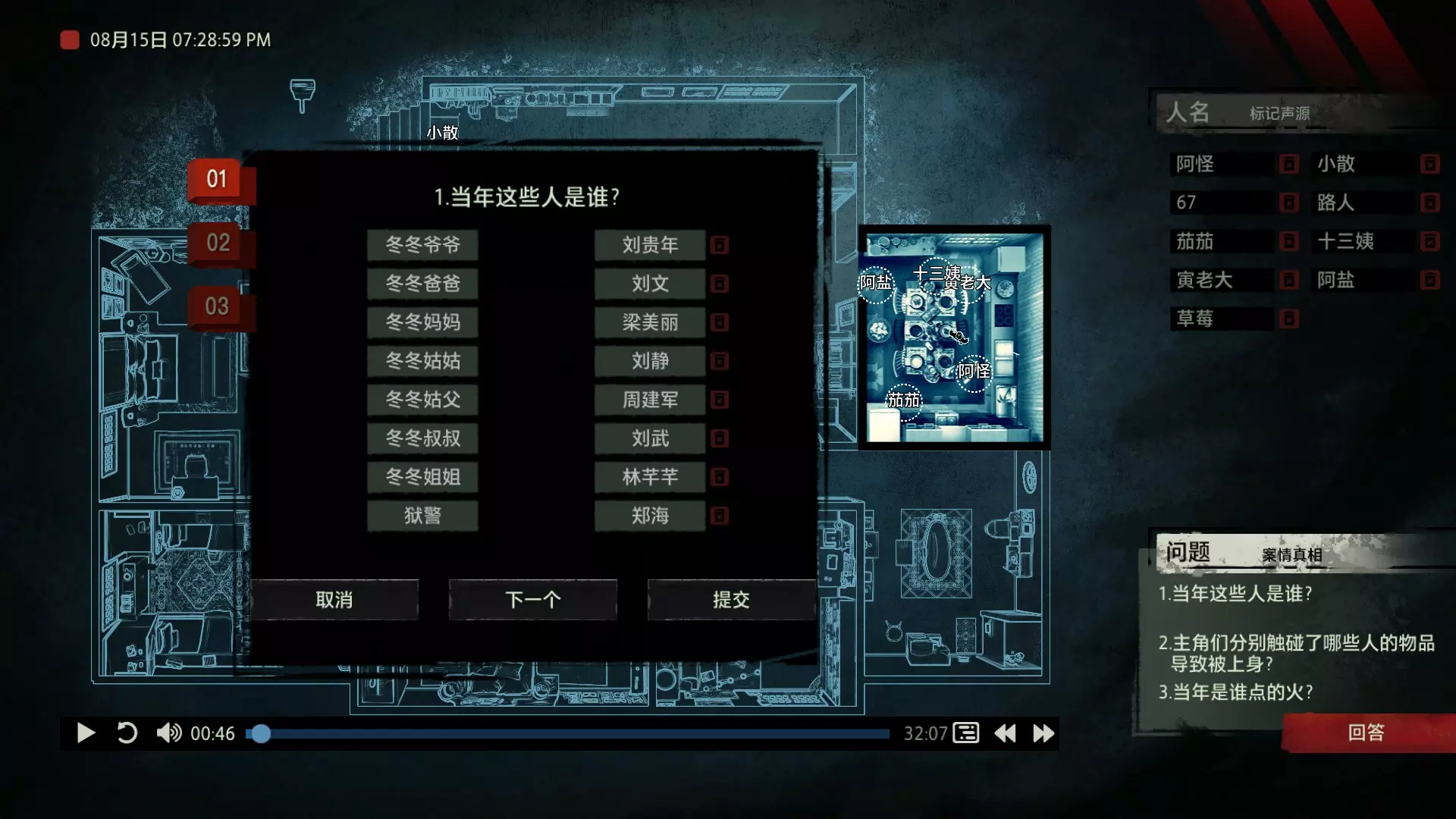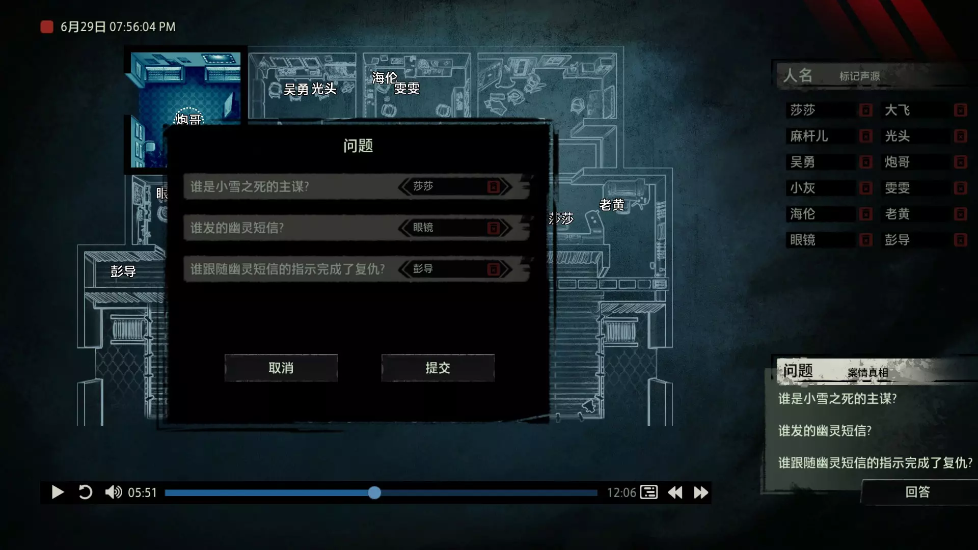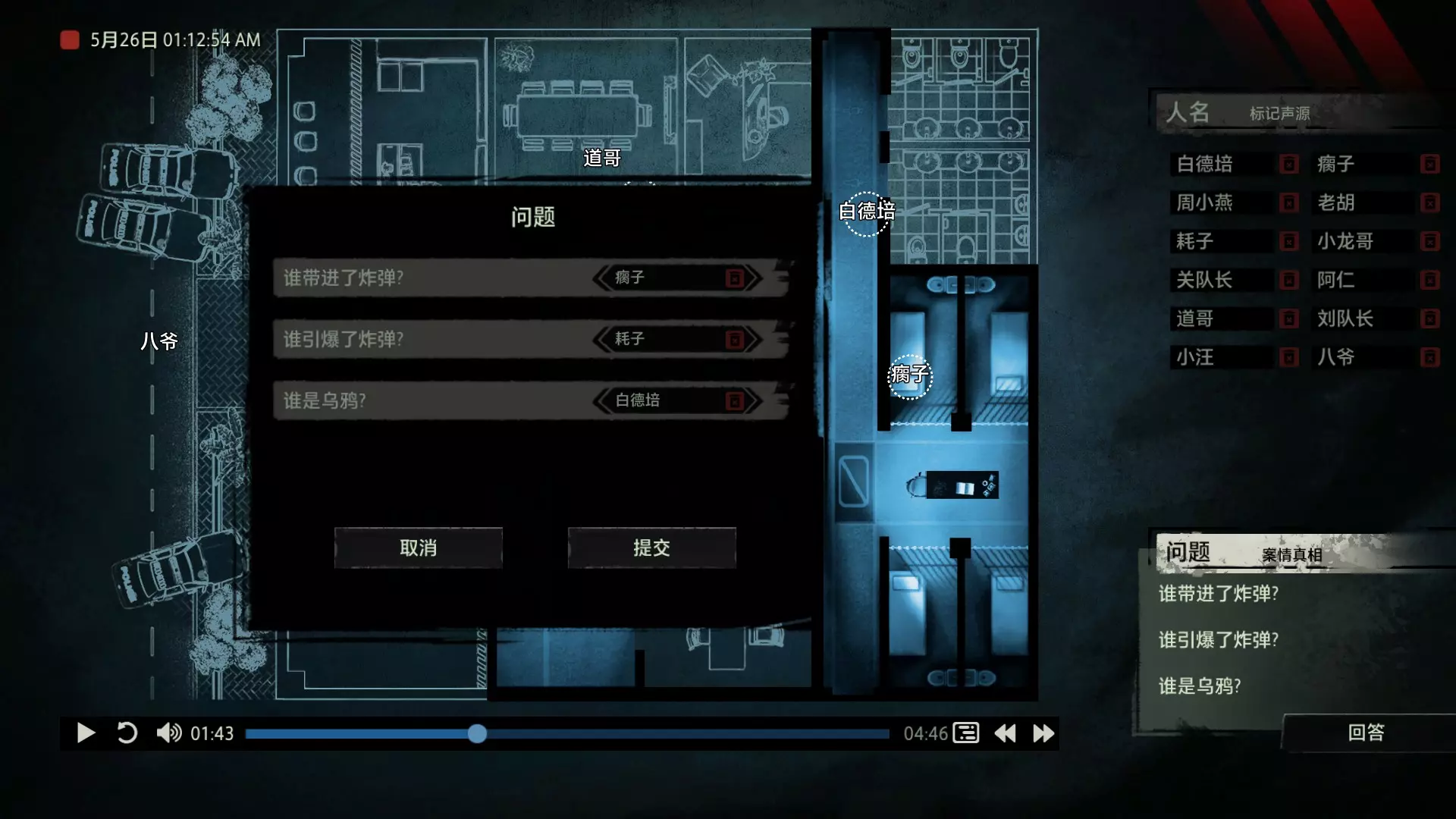 案件中的人物会随着剧情进展而移动到不同的地方,跟随某个人物可以了解到他的一举一动。整个原声音频听上去是连贯的,但可以听到的线索实际上是零碎的。因为录音的收音范围只有一个房间那么大,而地图上却有许多个不同的房间。由于案件过程中时间是平行的,所以想听到同一时间其他人在干什么、说什么,你只能在地图上操控自己前往别的地方。 所以想一次性就了解到案件的全貌是不可能的,听完一遍录音你可能只能收集到某一个人的信息,或者了解到某一个房间发生的事情。想要把故事完整地拼接起来,你得把提供的音频反复听上好几遍,跟随不同的人物,前往不同的地方,最后才能洞悉案件的全貌从而推理出真相。每一个关卡,就是一个案件的谜团,我们需要跟踪几乎全部的人物,从他们的话语里找齐线索和证据,像拼图一样,把每一个板块拼上,来还原案件真相。而有时,要从长达几十分钟的时间里这个人所说过的所有话中甄选出你需要的信息,这无疑是对我们的耐心和细心程度的一种考验。 简单讲,《疑案追声》的玩法可以用下面这个不是公式的公式来表示下:谜团——>全部线索分散在一些关键人物身上——>凑齐全部线索——>真相 关于剧情 以下内容涉及剧透,如想获得原原本本的游戏体验,请不要再往下看 本体第一个故事—双胞胎 双胞胎两兄弟,哥哥是个网红CEO,弟弟是个玩世不恭的富二代。哥哥屡次喝酒打架、寻衅之事被关到派出所时,经常骗警方说自己是弟弟,所有脏水都往弟弟身上泼。而弟弟也一副无所谓的态度,觉得哥哥CEO的形象要维护好,自己担下来没关系。可事情没这么简单!哥哥因为酒驾被抓,在派出所故技重施,骗警方说自己其实是弟弟,然而,警方在哥哥车里发现了毒品!哥哥慌了,承认自己是哥哥的身份,因为欺骗了警方,再加上说不清毒品的来源,弄得自己嫌疑很大。视角来到弟弟这边,对警方坦言,哥哥经常给自己泼脏水,这次因为牵扯毒品,自己不愿意再背黑锅了。然后,在弟弟独处一室,跟外人打电话时,借助声探系统能够听到毒品是弟弟买的,也是弟弟把毒品放进了哥哥的车里,目的就是陷害哥哥,好继承遗产。 本体第二个故事—空画框 有位画家,觉得社会上的艺术风气不好,人们鉴赏艺术品完全靠社会评价的引导,而不是自我的认知。为了尝试改变这种风气,这位画家联合美术馆搞了个活动。画家自己找了个小偷,把自己的画偷走,散播到社会上去,如果谁能从浩如烟海的艺术品市场里找出画家手笔的画作,就说明这是一次美学的回归,活动目的也算达成了。然而,画家的助理动了歪心思,既然都是偷画,干脆自己找人来偷,找幅假画来跟真画掉包,趁机把真画搞到手,卖出去,助理可以赚一笔。活动当天,画家找的小偷A,商人找的小偷B,想买真画的商人,都到位了。秘书在开局电话中说过,她是不过手真品的,所以秘书手里的假画是仿制的赝品(秘书欺骗了想要买画 / 偷画的老总),而老总雇佣的小偷A(也就是开局躲厕所的那个小偷)是高手,在音频开始前早就下手偷到了真画,并且用假画代替了真画。而画家找来的小偷B(找不到展览在哪儿的菜鸡)直接去储藏室拿走了被小偷A丢上去替换的假画。 但是,雇佣小偷A的老总给A打电话时候说到A手里的画是假的(但实际上是真的)导致小偷A以为小偷B手里的画才是真的(小偷A以为还有人比他要早下手)所以小偷A在和小偷B相撞时候趁机掉包了,此时小偷A手里的是假的,小偷B手里的是真的。 然后小偷B逃跑时候直接被保安抓住,真品直接被带回现场。 本体第三个故事—乌鸦 东山市有个黑社会帮派组织,其老大乌鸦特别神秘,没人见过他的长相,因为,乌鸦每赚够一笔钱,就会把小弟们聚集起来,用炸弹一次性炸死。警方盯乌鸦盯了很久了,甚至派警察去帮派内部做卧底。这次,警方判断乌鸦又赚够了一笔钱,到了实施爆炸的时候了,警方想弄清乌鸦的身份并且抓到他。这一天,警方抓住了乌鸦的几个小弟,关在了东山市警察局,询问后得知,这几个小弟要去东山市饭店聚餐,警方判断那里很有可能就是作案地点了。好巧不巧,乌鸦在饭店前踱步,被小偷偷走了两部手机,其中一部是炸弹引爆装置。有位报警的白先生,来到警察局领取自己丢失的手机,领到手机后并没有离开,而是去了警察局的厕所里打电话。帮会里有一位装假肢的小弟,他的腿因为帮乌鸦挡枪被截肢了。乌鸦送了小弟一副假腿,其实就在这一天,趁在聚餐前,这位小弟被乌鸦下药迷倒(瘸子酒量很好,轻易不醉,通关玩家可以去听听小弟同伙的说辞),乌鸦在假腿里放了炸弹。这位小弟是先来的饭店,其余小弟还没来,警方因为得知帮会聚餐,来饭店搜查,抓到了瘸腿小弟,却没看到帮会老大,警方需要把关押的小弟们全部放回去,防止老大起疑心。然而,巧合的是,帮会的小弟们因为各种各样的原因,全部被警方带到了警察局关押,这些应该在饭店被炸死的家伙们,聚集在了一起。他们死里逃生了吗?他们捡回了一条命?做梦!那位来警察局领手机的白先生,拿着手机离开警察局,结果,被警察局门口的小偷偷了手机,小偷想用电话搞诈骗,于是拨通了偷来的诺基亚手机里,唯一的一个电话号码!警方得知了帮会成员们的聚餐时间后,想把他们放回去,免得帮会老大起疑心,破坏了乌鸦的抓捕计划,正当警察们押着小弟们往外走的时候,小弟们面面相觑,他们竟然在警察局集合了!来