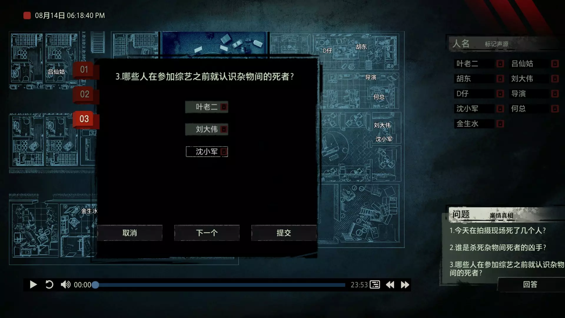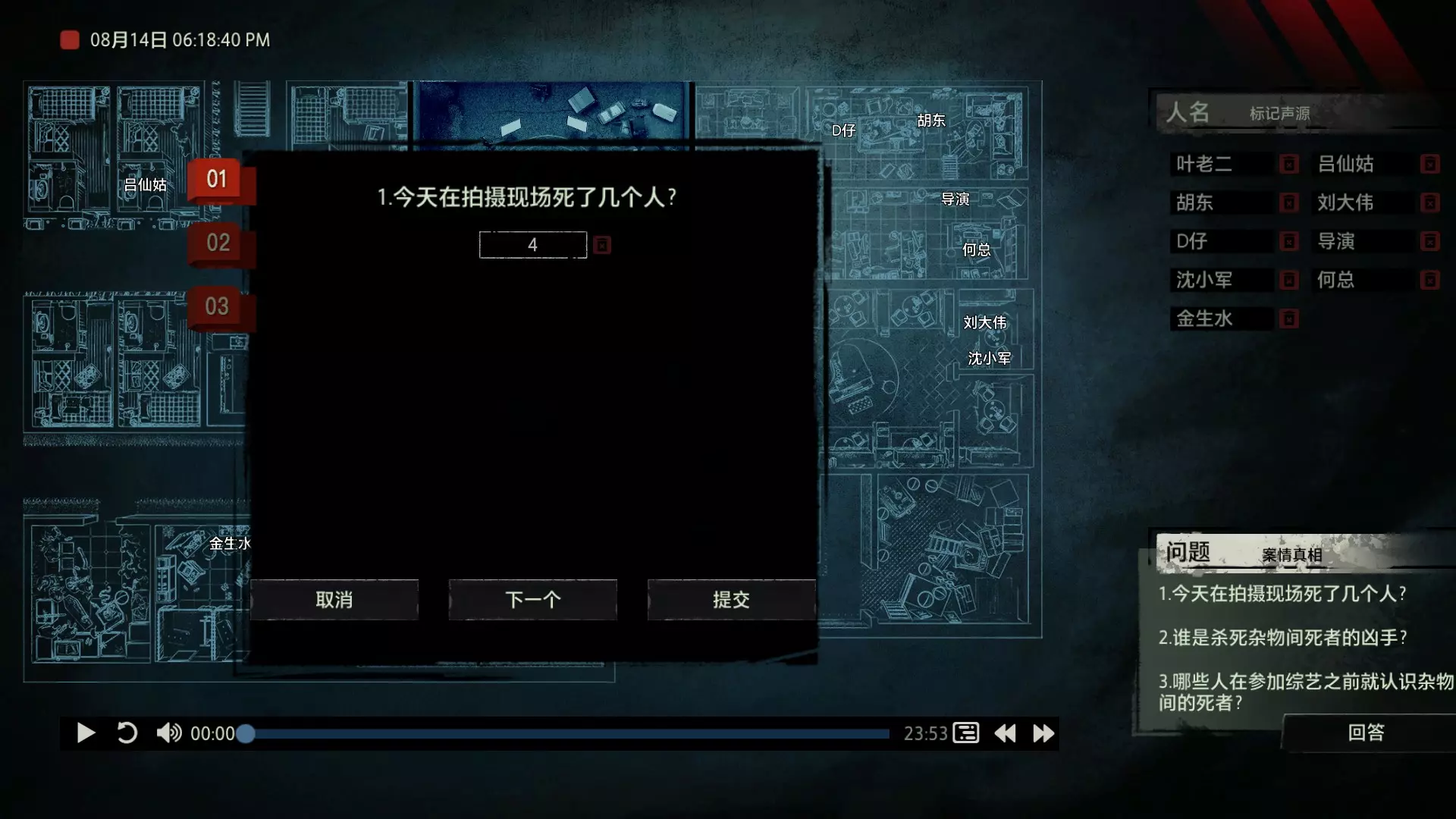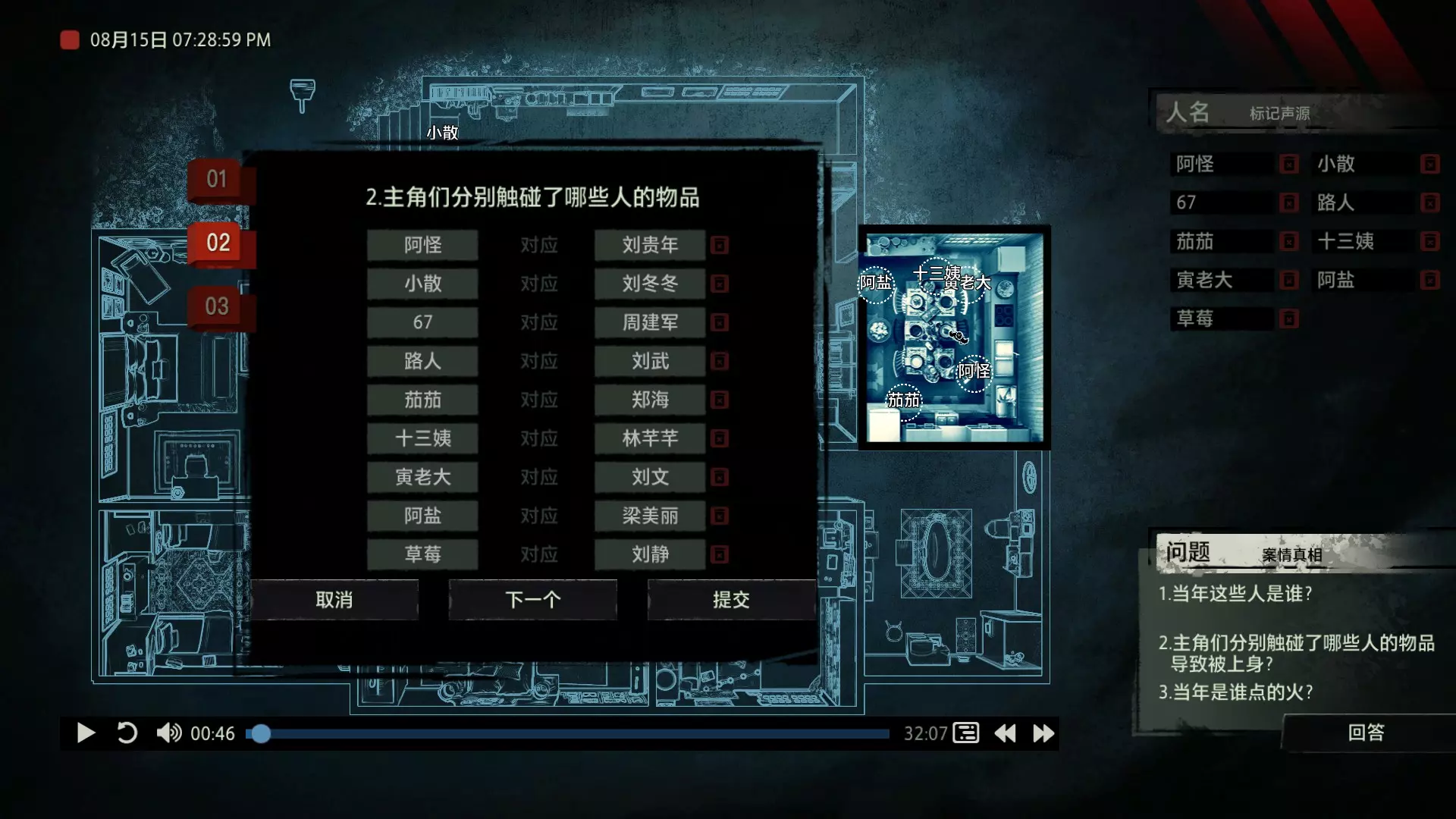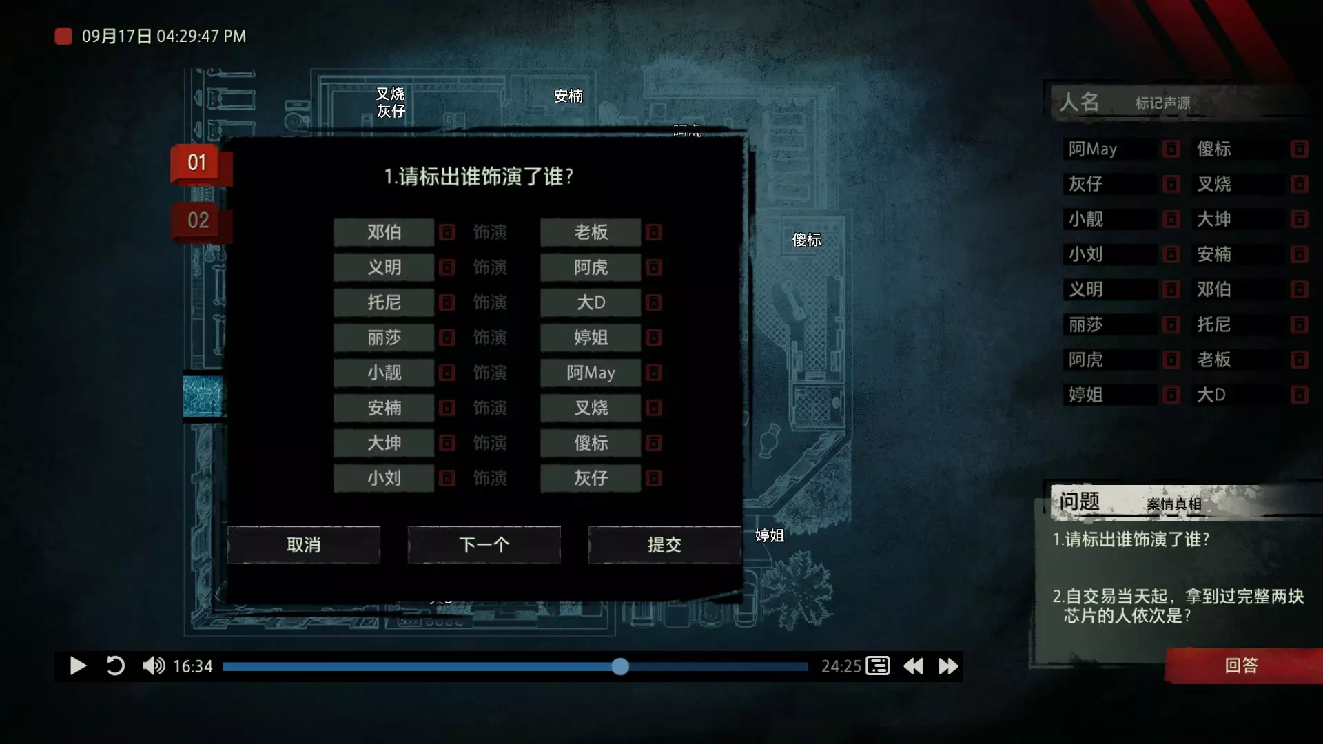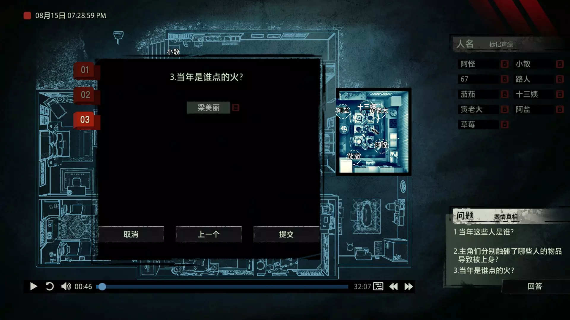 案件中的人物会随着剧情进展而移动到不同的地方,跟随某个人物可以了解到他的一举一动。整个原声音频听上去是连贯的,但可以听到的线索实际上是零碎的。因为录音的收音范围只有一个房间那么大,而地图上却有许多个不同的房间。由于案件过程中时间是平行的,所以想听到同一时间其他人在干什么、说什么,你只能在地图上操控自己前往别的地方。 所以想一次性就了解到案件的全貌是不可能的,听完一遍录音你可能只能收集到某一个人的信息,或者了解到某一个房间发生的事情。想要把故事完整地拼接起来,你得把提供的音频反复听上好几遍,跟随不同的人物,前往不同的地方,最后才能洞悉案件的全貌从而推理出真相。每一个关卡,就是一个案件的谜团,我们需要跟踪几乎全部的人物,从他们的话语里找齐线索和证据,像拼图一样,把每一个板块拼上,来还原案件真相。而有时,要从长达几十分钟的时间里这个人所说过的所有话中甄选出你需要的信息,这无疑是对我们的耐心和细心程度的一种考验。 简单讲,《疑案追声》的玩法可以用下面这个不是公式的公式来表示下:谜团——>全部线索分散在一些关键人物身上——>凑齐全部线索——>真相 关于剧情 以下内容涉及剧透,如想获得原原本本的游戏体验,请不要再往下看 本体第一个故事—双胞胎 双胞胎两兄弟,哥哥是个网红CEO,弟弟是个玩世不恭的富二代。哥哥屡次喝酒打架、寻衅之事被关到派出所时,经常骗警方说自己是弟弟,所有脏水都往弟弟身上泼。而弟弟也一副无所谓的态度,觉得哥哥CEO的形象要维护好,自己担下来没关系。可事情没这么简单!哥哥因为酒驾被抓,在派出所故技重施,骗警方说自己其实是弟弟,然而,警方在哥哥车里发现了毒品!哥哥慌了,承认自己是哥哥的身份,因为欺骗了警方,再加上说不清毒品的来源,弄得自己嫌疑很大。视角来到弟弟这边,对警方坦言,哥哥经常给自己泼脏水,这次因为牵扯毒品,自己不愿意再背黑锅了。然后,在弟弟独处一室,跟外人打电话时,借助声探系统能够听到毒品是弟弟买的,也是弟弟把毒品放进了哥哥的车里,目的就是陷害哥哥,好继承遗产。 本体第二个故事—空画框 有位画家,觉得社会上的艺术风气不好,人们鉴赏艺术品完全靠社会评价的引导,而不是自我的认知。为了尝试改变这种风气,这位画家联合美术馆搞了个活动。画家自己找了个小偷,把自己的画偷走,散播到社会上去,如果谁能从浩如烟海的艺术品市场里找出画家手笔的画作,就说明这是一次美学的回归,活动目的也算达成了。然而,画家的助理动了歪心思,既然都是偷画,干脆自己找人来偷,找幅假画来跟真画掉包,趁机把真画搞到手,卖出去,助理可以赚一笔。活动当天,画家找的小偷A,商人找的小偷B,想买真画的商人,都到位了。秘书在开局电话中说过,她是不过手真品的,所以秘书手里的假画是仿制的赝品(秘书欺骗了想要买画 / 偷画的老总),而老总雇佣的小偷A(也就是开局躲厕所的那个小偷)是高手,在音频开始前早就下手偷到了真画,并且用假画代替了真画。而画家找来的小偷B(找不到展览在哪儿的菜鸡)直接去储藏室拿走了被小偷A丢上去替换的假画。 但是,雇佣小偷A的老总给A打电话时候说到A手里的画是假的(但实际上是真的)导致小偷A以为小偷B手里的画才是真的(小偷A以为还有人比他要早下手)所以小偷A在和小偷B相撞时候趁机掉包了,此时小偷A手里的是假的,小偷B手里的是真的。 然后小偷B逃跑时候直接被保安抓住,真品直接被带回现场。 本体第三个故事—乌鸦 东山市有个黑社会帮派组织,其老大乌鸦特别神秘,没人见过他的长相,因为,乌鸦每赚够一笔钱,就会把小弟们聚集起来,用炸弹一次性炸死。警方盯乌鸦盯了很久了,甚至派警察去帮派内部做卧底。这次,警方判断乌鸦又赚够了一笔钱,到了实施爆炸的时候了,警方想弄清乌鸦的身份并且抓到他。这一天,警方抓住了乌鸦的几个小弟,关在了东山市警察局,询问后得知,这几个小弟要去东山市饭店聚餐,警方判断那里很有可能就是作案地点了。好巧不巧,乌鸦在饭店前踱步,被小偷偷走了两部手机,其中一部是炸弹引爆装置。有位报警的白先生,来到警察局领取自己丢失的手机,领到手机后并没有离开,而是去了警察局的厕所里打电话。帮会里有一位装假肢的小弟,他的腿因为帮乌鸦挡枪被截肢了。乌鸦送了小弟一副假腿,其实就在这一天,趁在聚餐前,这位小弟被乌鸦下药迷倒(瘸子酒量很好,轻易不醉,通关玩家可以去听听小弟同伙的说辞),乌鸦在假腿里放了炸弹。这位小弟是先来的饭店,其余小弟还没来,警方因为得知帮会聚餐,来饭店搜查,抓到了瘸腿小弟,却没看到帮会老大,警方需要把关押的小弟们全部放回去,防止老大起疑心。然而,巧合的是,帮会的小弟们因为各种各样的原因,全部被警方带到了警察局关押,这些应该在饭店被炸死的家伙们,聚集在了一起。他们死里逃生了吗?他们捡回了一条命?做梦!那位来警察局领手机的白先生,拿着手机离开警察局,结果,被警察局门口的小偷偷了手机,小偷想用电话搞诈骗,于是拨通了偷来的诺基亚手机里,唯一的一个电话号码!警方得知了帮会成员们的聚餐时间后,想把他们放回去,免得帮会老大起疑心,破坏了乌鸦的抓捕计划,正当警察们押着小弟们往外走的时候,小弟们面面相觑,他们竟然在警察局集合了!来