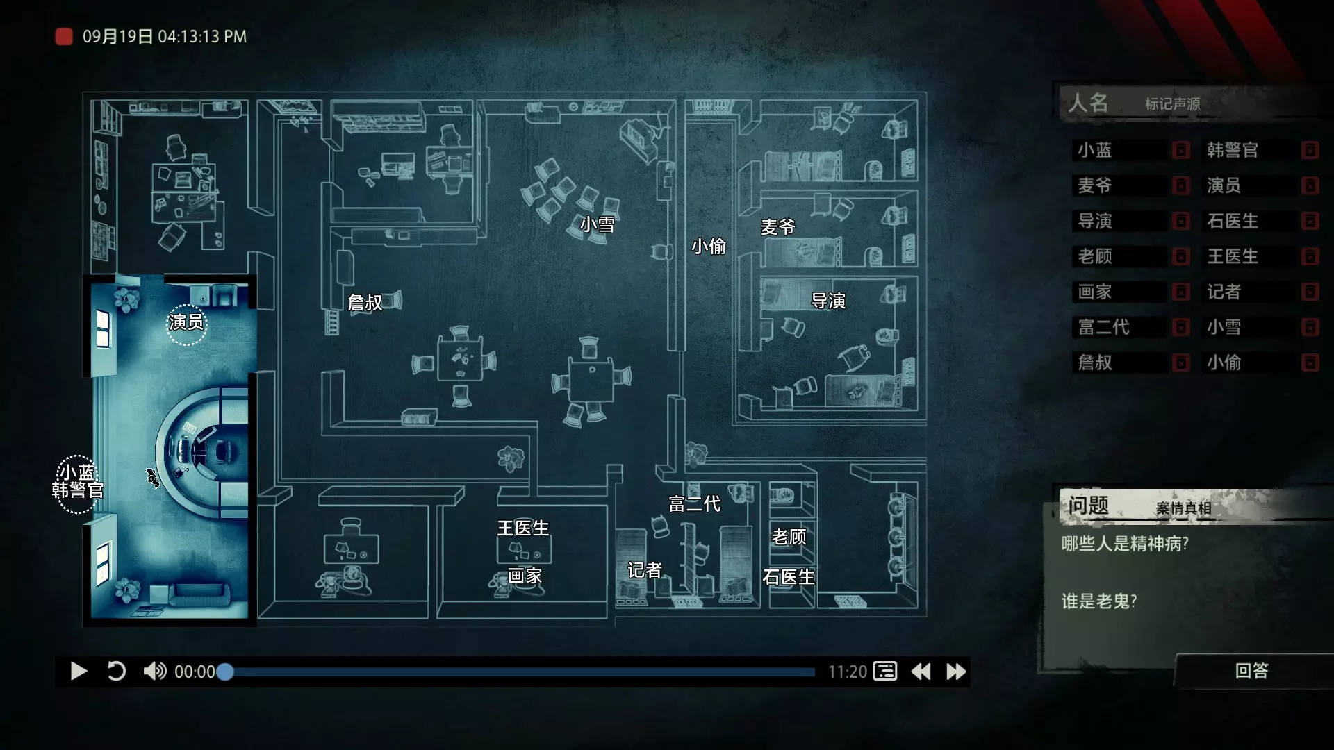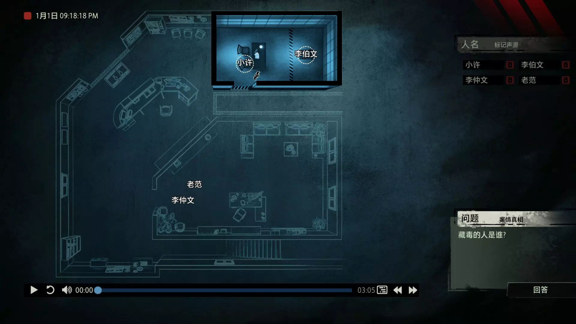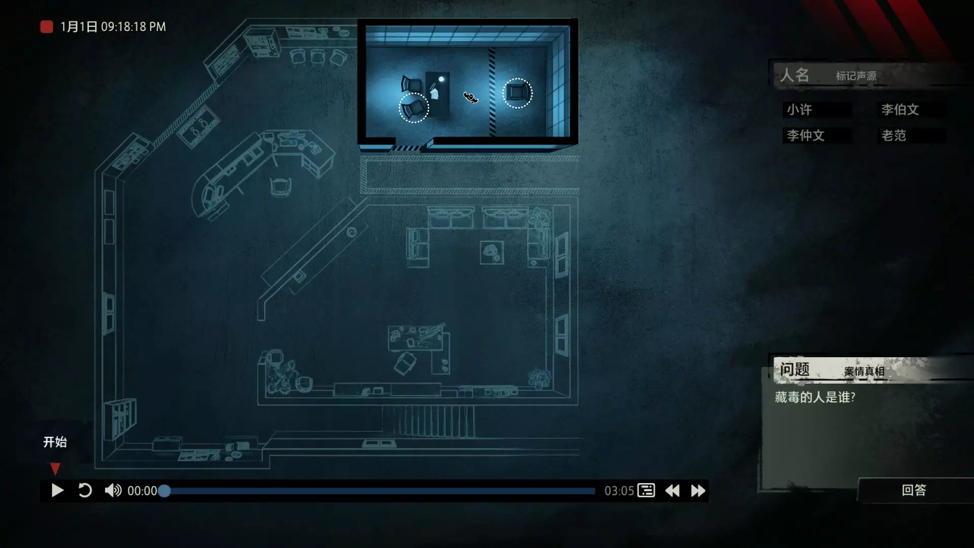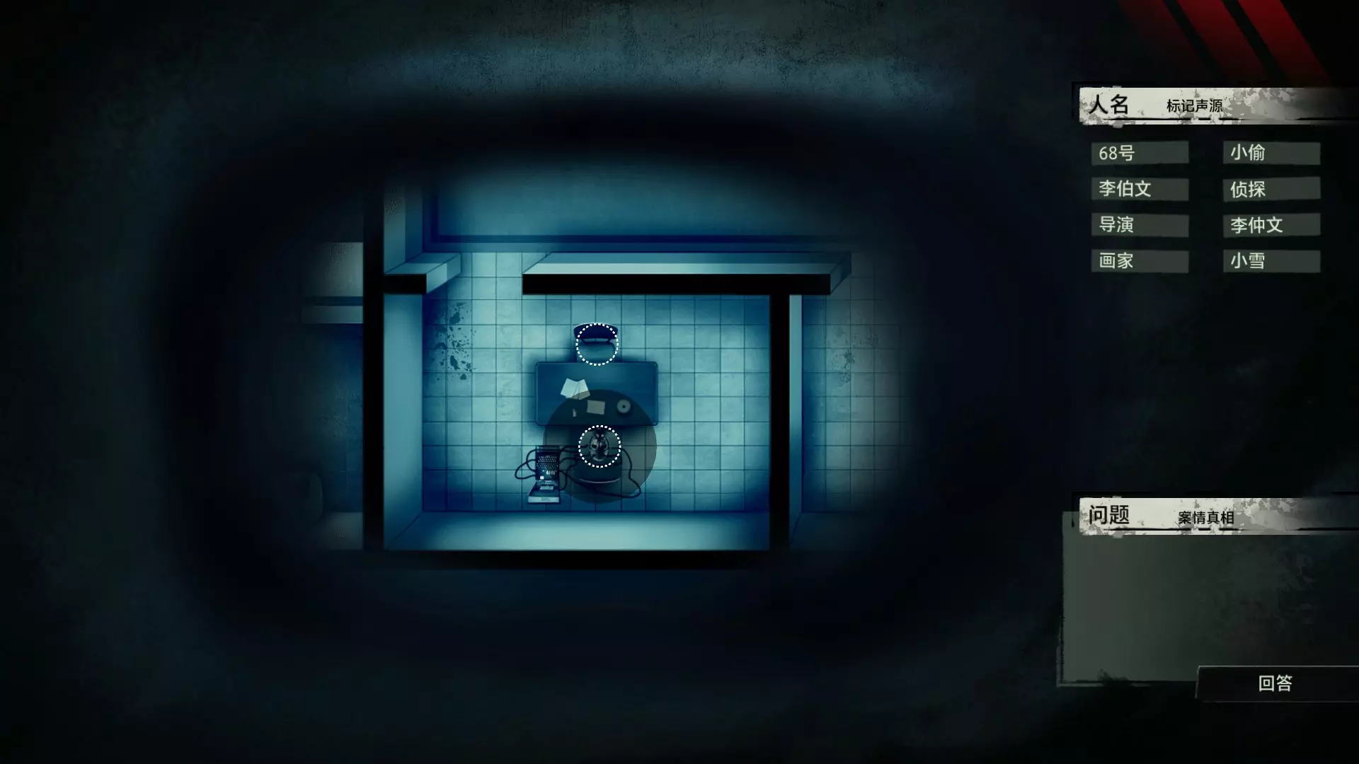 在诸多门类的刑侦学之中,“语言刑侦学”占有其独特的地位。在《“语言刑侦学”学科的理论基础与应用价值》这篇文章中,提到了这样一段话:“按照功能语言学的观点来看,语言无时无刻不在反映人类的内心世界,我们认识的世界是通过语言来实现的。窥探大脑深处的秘密,至少现在需要通过语言这扇窗户来进行。” 而声音,毋庸置疑是传达语言的最重要介质。也正因此,对声音证物的研究与分析成为了获取案件真相的必要手段之一。那么从众多的嘈杂声音中找出真相,是一段怎样曲折而充满挑战的过程呢? 说起侦探题材的游戏,探索和收集可以说是基本元素。我们需要用自己的脚走遍案件的相关地点,寻找散落在犄角旮旯的线索,反复核实嫌疑人的证词找出矛盾,最后揭露真相。例如经典的【福尔摩斯系列】,其中【福尔摩斯:罪与罚】对于喜欢推理的玩家来说,肯定能带来良好的游戏体验。 而本作无疑将犯罪语言学运用得淋漓尽致,在玩法上进行了创新,甚至可以说是另辟蹊径。游戏中的场景没有太多颜色,甚至没有出现过一张完整的人脸。它将所有重点放在了声音上,需要我们一遍又一遍地用耳朵来聆听真相。玩家只需在游戏开始前戴上耳机或打开音箱,然后成为一名“声探”。关于玩法 玩法上没有那么玄乎,这是一个在游玩形式上花了不少心思的游戏,说白了,跟你看电影看小说类似,只不过用游戏【追声】的形式让你坐在电脑前体验了一把。游戏中我们扮演的声探是以上帝视角回归到案发现场的。开始破案前我们会从IPAD上看到一张案发现场的平面图。案件会像舞台剧一样向玩家展开。而底下这段音频的进度条就是整个案件的原声音频,记录了案发过程中所有相关人员说过的话。我们首先要做的是根据不同的声音,声源分别确定说话人物的身份,标记声源。