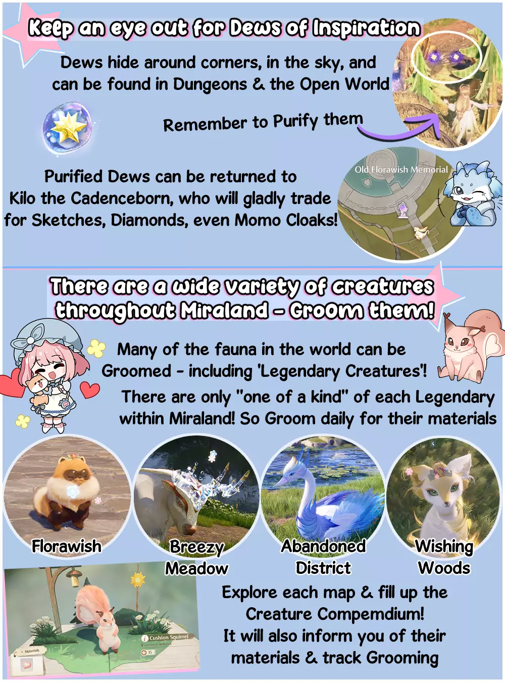 灵感露珠遍布奇迹大陆各处。无论高处、低处,甚至就在拐角处,都能找到它们!收集灵感露珠可以为节奏之子基洛积蓄能量,他会用制作配方、钻石、材料,甚至莫莫斗篷作为奖励! 照料是获取制作材料的绝佳途径。每个区域都有各种各样的生物——你也可以查看生物图鉴来记录照料它们的次数! 此外,还有少量“传奇生物”——这些生物在奇迹大陆上独一无二。这意味着你每天只能照料它们一次,以此积累资源。关于寻找和应对这些生物的额外提示——如果需要更详细的寻找位置和梳理方法提示,请查看下方剧透内容: 比布浣熊——可在弗洛拉维什镇的比布浣熊欢笑俱乐部前方找到。梳理后,它们会可爱地跟在你身边玩耍。 布尔奎特——位于微风草地内——你需要同时拥有捕虫能力和梳理能力。布尔奎特会被虫子激怒——先把虫子赶走!通常有3只。待生物平静下来后,你就可以从容地梳理它们了。 星界天鹅——位于废弃区的星辰渔场。完成由好奇普利尼发布的任务后解锁,该任务位于星辰渔场山顶附近,名为【翱翔星空】。完成最终任务目标时,需装备滑翔能力并在星界天鹅旁使用,以触发过场动画。任务完成后,天鹅每日均可互动! 黎明狐——这只美丽的金色生物位于许愿森林。开始时需装备缩小能力服装靠近,然后迅速切换到梳理能力并点击!若不慎惊吓到它们,需重新装备缩小能力服装,等待它们恢复好奇并离开巢穴。梳理后还可以与它们玩耍。 最大化能量使用