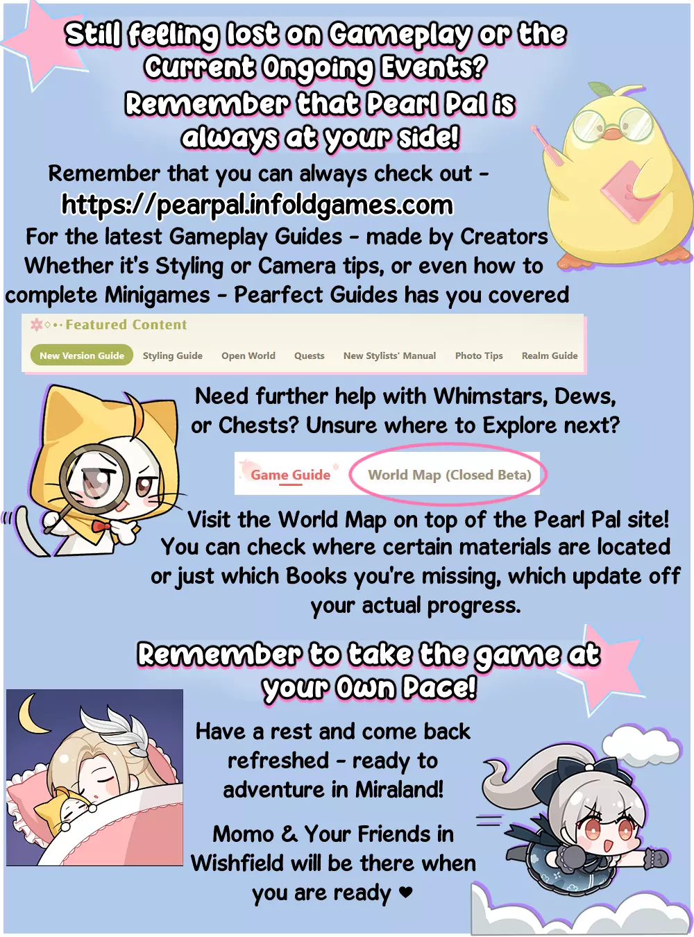 如果你在当前活动、故事任务、奇迹皇冠等方面遇到困难,可以访问Pearfect-Pal网站。Pear Pal和Pearfect Guides团队会在你的旅程中为你提供支持。如果你在幻光星、灵感之露、宝箱或类似内容上遇到困难,可以查看Pearl Pal网站顶部的世界地图。同步你的游戏进度,就能知道接下来该去哪里探索获取更多奖励了。 请始终记住,按照自己的节奏游玩游戏!这不是一场比赛。慢慢来,尽情探索,经常休息以避免疲劳。暖暖和大喵随时准备好与你一起,设计师!
