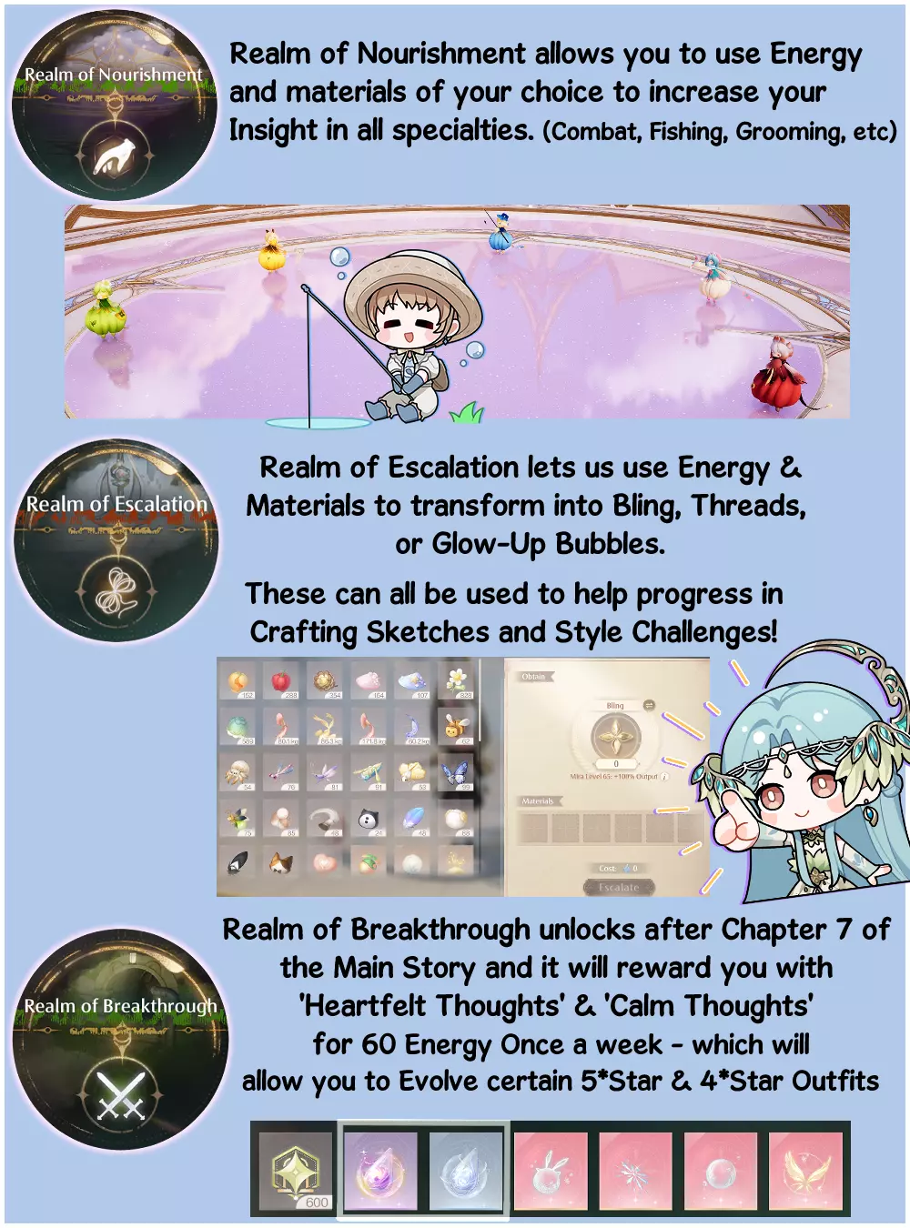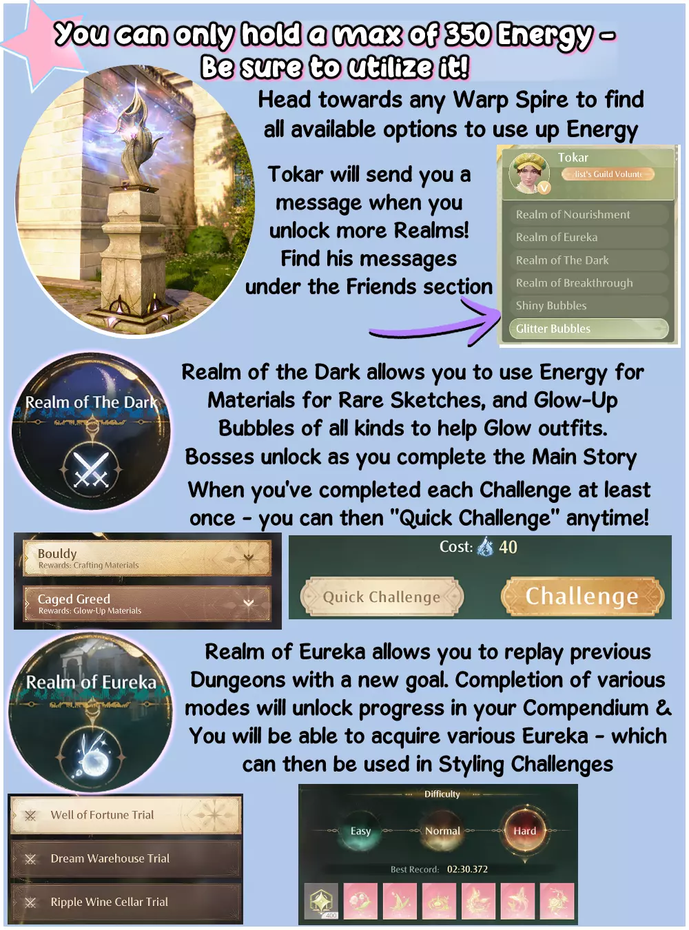 造型师一次最多可持有350点能量,所以记得前往传送尖塔,以获取所有能最佳利用能量的选项。 黑暗领域 你有机会重新挑战故事任务中的Boss,甚至是它们的新版本!这是为了获取制作材料或焕彩泡泡材料。 一定要留意它们的攻击模式并击败它们!完成挑战后,你可以使用【快速挑战】按钮自动消耗你拥有的任意数量能量,以快速完成挑战并获得更多材料。这与其他游戏中的“扫荡”机制类似。 灵感领域 在灵感领域中,你可以挑战过往的地下城,并完成全新的收集目标!这些版本将帮助你解锁灵感,灵感在你的造型挑战中至关重要。还有相关的限时进阶课程,完成后将帮助你赚取更多钻石! 滋养领域: 滋养领域是帮助【无限之心 - 许愿之地】发展的绝佳途径,因为在其发展的早期和后期阶段,都需要将【洞察力】提升到特定等级,才能在执行【梳理】【钓鱼】等能力时解锁更多【被动技能】。 升级领域: 该领域允许我们消耗能量来获取更多【闪耀币】【线团】和【焕彩气泡】!【闪耀币】可用于从NPC处购买物品、【无限之心】升级、【 crafting(制作)】以及【惊喜扭蛋机】。【线团】用于【 crafting(制作)】,也可在特定商店作为货币使用。【焕彩气泡】能让我们升级服装属性,以应对更困难的【装扮挑战】。突破领域 该内容将在主线剧情第7章后解锁,允许你重新挑战主线Boss。击败一次后,将解锁【快速挑战】功能——类似于暗影领域。这会解锁用于进化4星能力服装和通过剧情解锁的5星服装的材料。