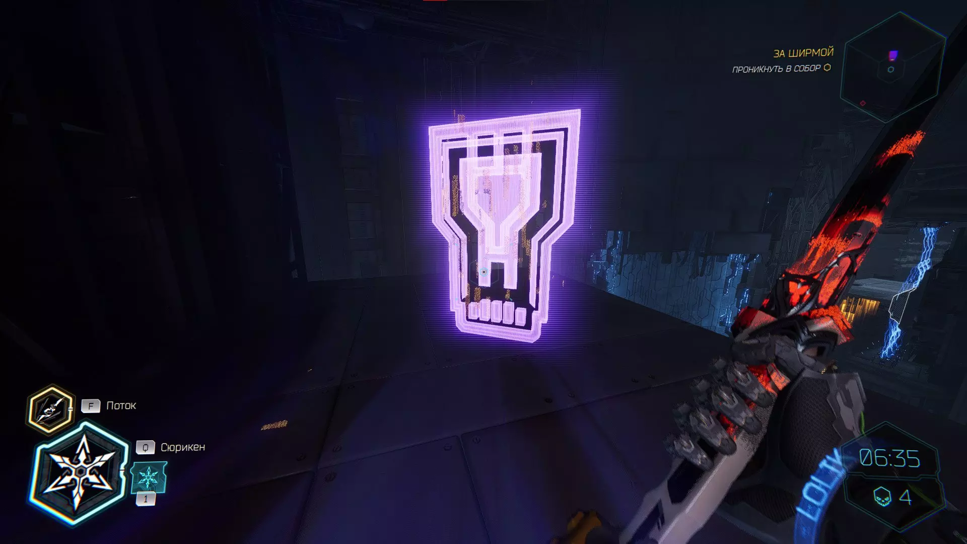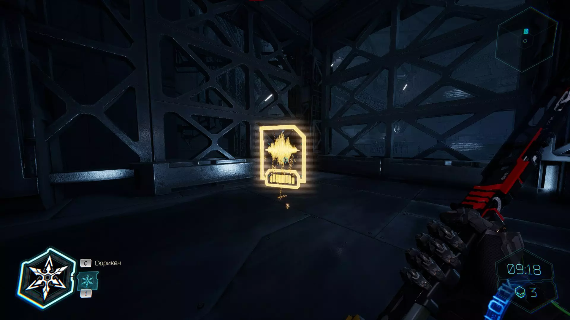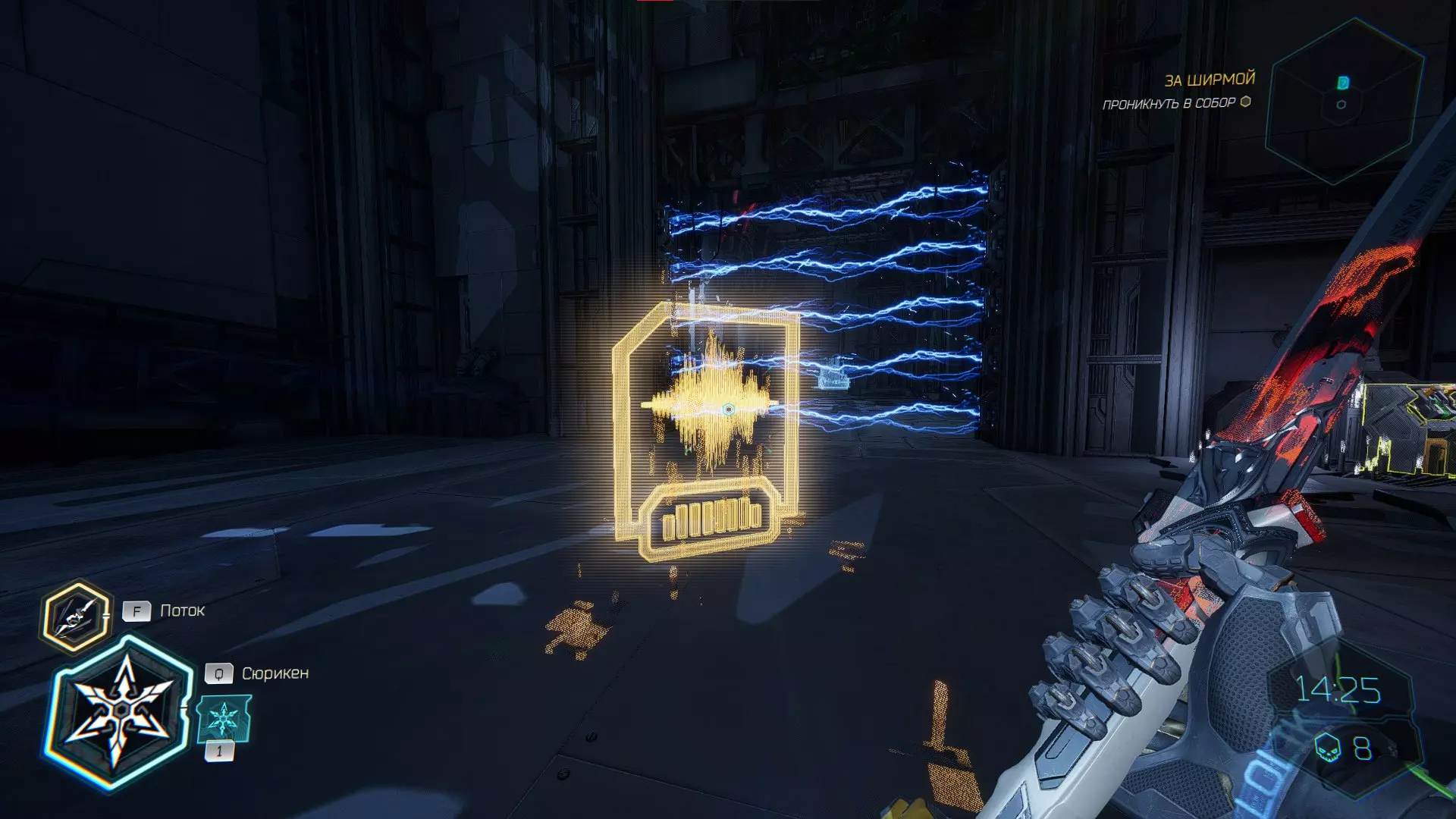 走向下一个终端时,你会穿过一扇门。要打开这扇门,你必须将手里剑扔向门上方的电气面板。进入平台后,向左走会看到一个格栅,打破它,小心穿过激光,然后拾取神器。 在屏障后面