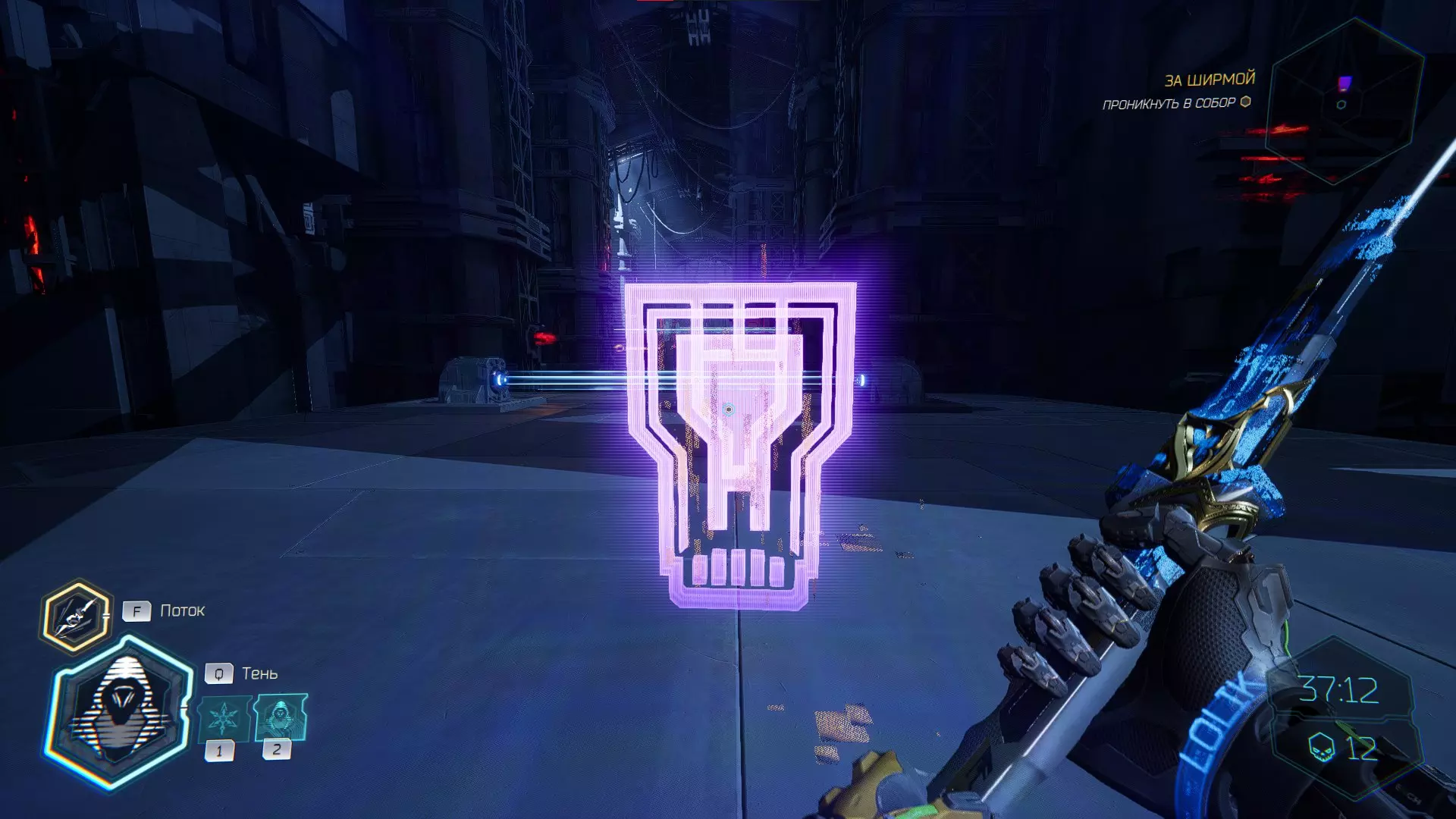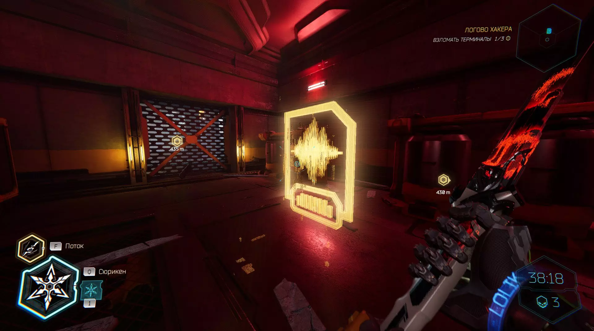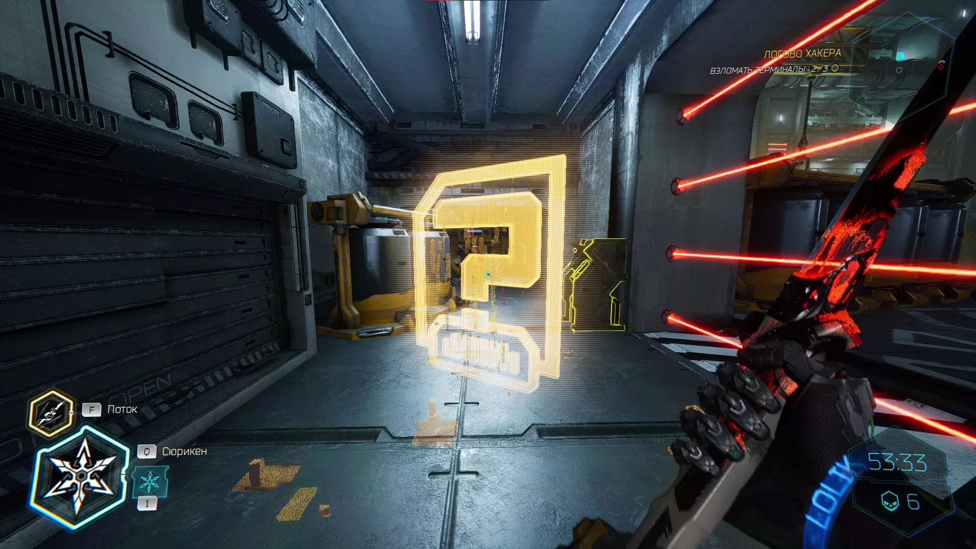 走向下一个终端时,你会穿过一扇门。要打开这扇门,你必须将手里剑扔向门上方的电气面板。进入平台后,向左走会看到一个格栅,打破它,小心穿过激光,然后拾取神器。 在屏障后面