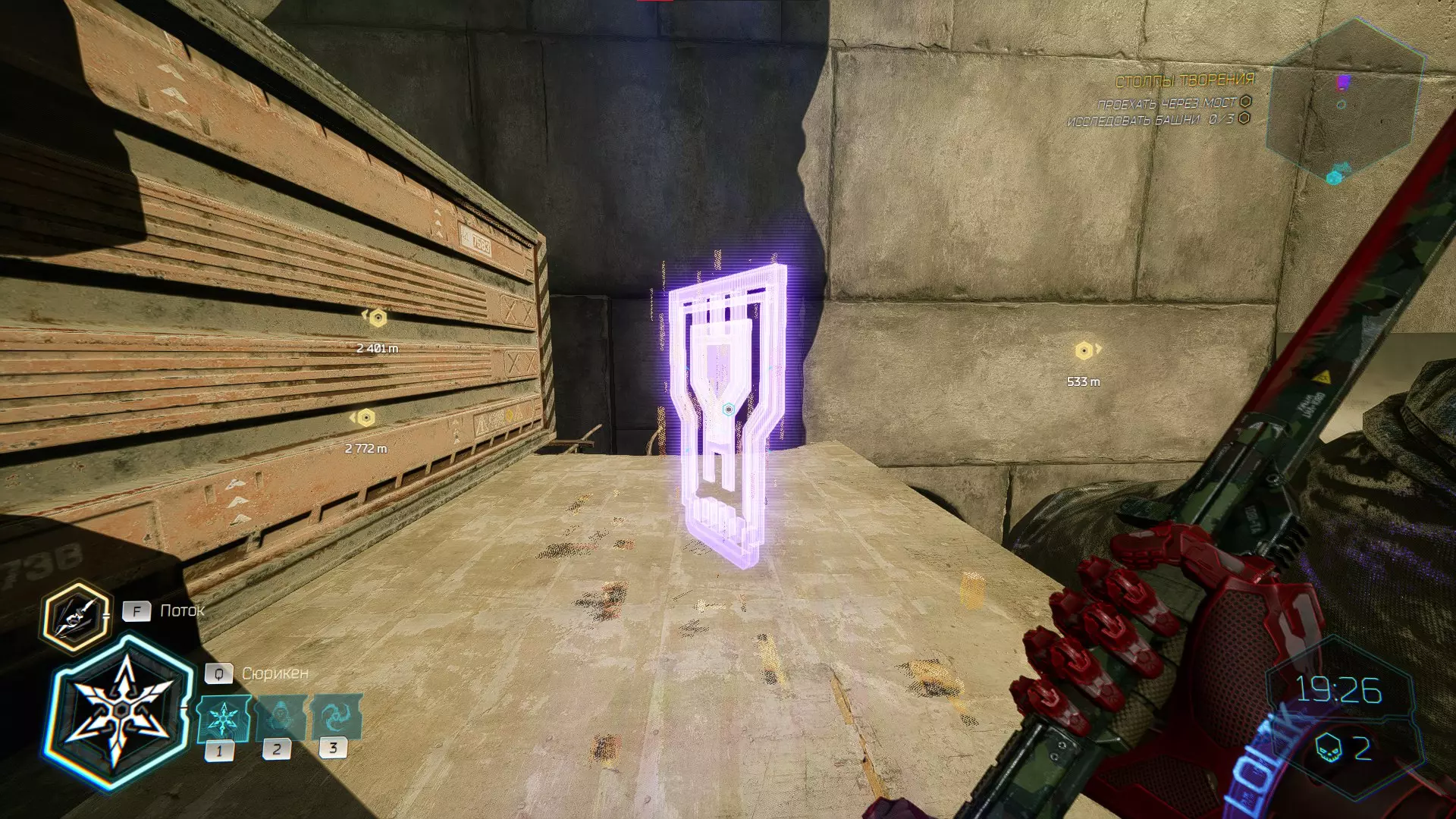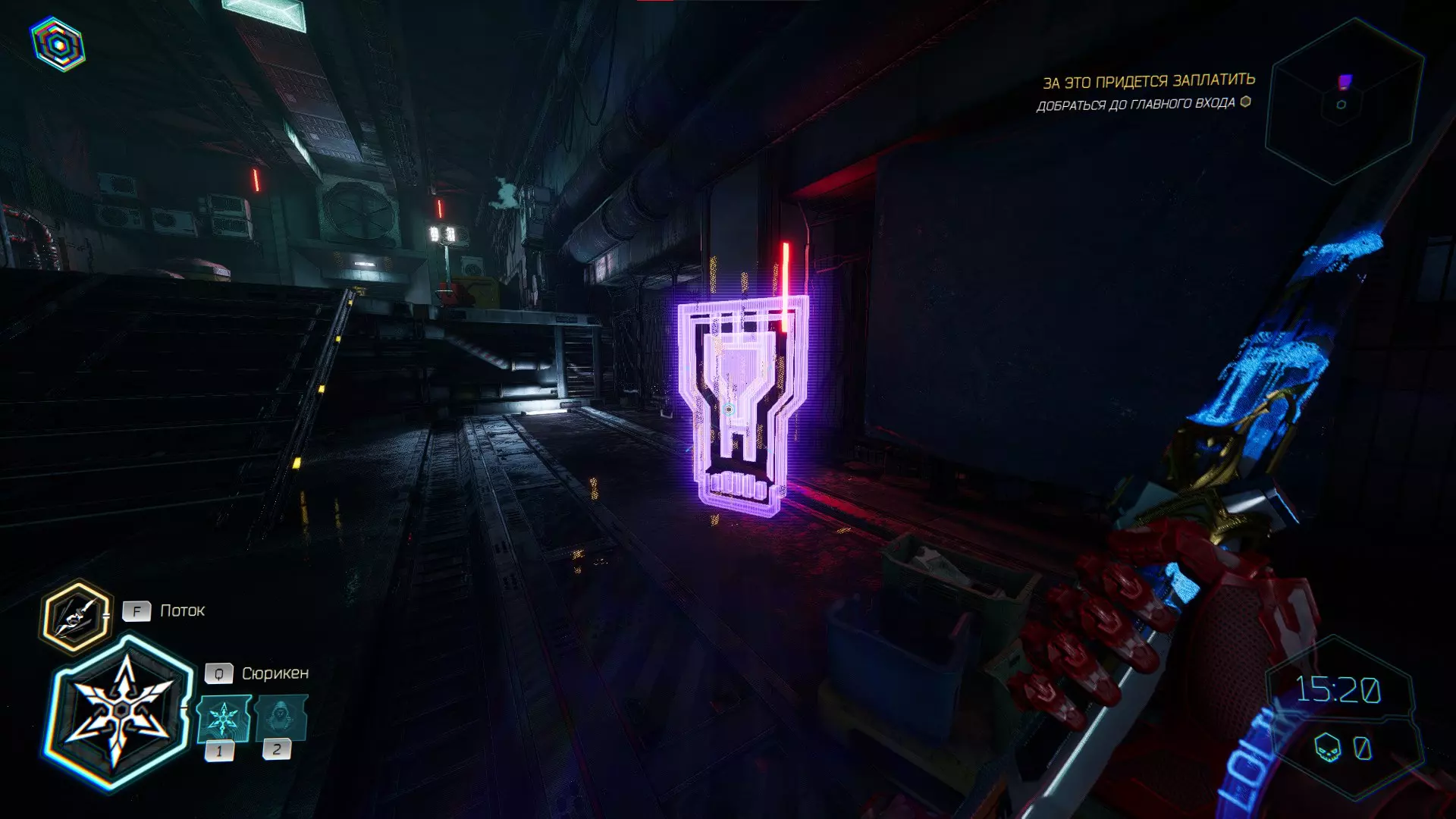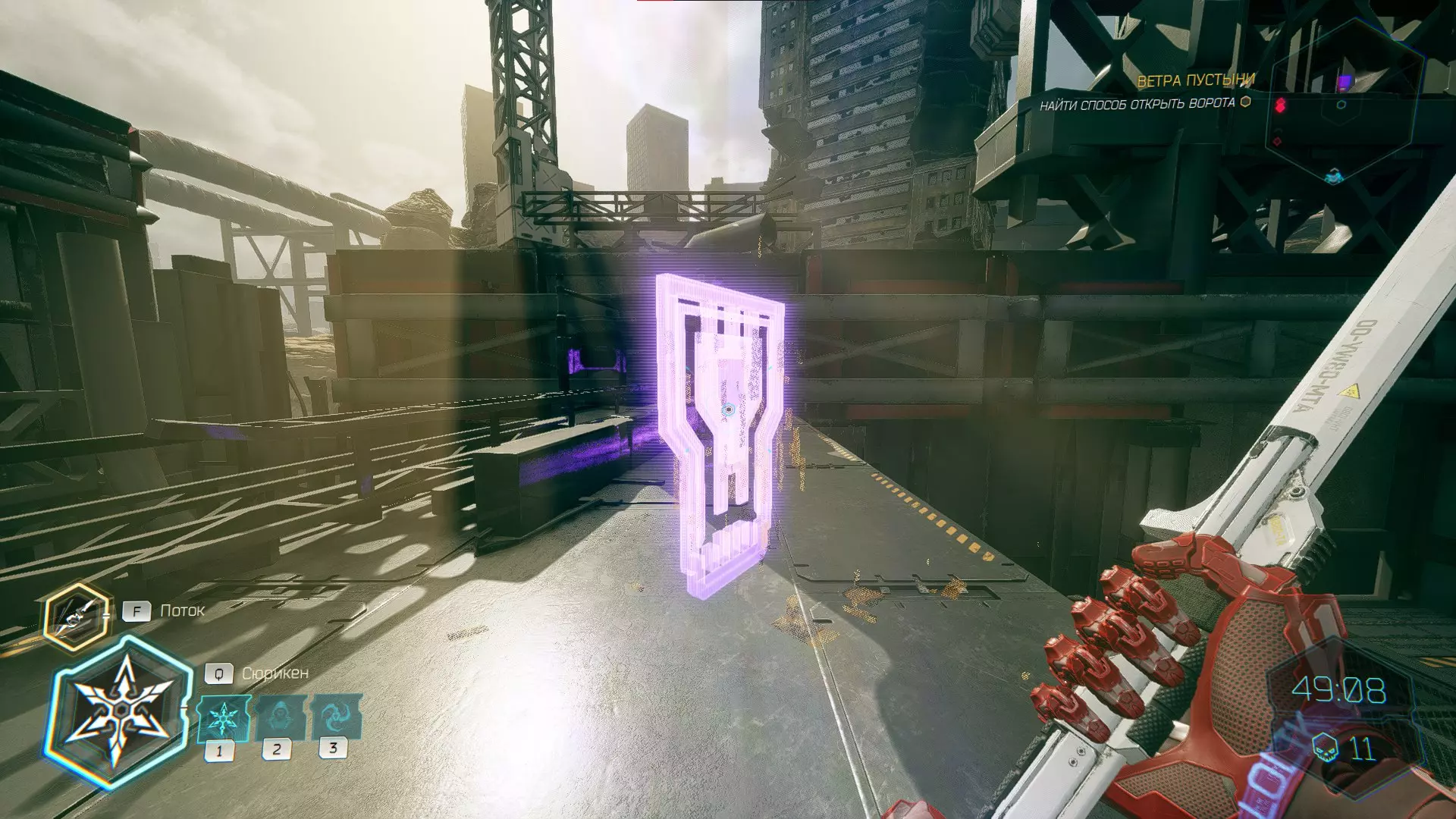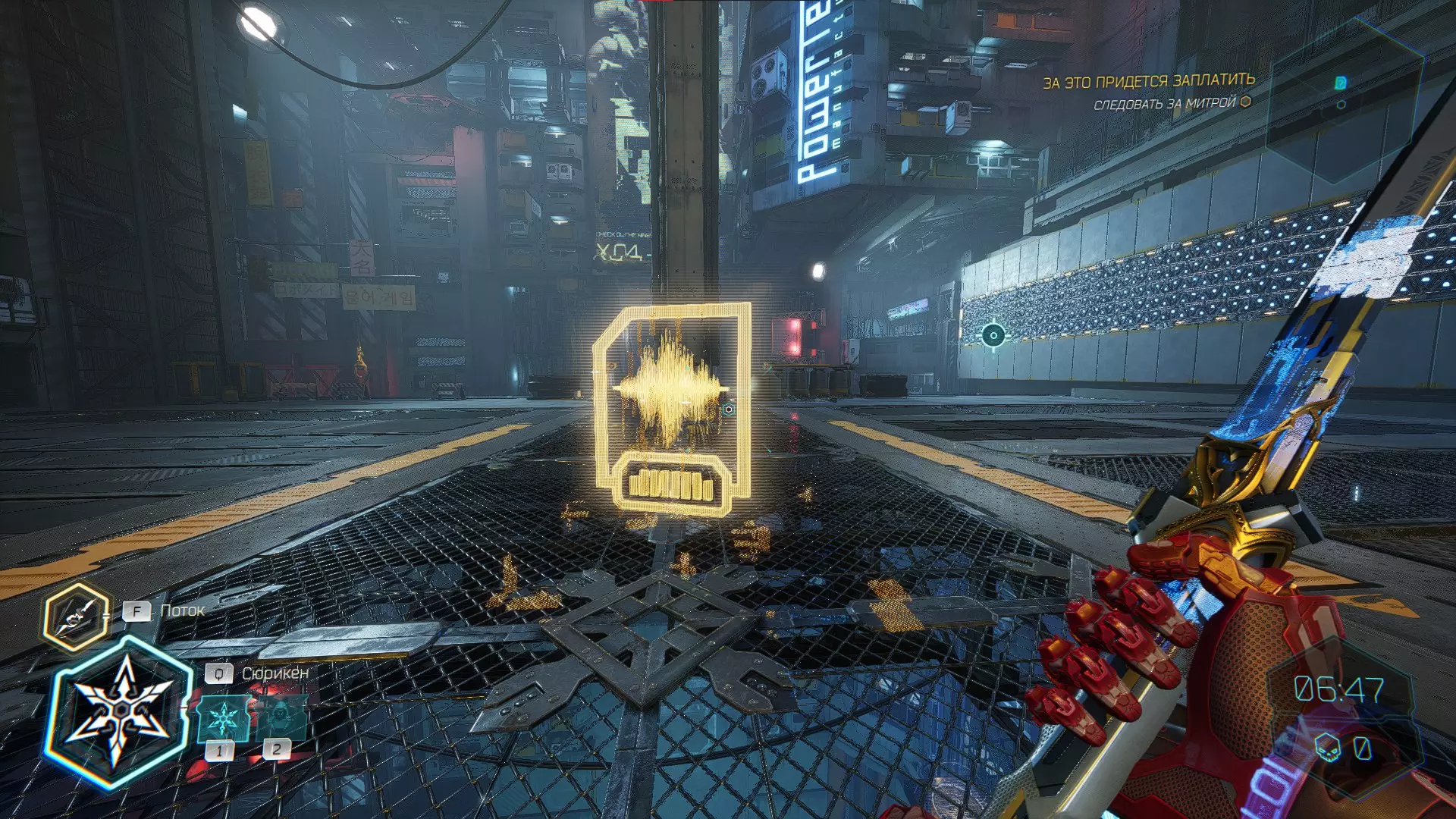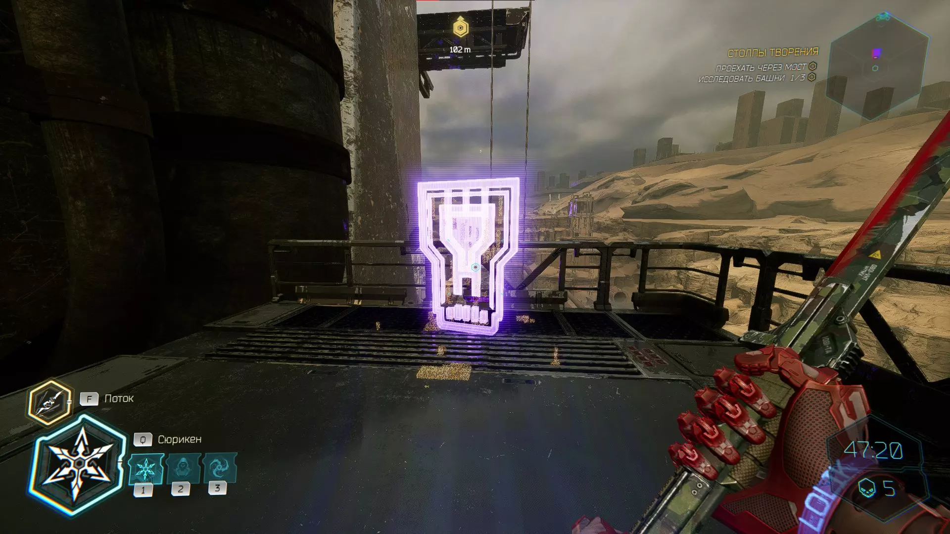 继续前进。飞到桥上,左上方会有一面墙,需要向墙投掷手里剑,以便吸附到平台上。对面会有另一个带有模块的小平台,飞到上面并拾取强化道具。 隐藏挑战【赛跑】:穿过所有数据传送门。