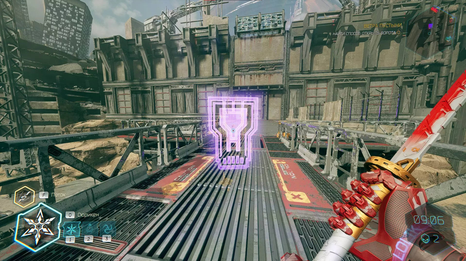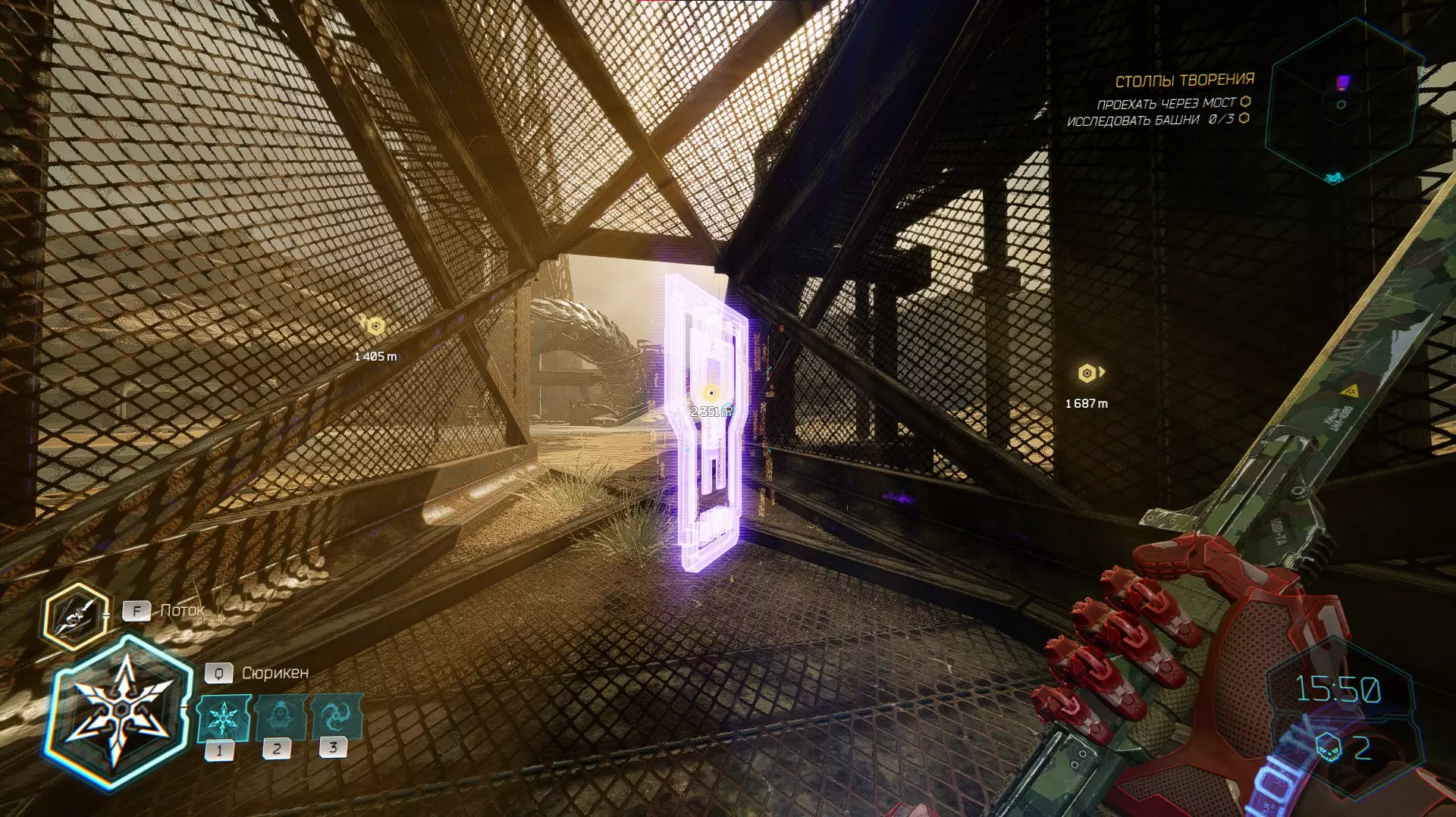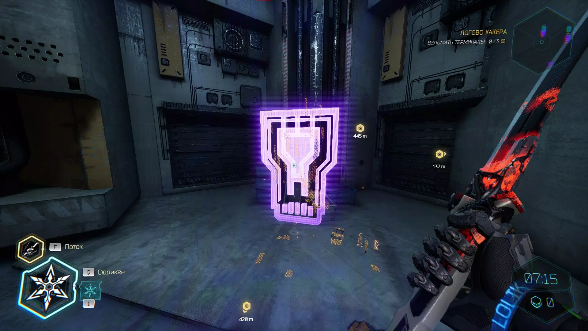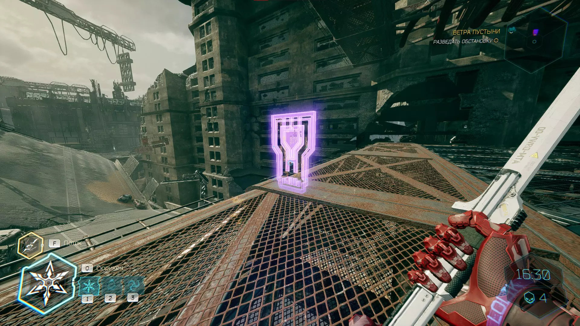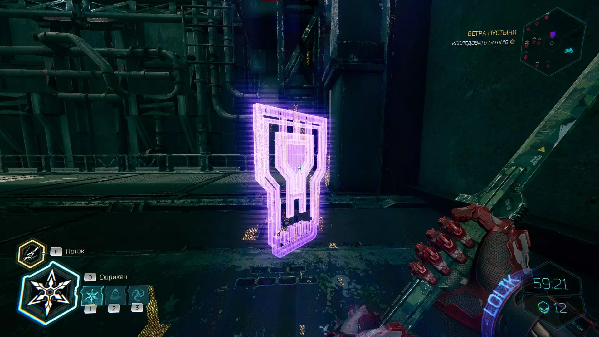 继续前进。飞到桥上,左上方会有一面墙,需要向墙投掷手里剑,以便吸附到平台上。对面会有另一个带有模块的小平台,飞到上面并拾取强化道具。 隐藏挑战【赛跑】:穿过所有数据传送门。