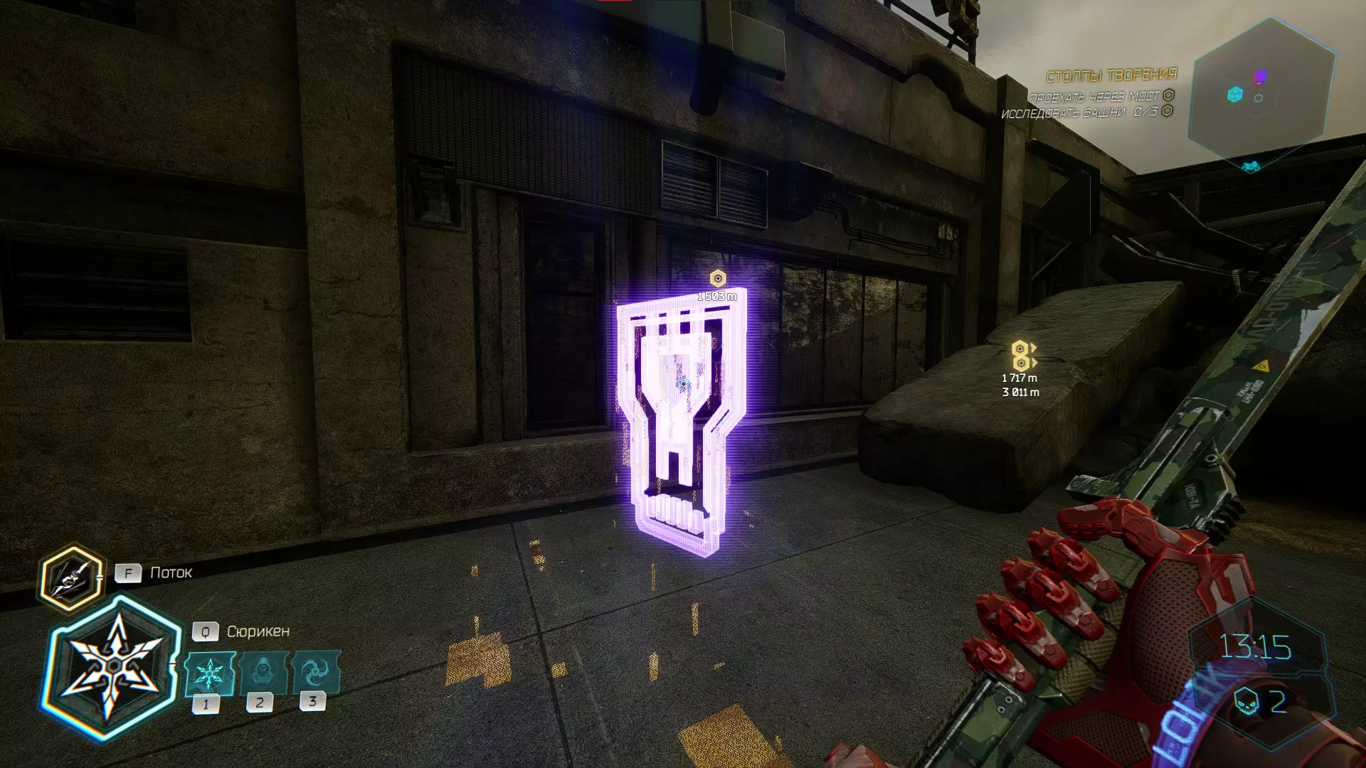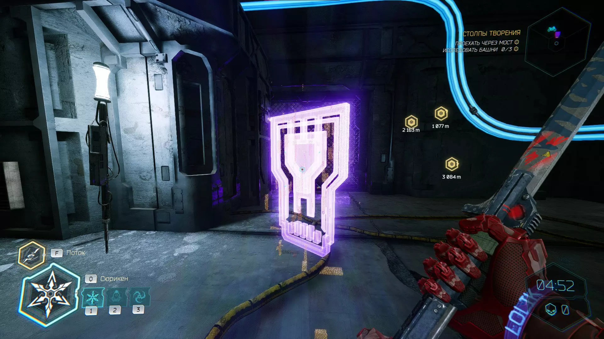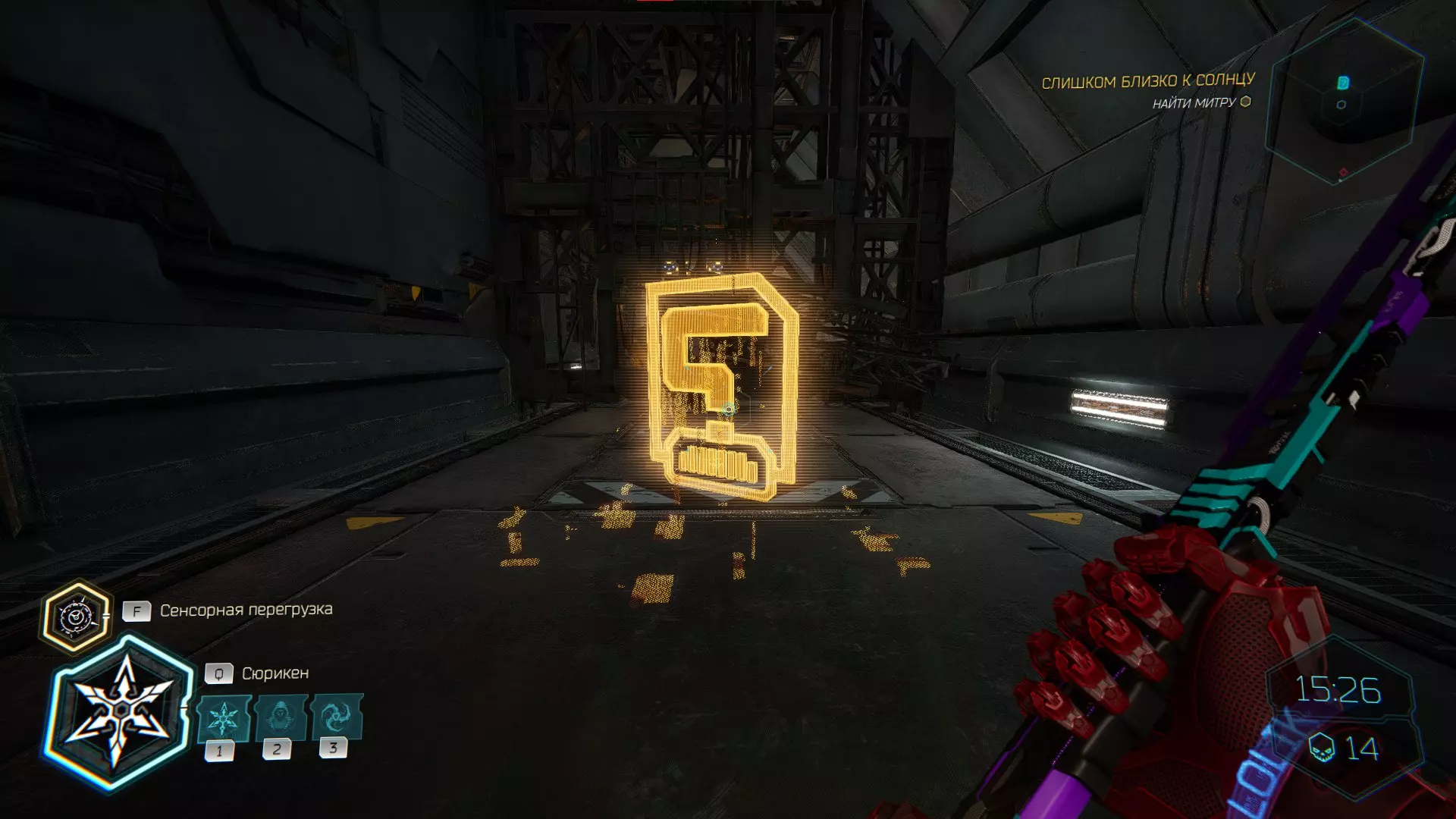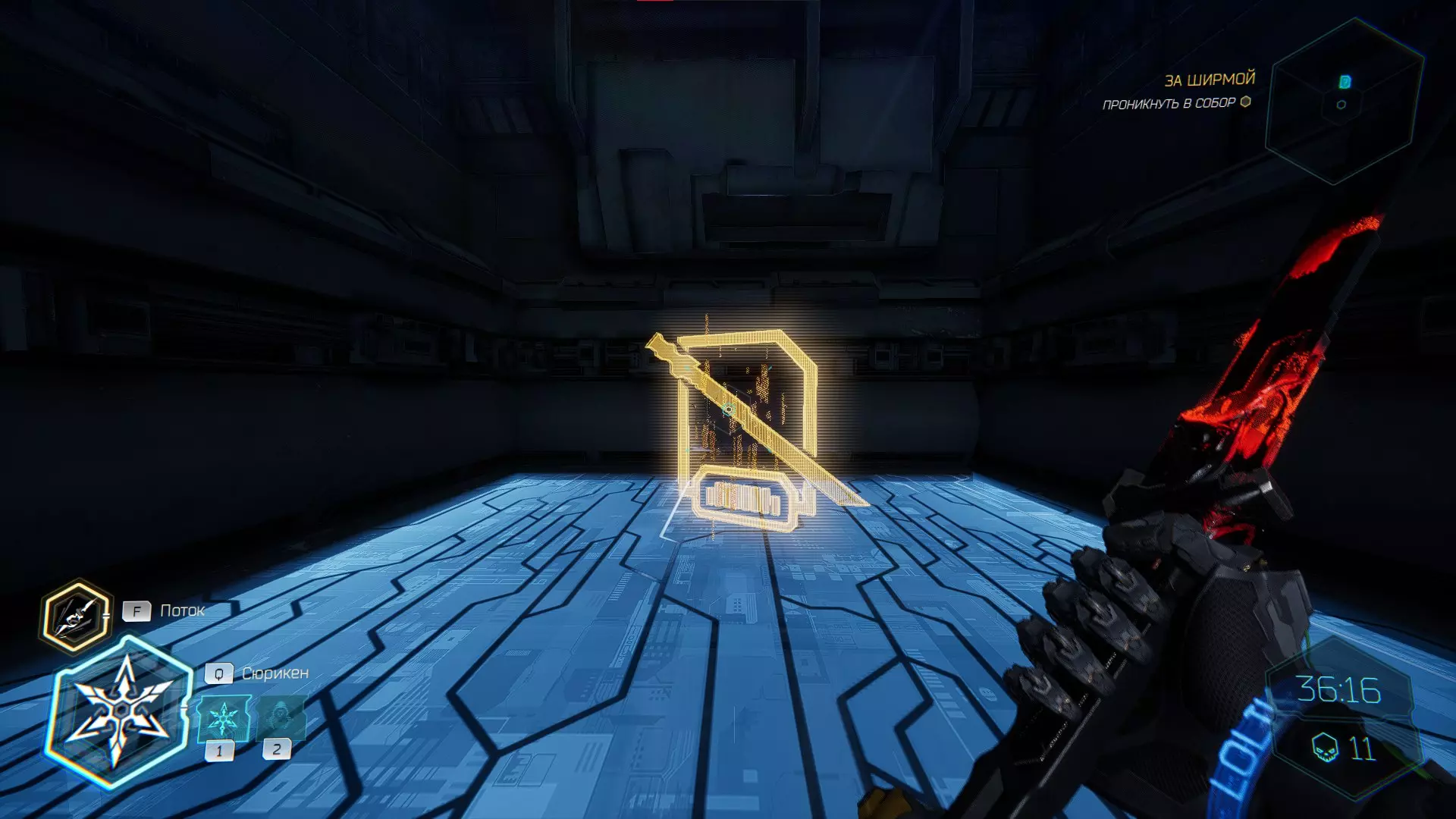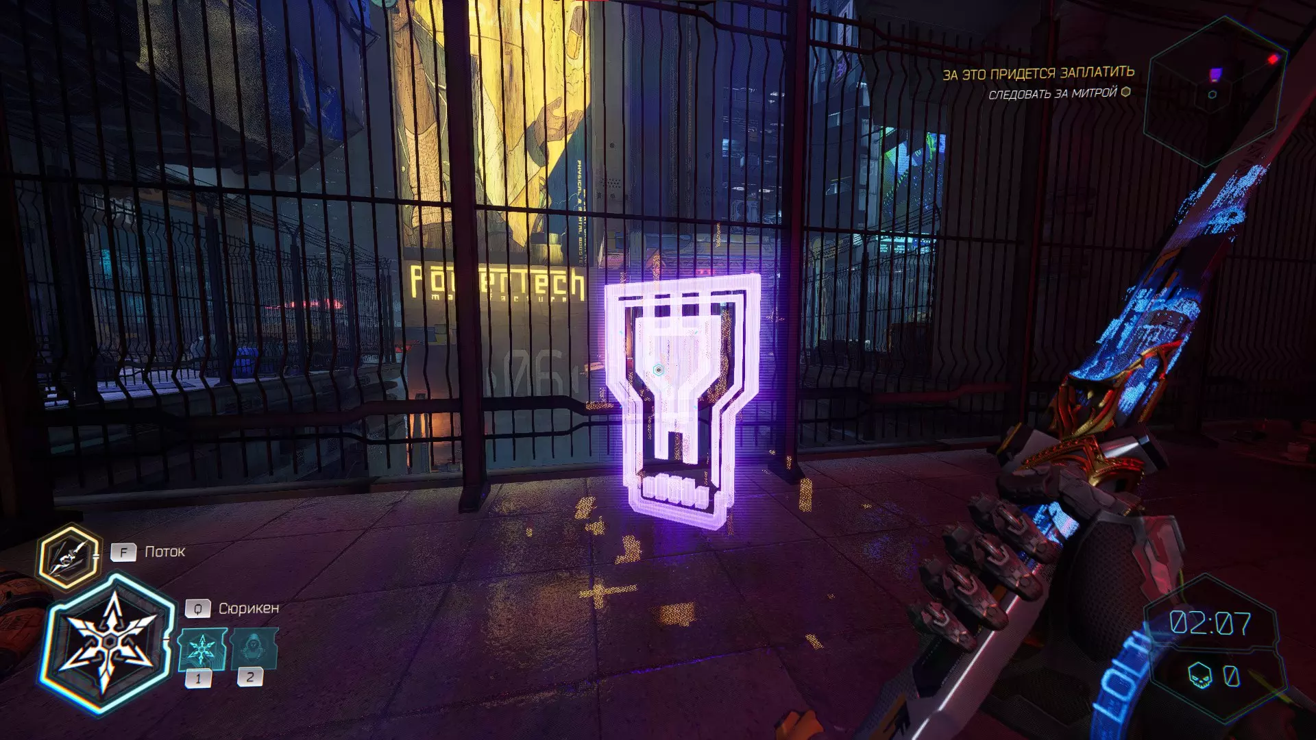 继续前进。飞到桥上,左上方会有一面墙,需要向墙投掷手里剑,以便吸附到平台上。对面会有另一个带有模块的小平台,飞到上面并拾取强化道具。 隐藏挑战【赛跑】:穿过所有数据传送门。