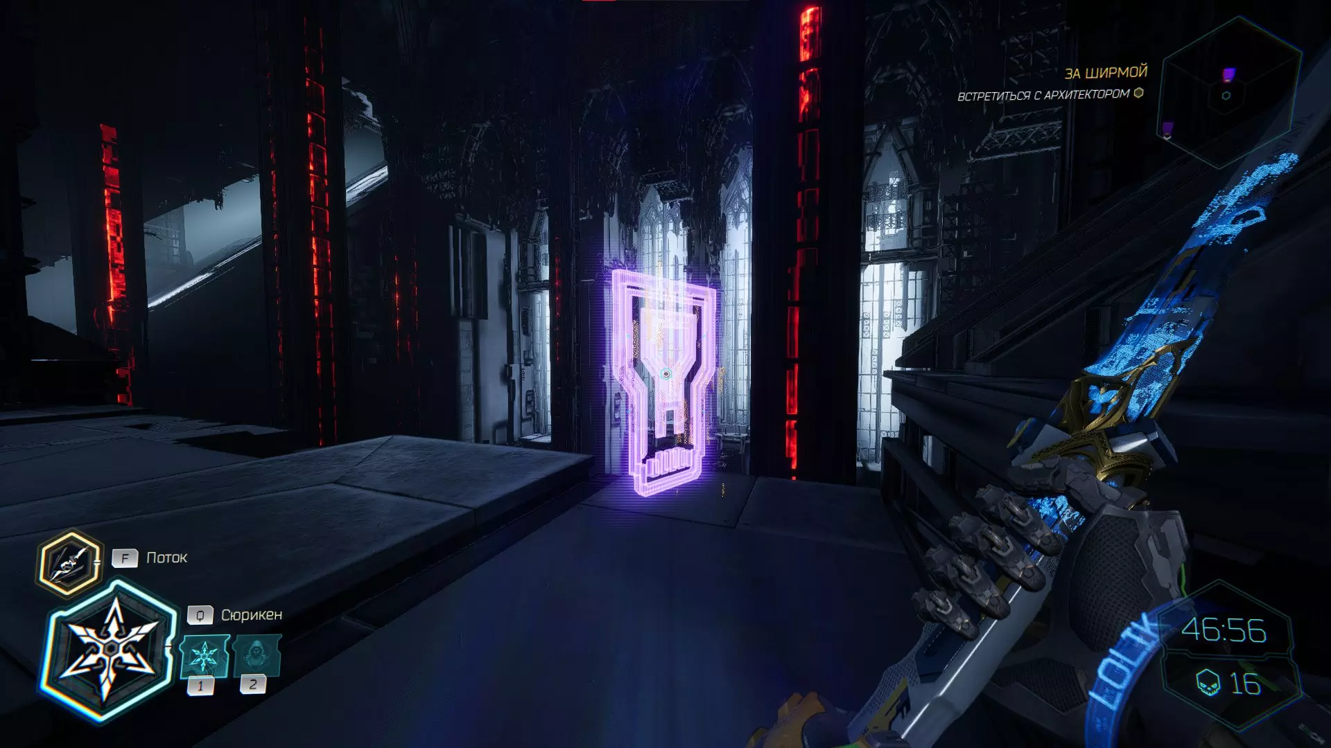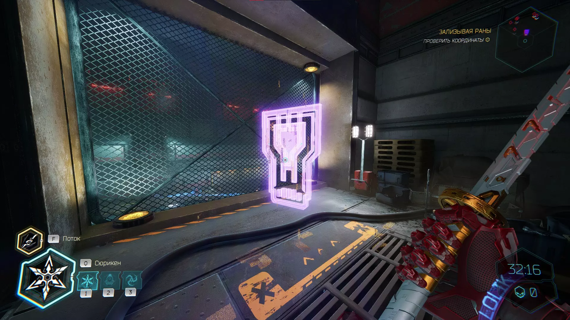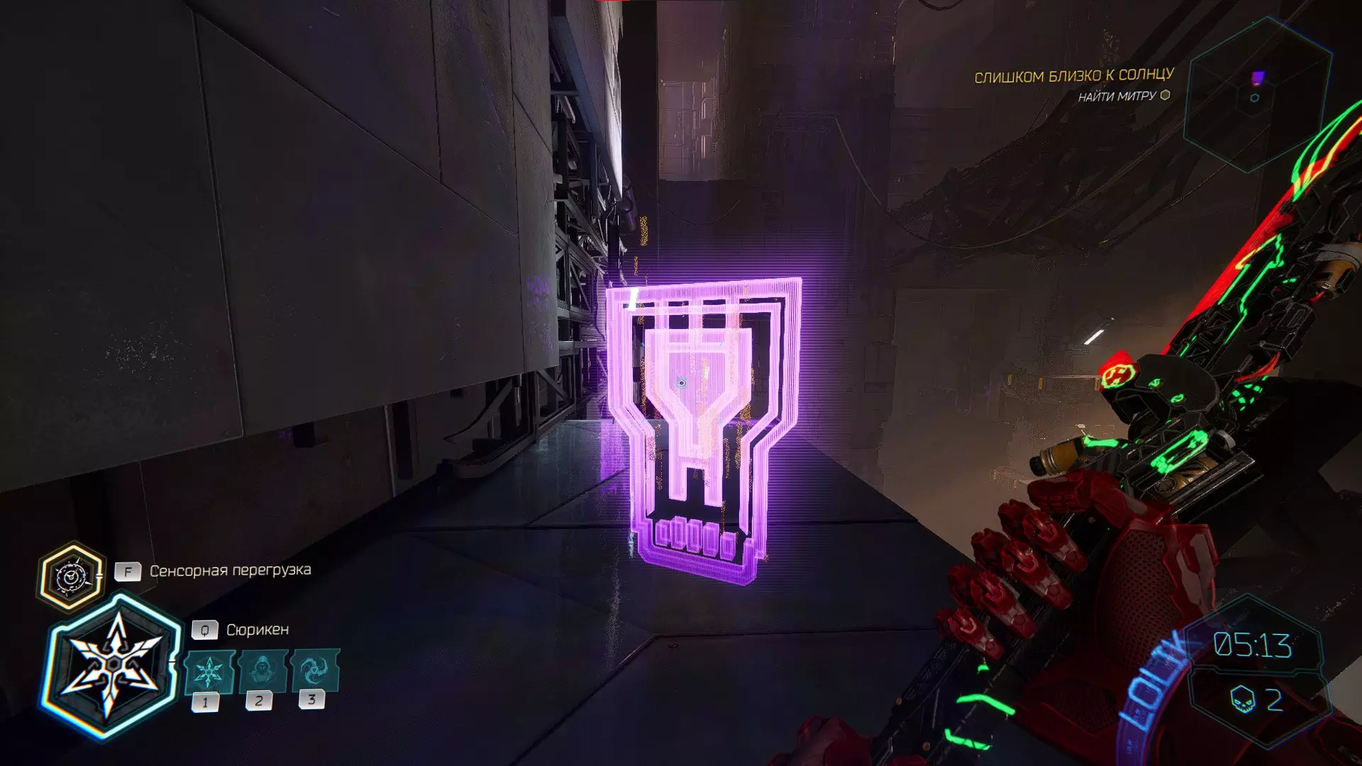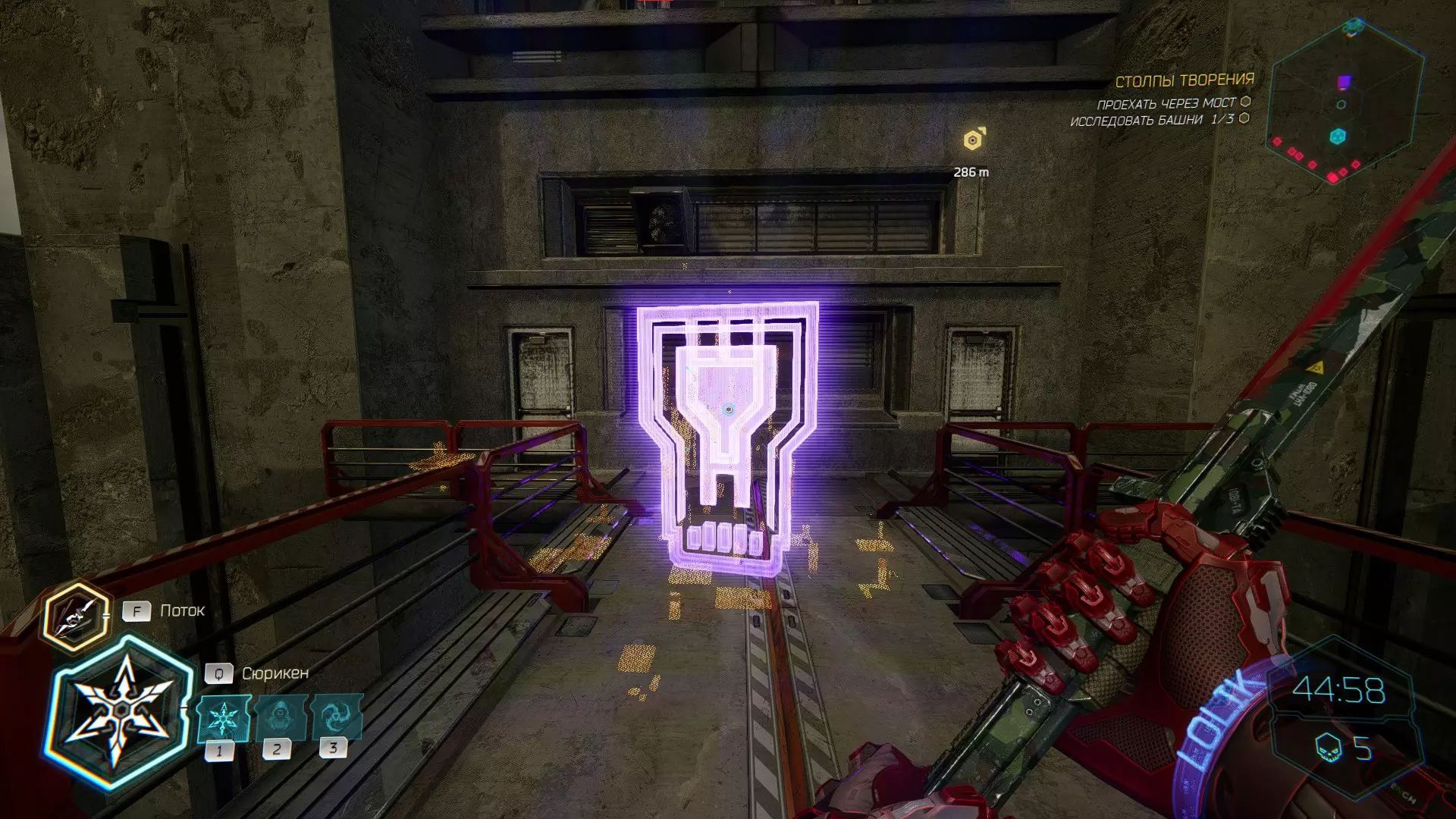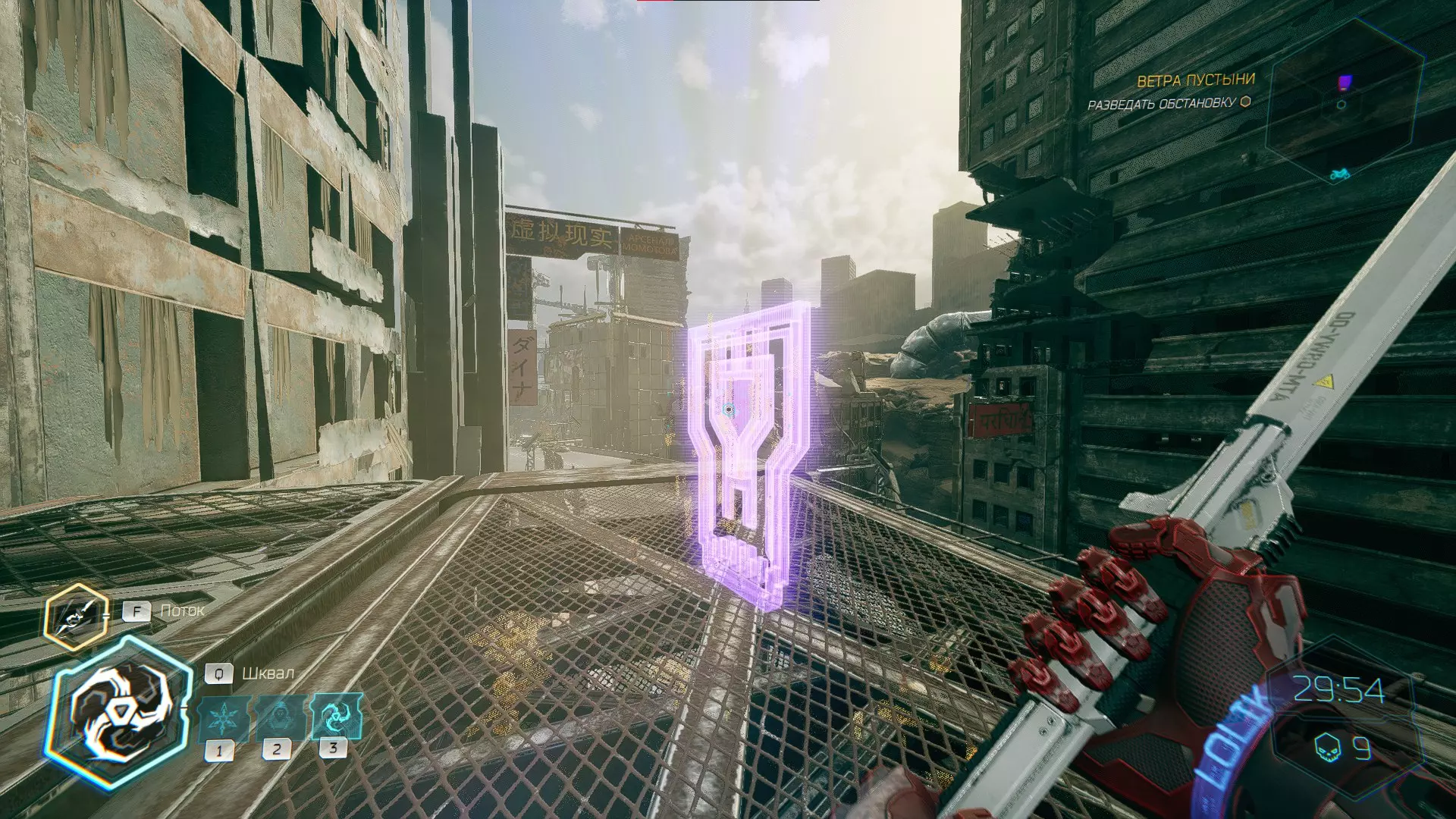 继续前进。飞到桥上,左上方会有一面墙,需要向墙投掷手里剑,以便吸附到平台上。对面会有另一个带有模块的小平台,飞到上面并拾取强化道具。 隐藏挑战【赛跑】:穿过所有数据传送门。