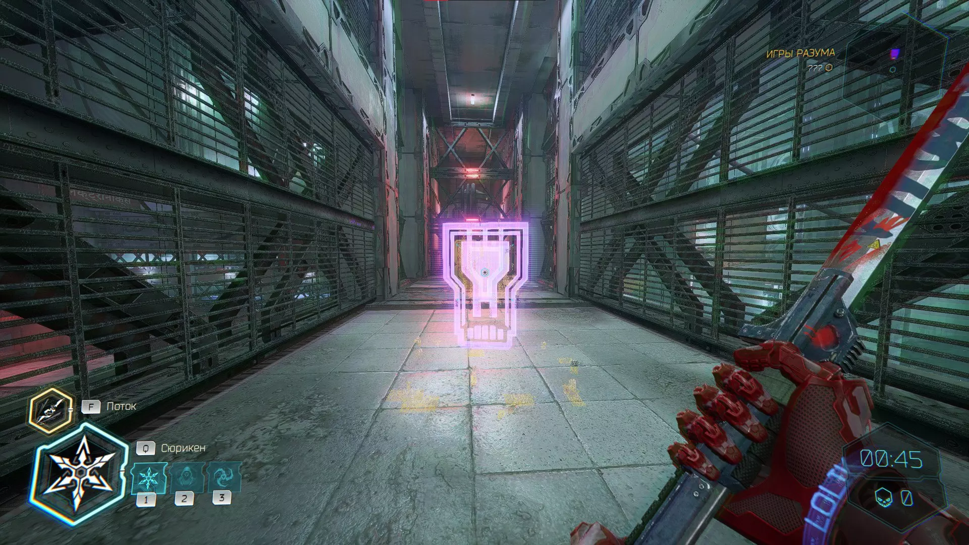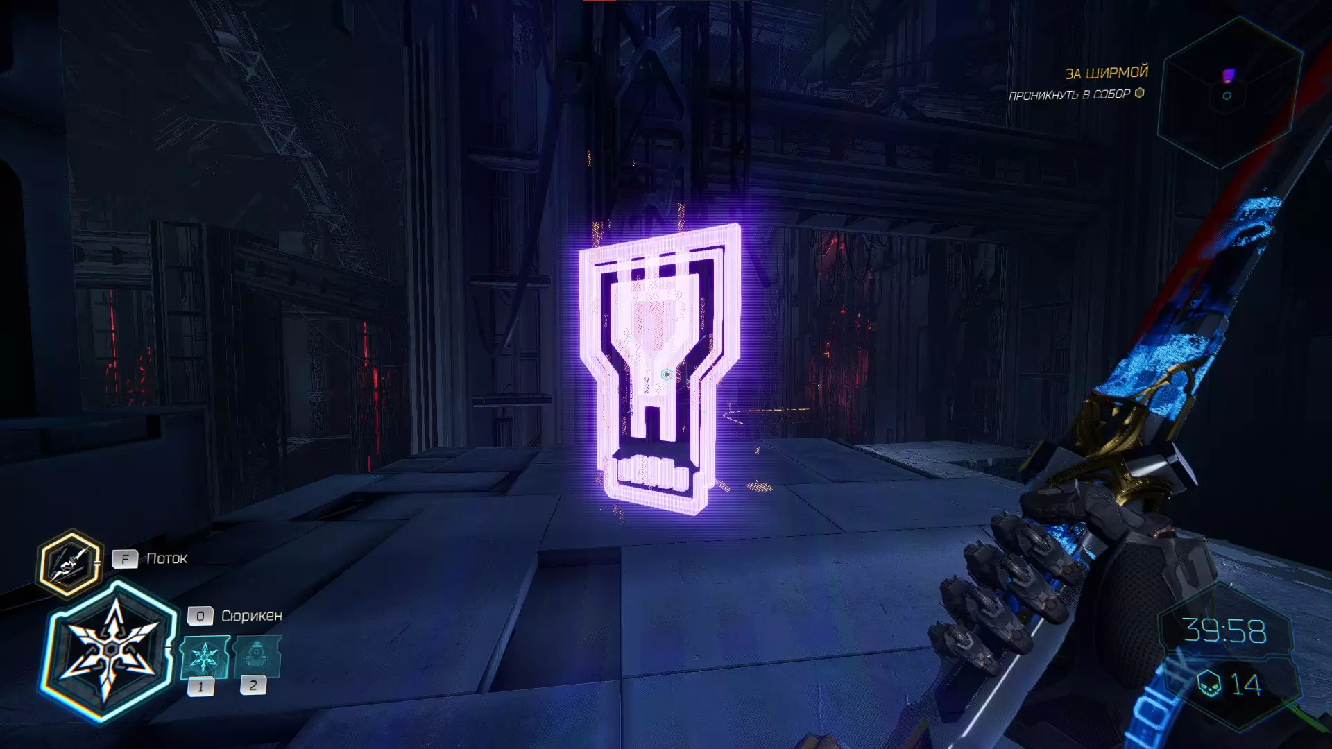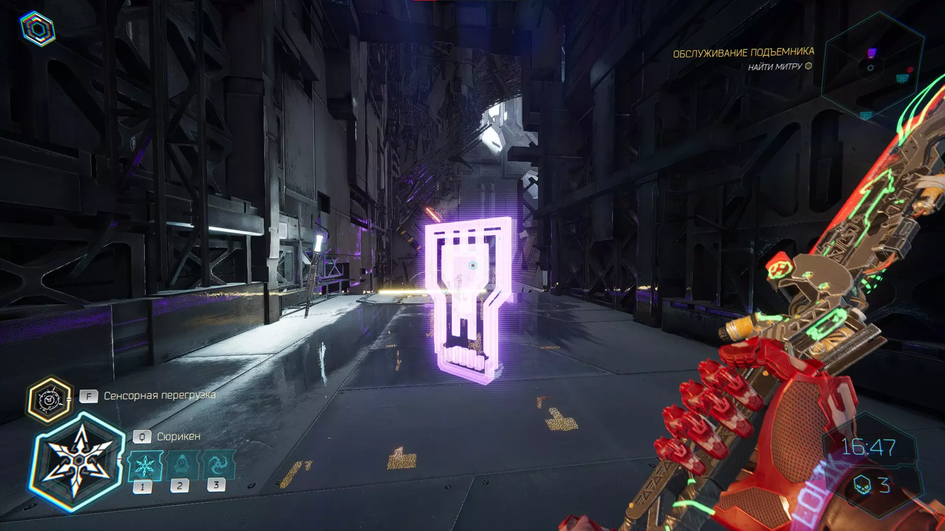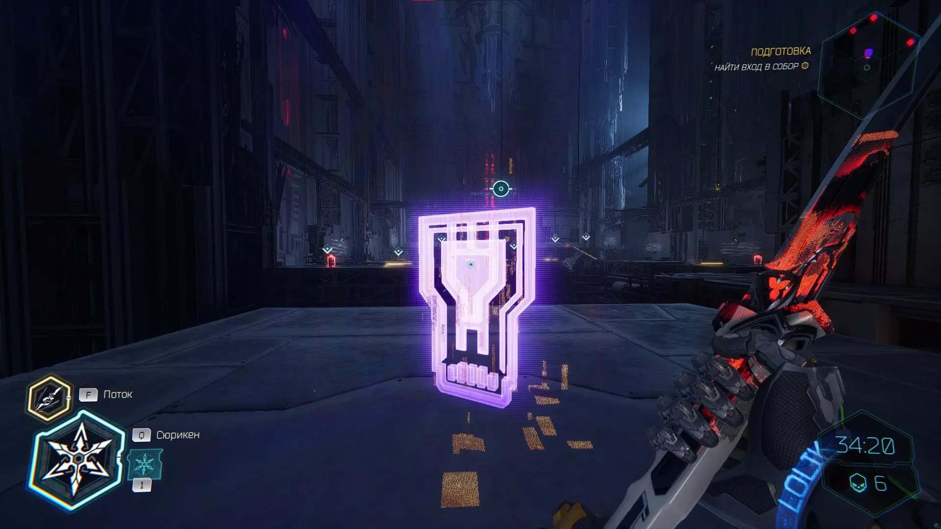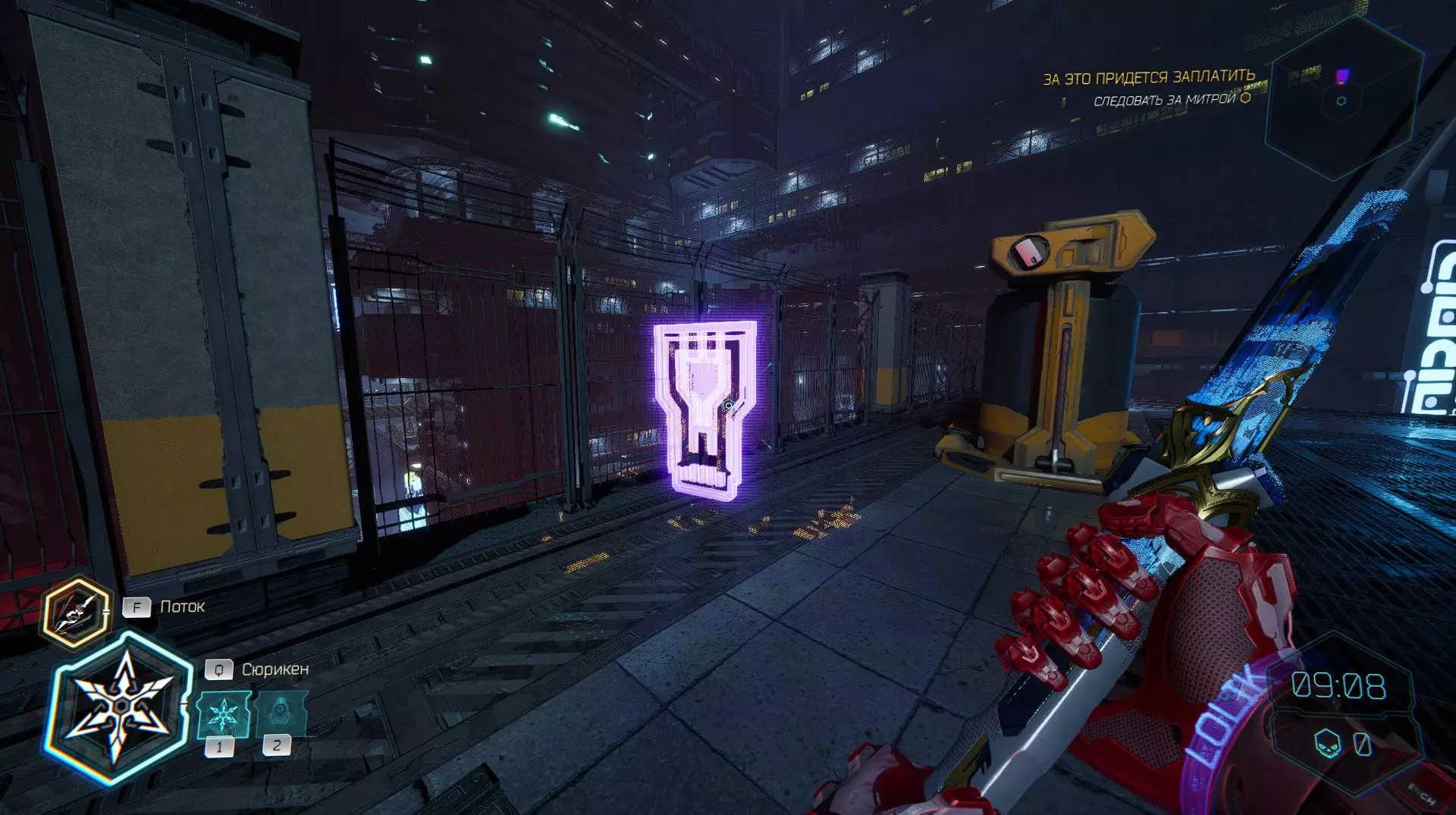 继续前进。飞到桥上,左上方会有一面墙,需要向墙投掷手里剑,以便吸附到平台上。对面会有另一个带有模块的小平台,飞到上面并拾取强化道具。 隐藏挑战【赛跑】:穿过所有数据传送门。
