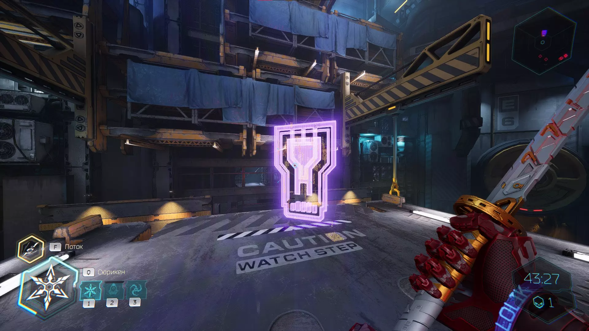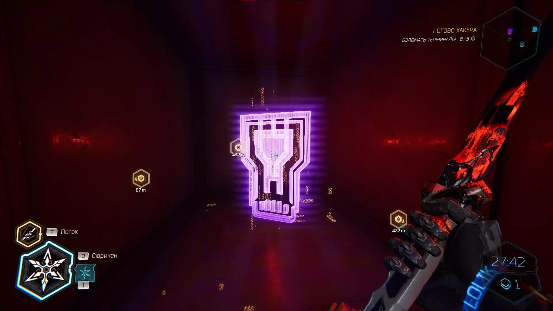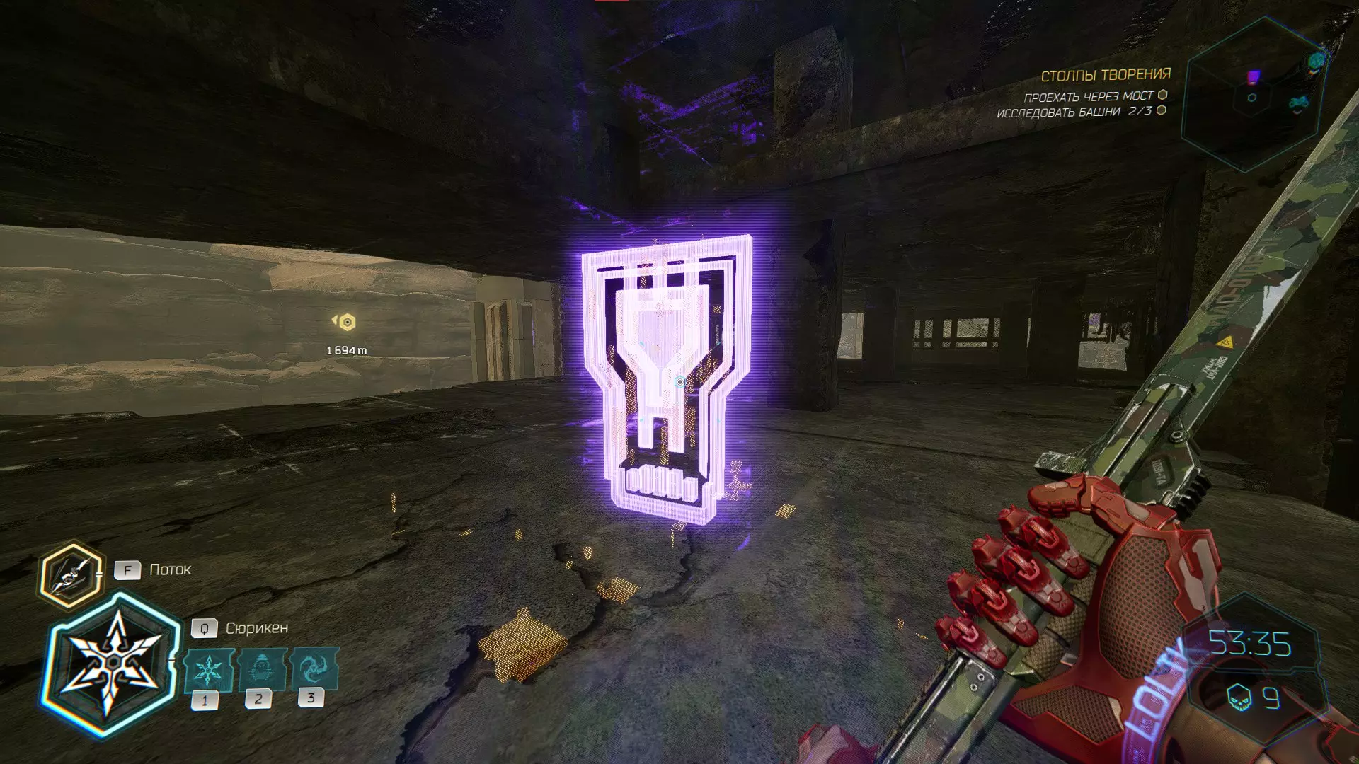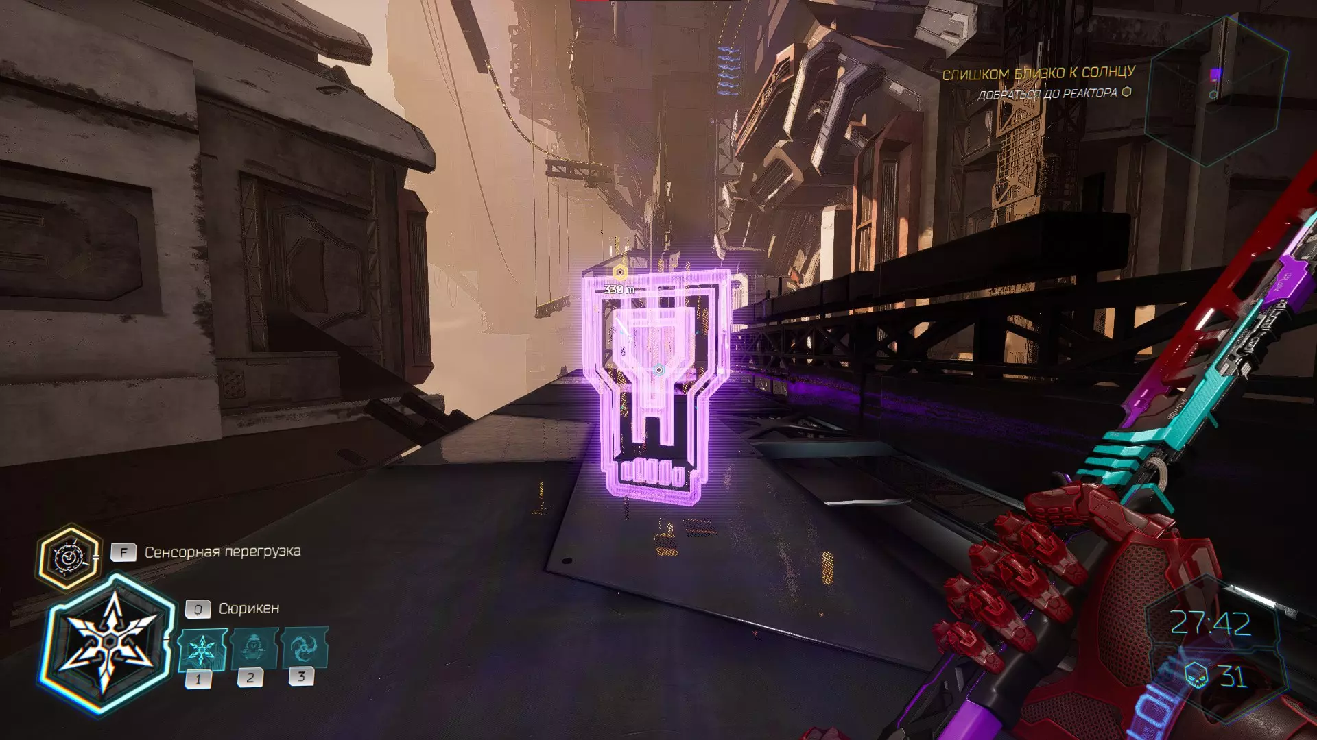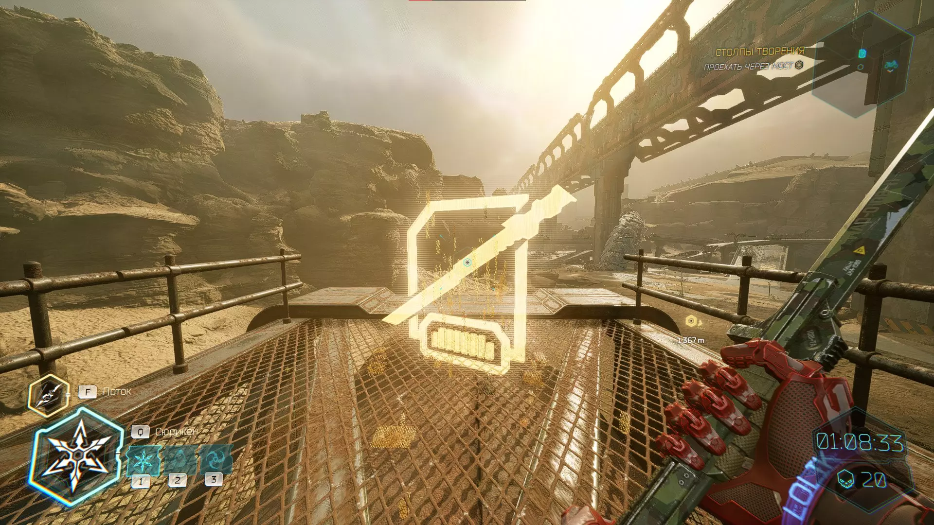 继续前进。飞到桥上,左上方会有一面墙,需要向墙投掷手里剑,以便吸附到平台上。对面会有另一个带有模块的小平台,飞到上面并拾取强化道具。 隐藏挑战【赛跑】:穿过所有数据传送门。