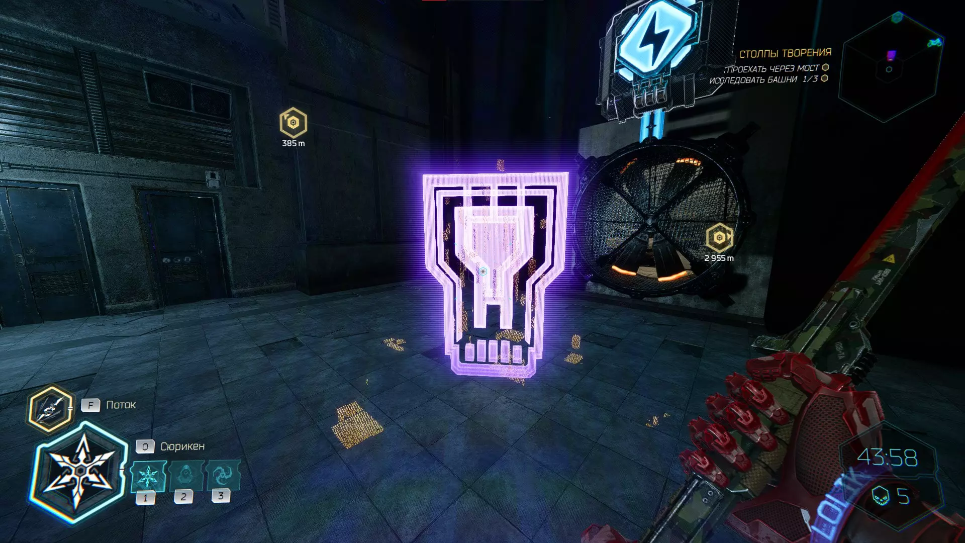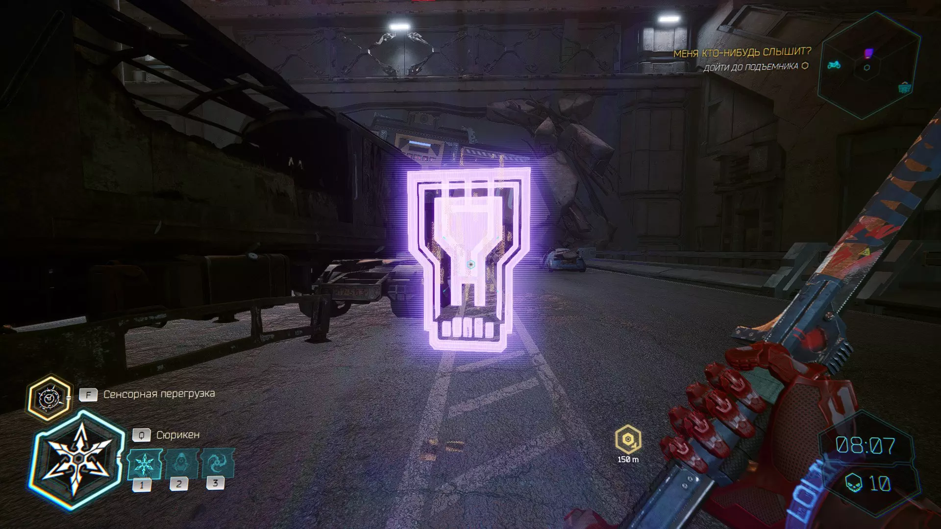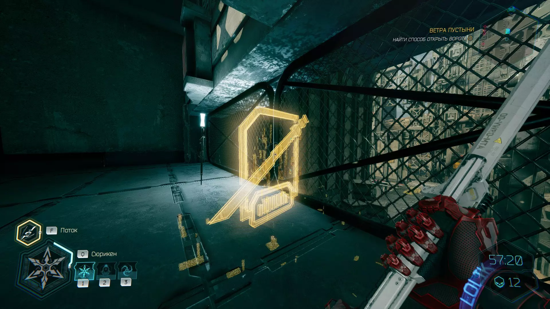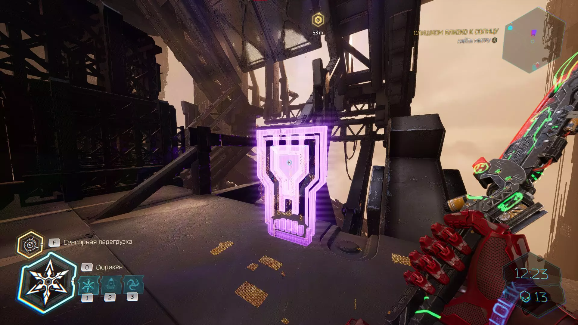 继续前进。飞到桥上,左上方会有一面墙,需要向墙投掷手里剑,以便吸附到平台上。对面会有另一个带有模块的小平台,飞到上面并拾取强化道具。 隐藏挑战【赛跑】:穿过所有数据传送门。