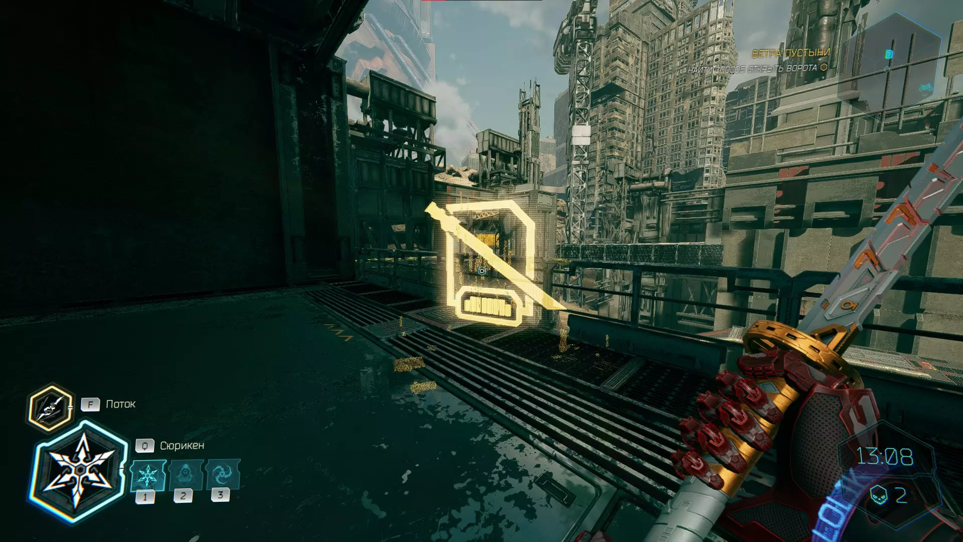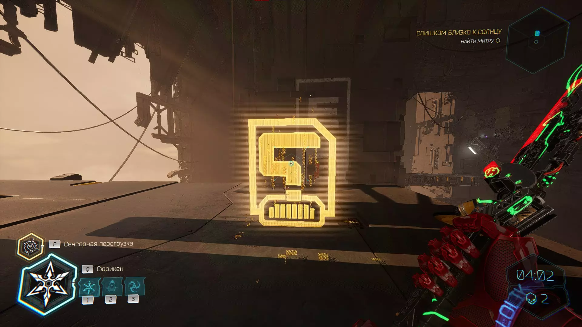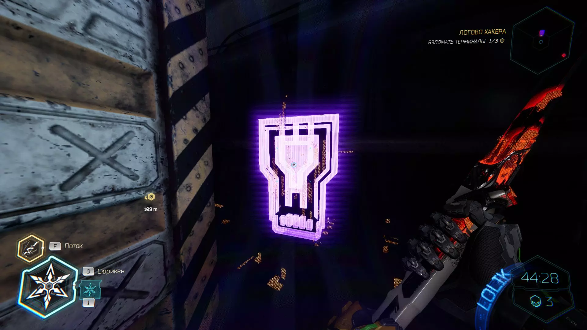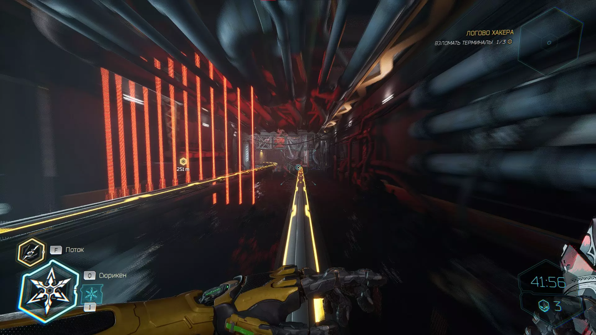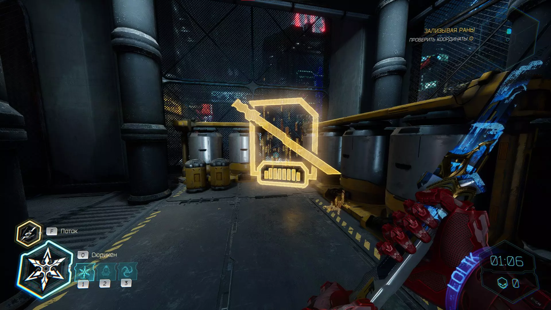 继续前进。飞到桥上,左上方会有一面墙,需要向墙投掷手里剑,以便吸附到平台上。对面会有另一个带有模块的小平台,飞到上面并拾取强化道具。 隐藏挑战【赛跑】:穿过所有数据传送门。