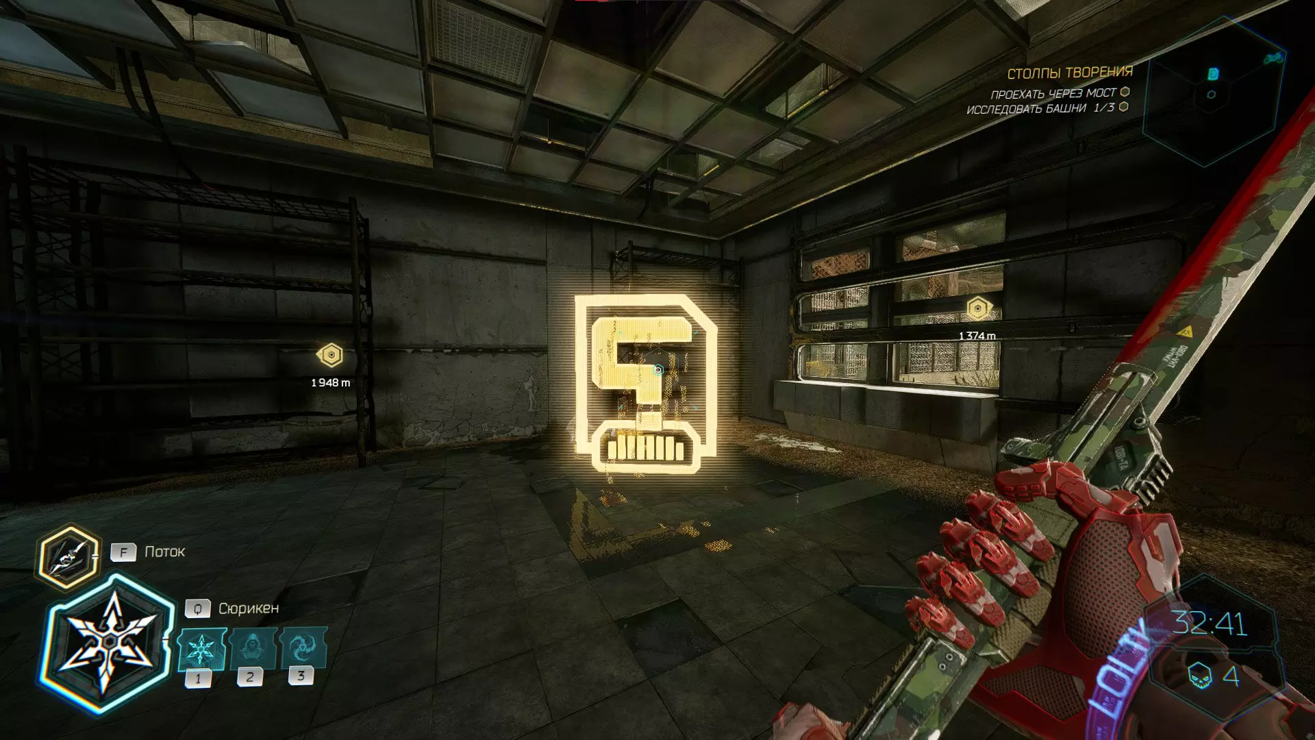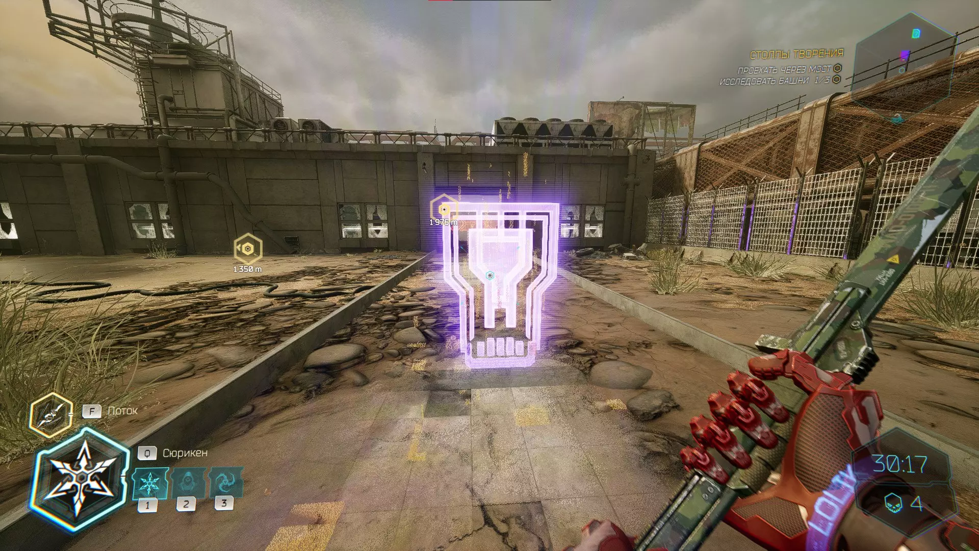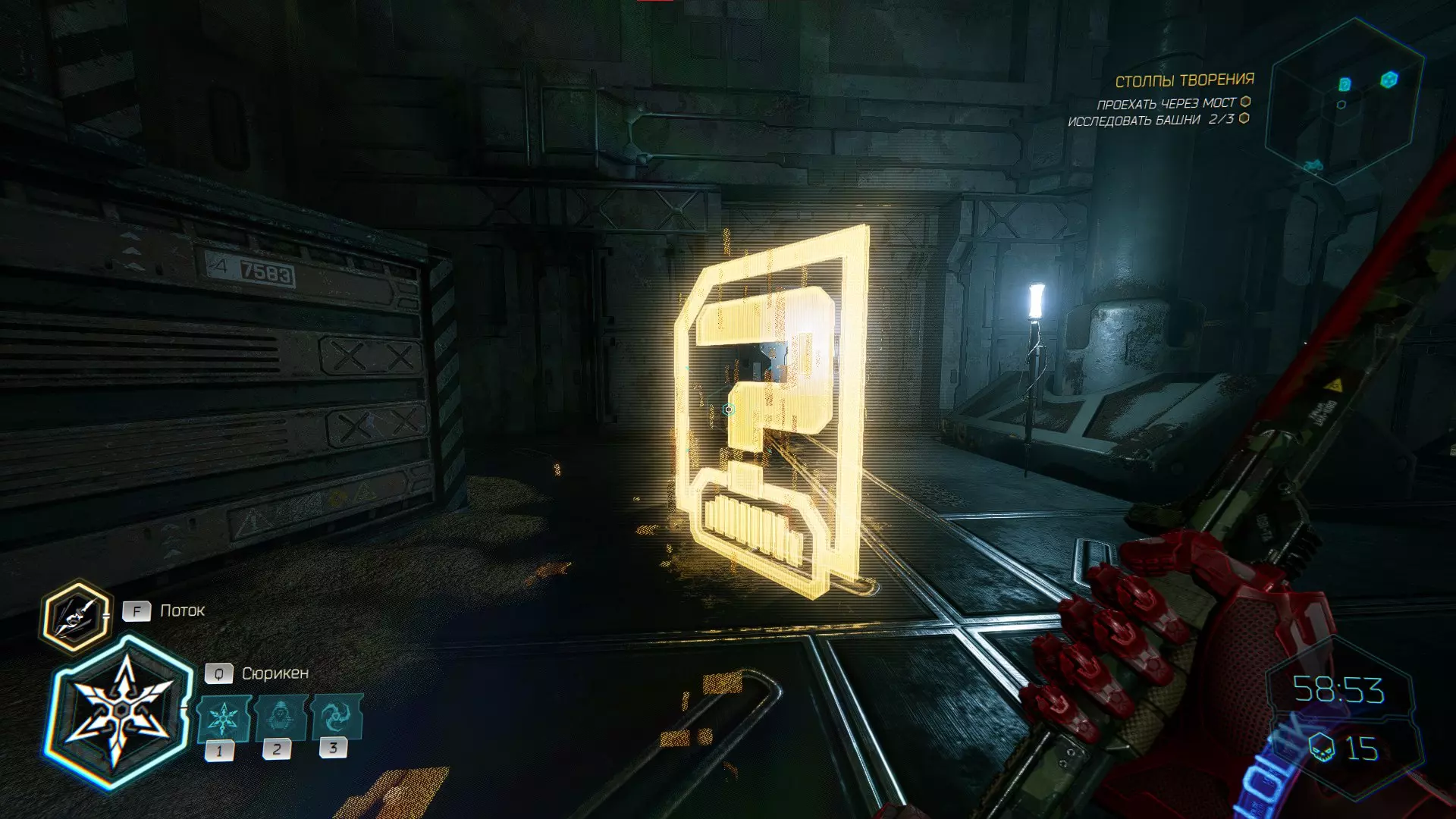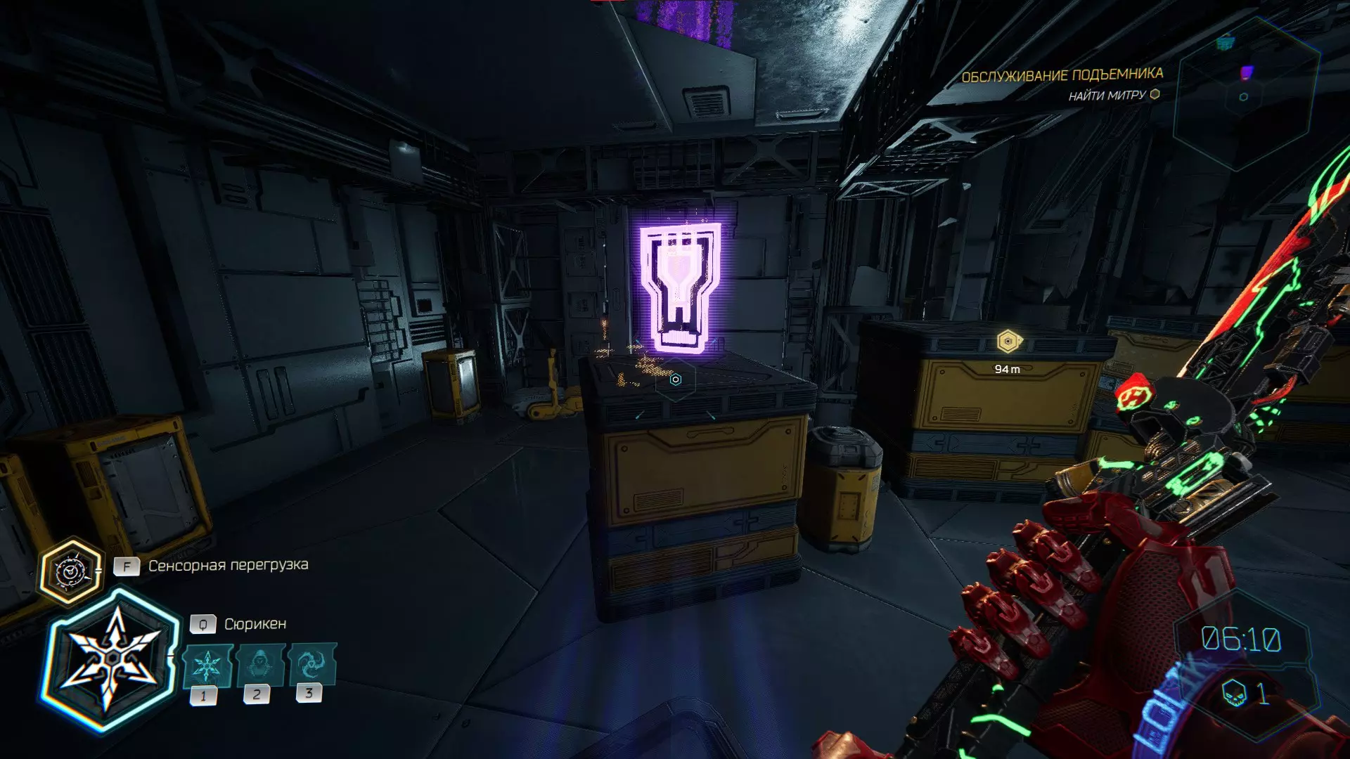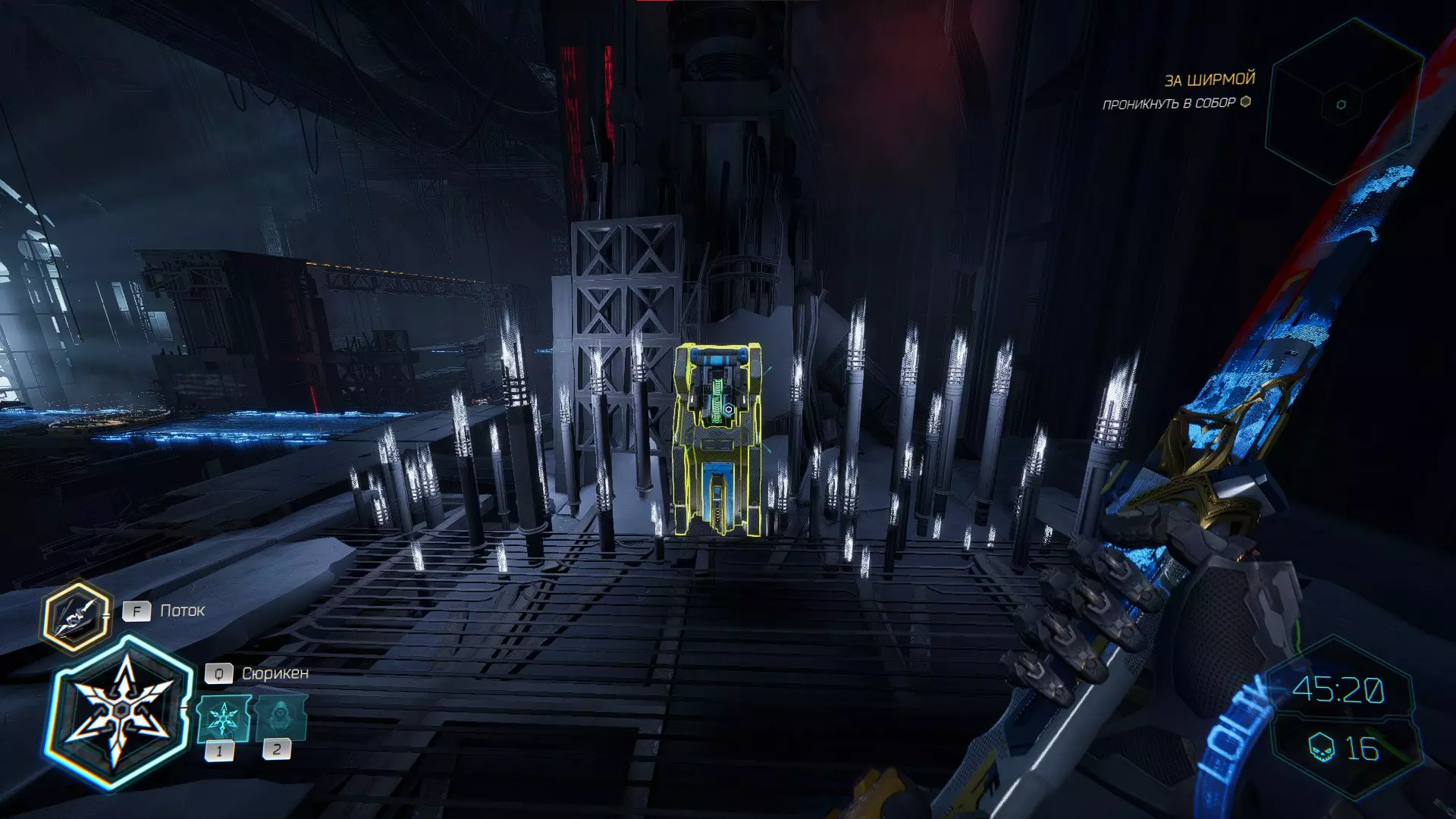 继续前进。飞到桥上,左上方会有一面墙,需要向墙投掷手里剑,以便吸附到平台上。对面会有另一个带有模块的小平台,飞到上面并拾取强化道具。 隐藏挑战【赛跑】:穿过所有数据传送门。