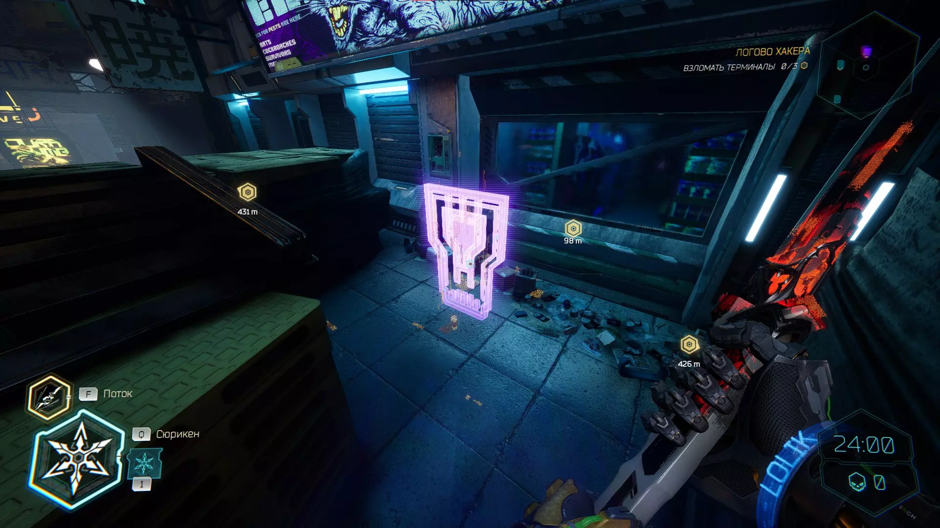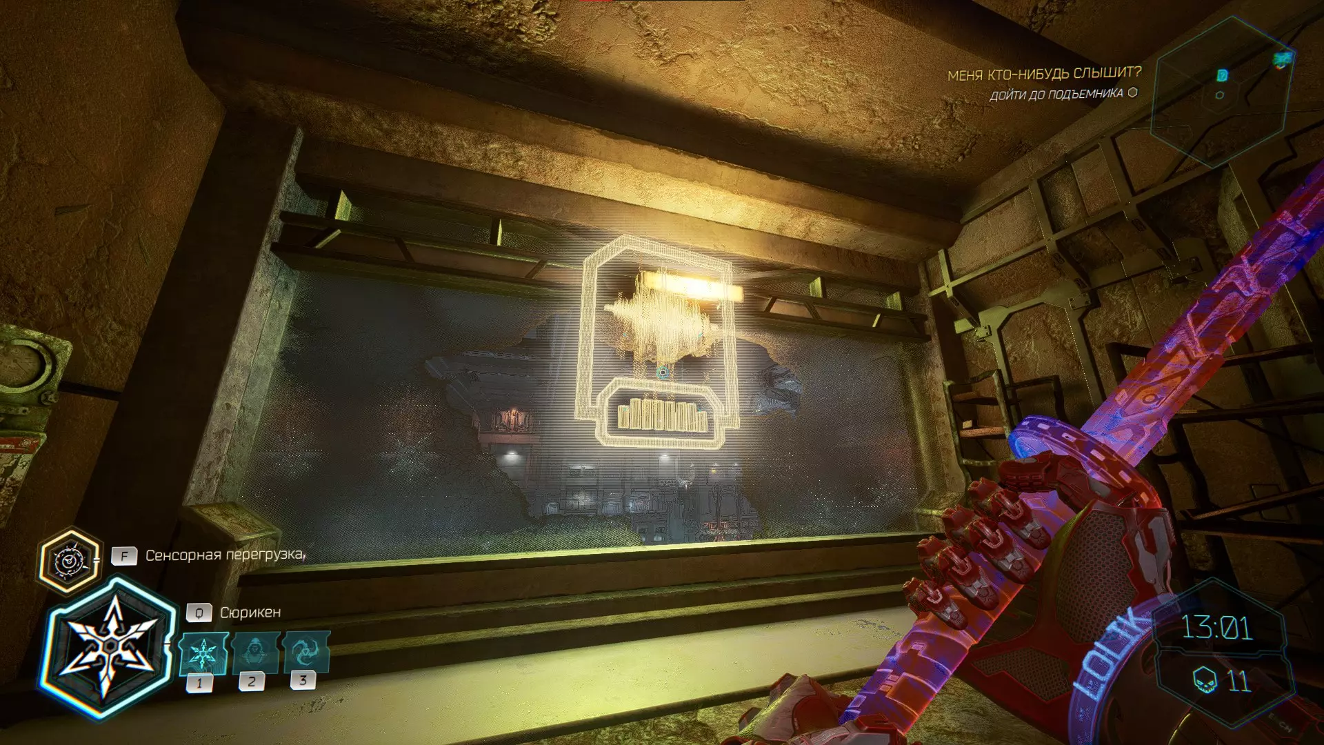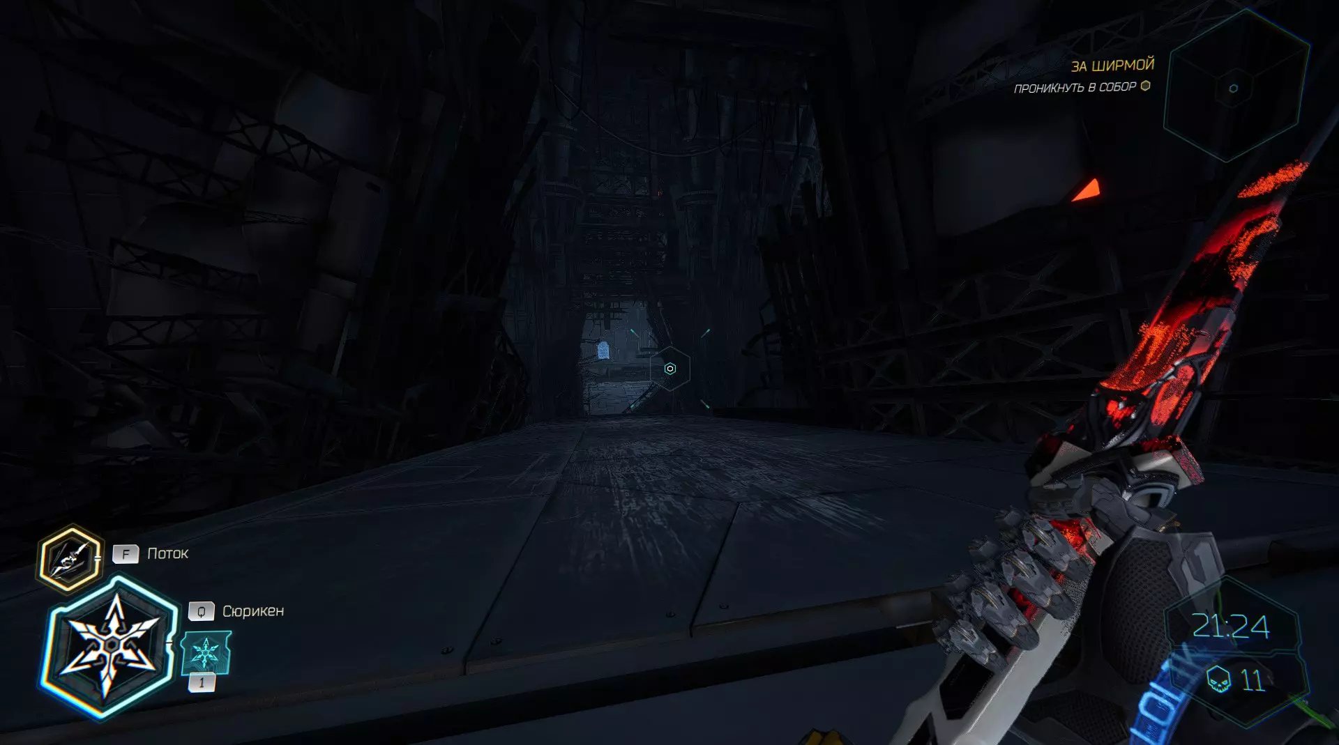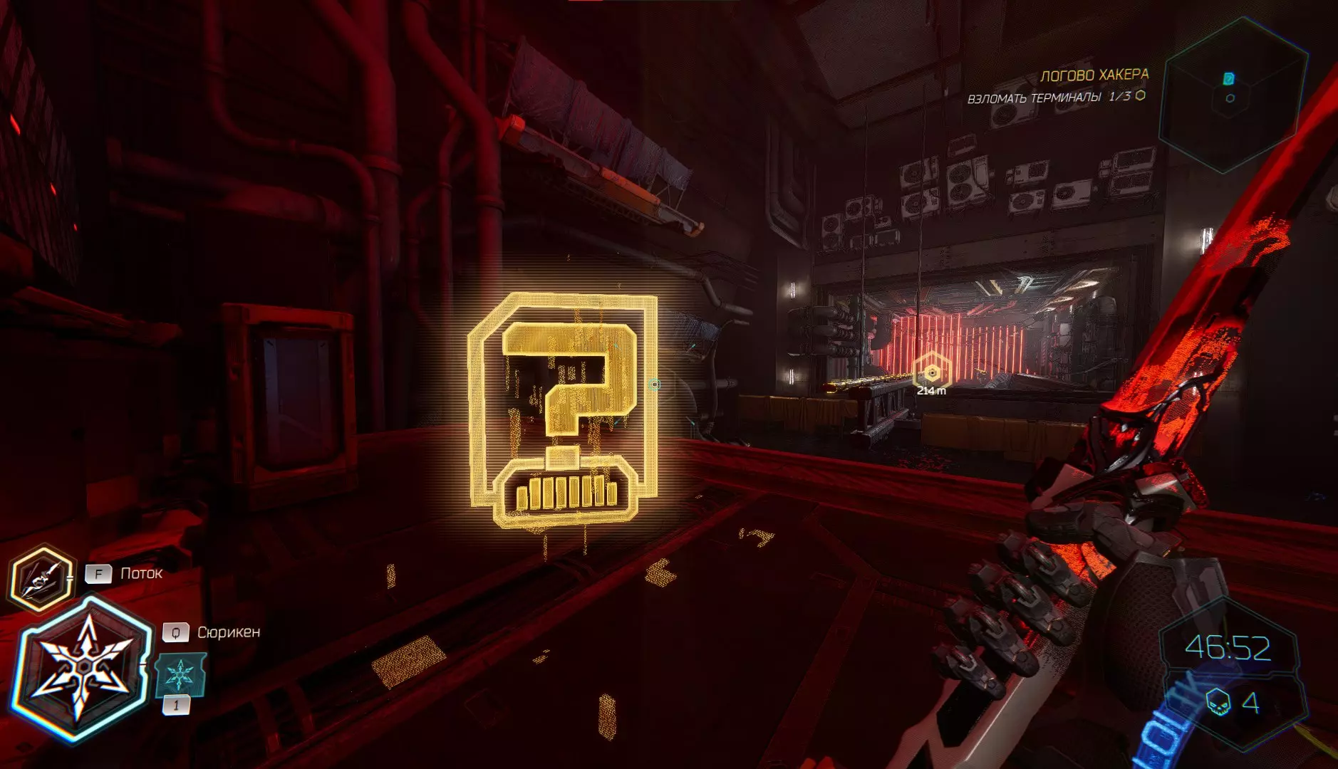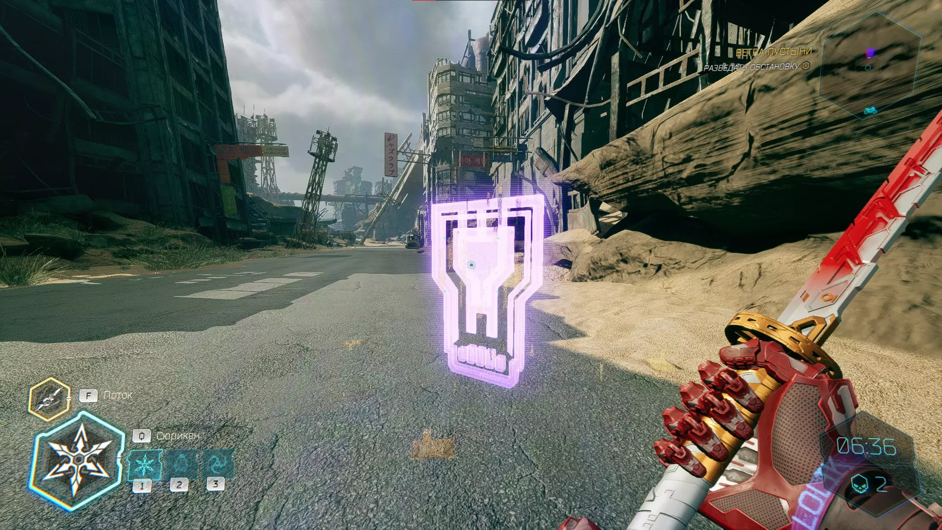 继续前进。飞到桥上,左上方会有一面墙,需要向墙投掷手里剑,以便吸附到平台上。对面会有另一个带有模块的小平台,飞到上面并拾取强化道具。 隐藏挑战【赛跑】:穿过所有数据传送门。