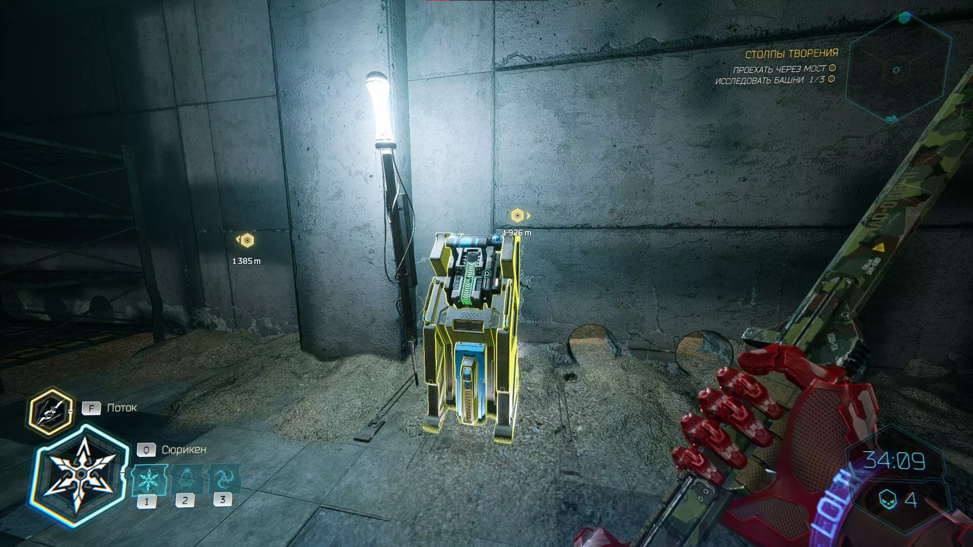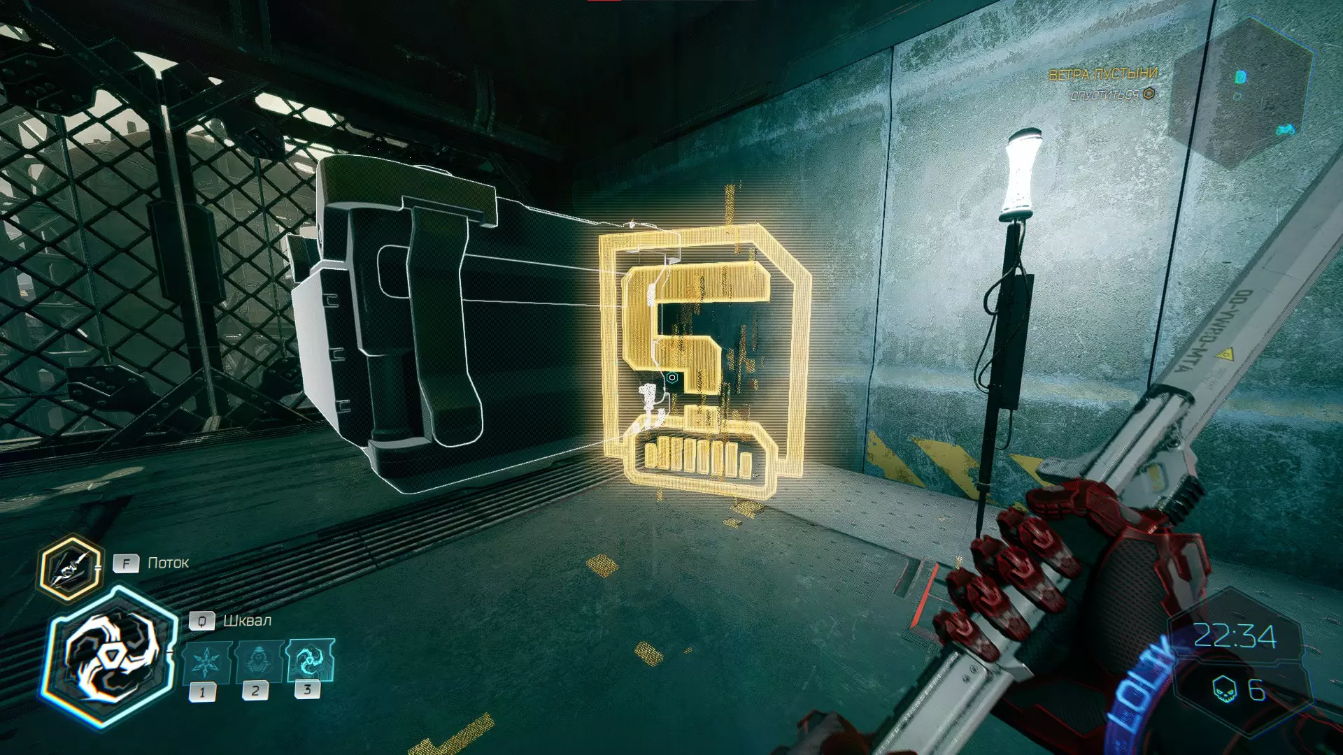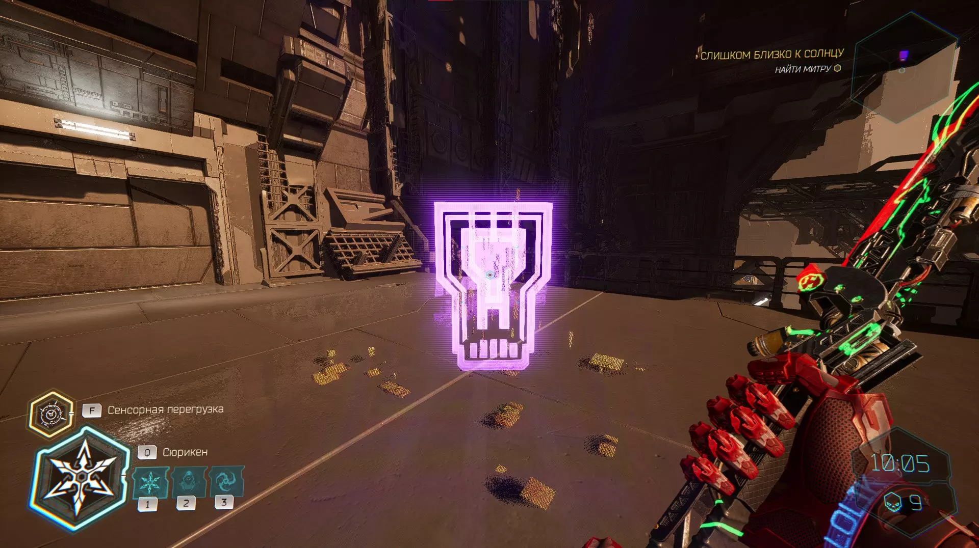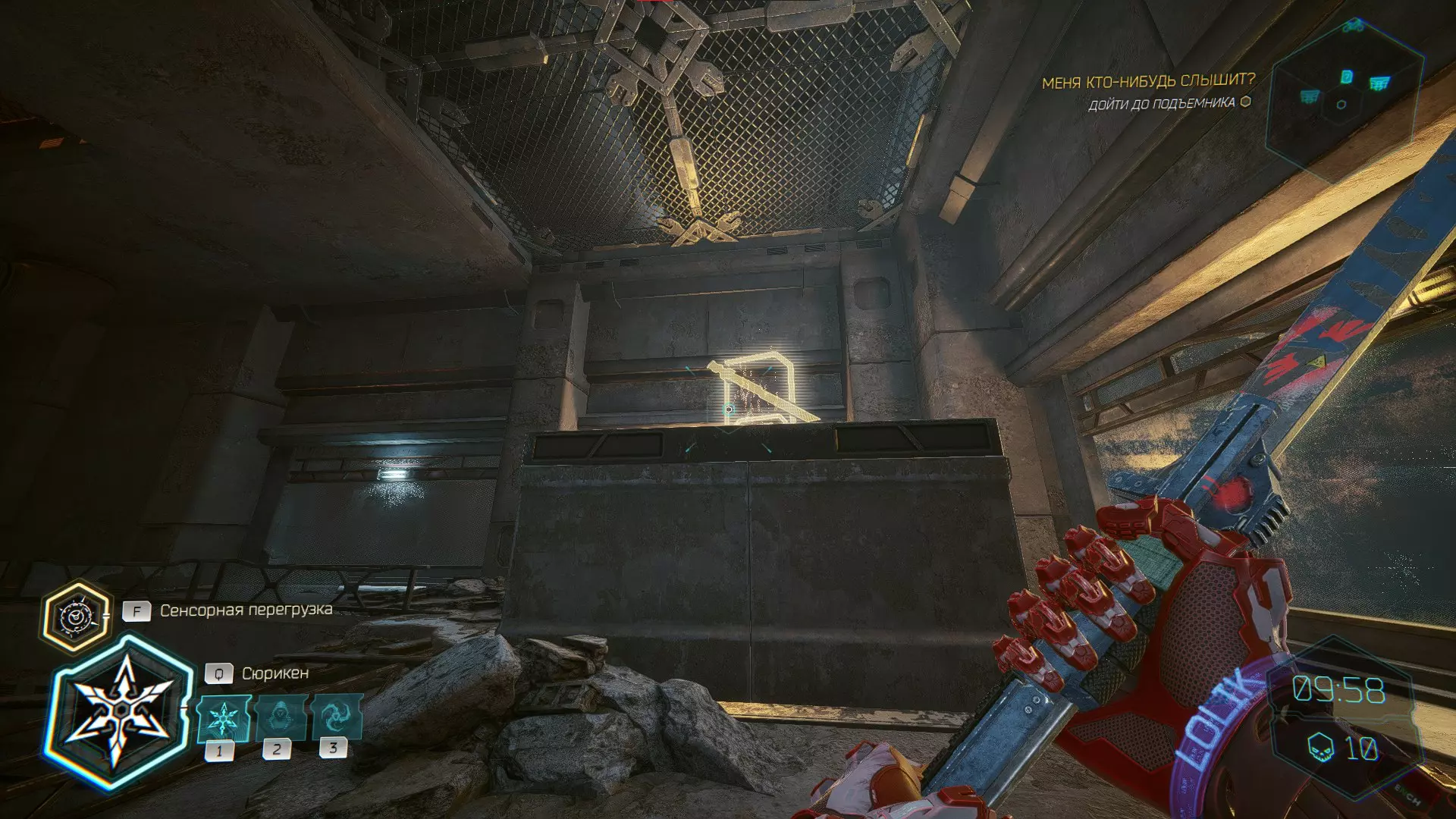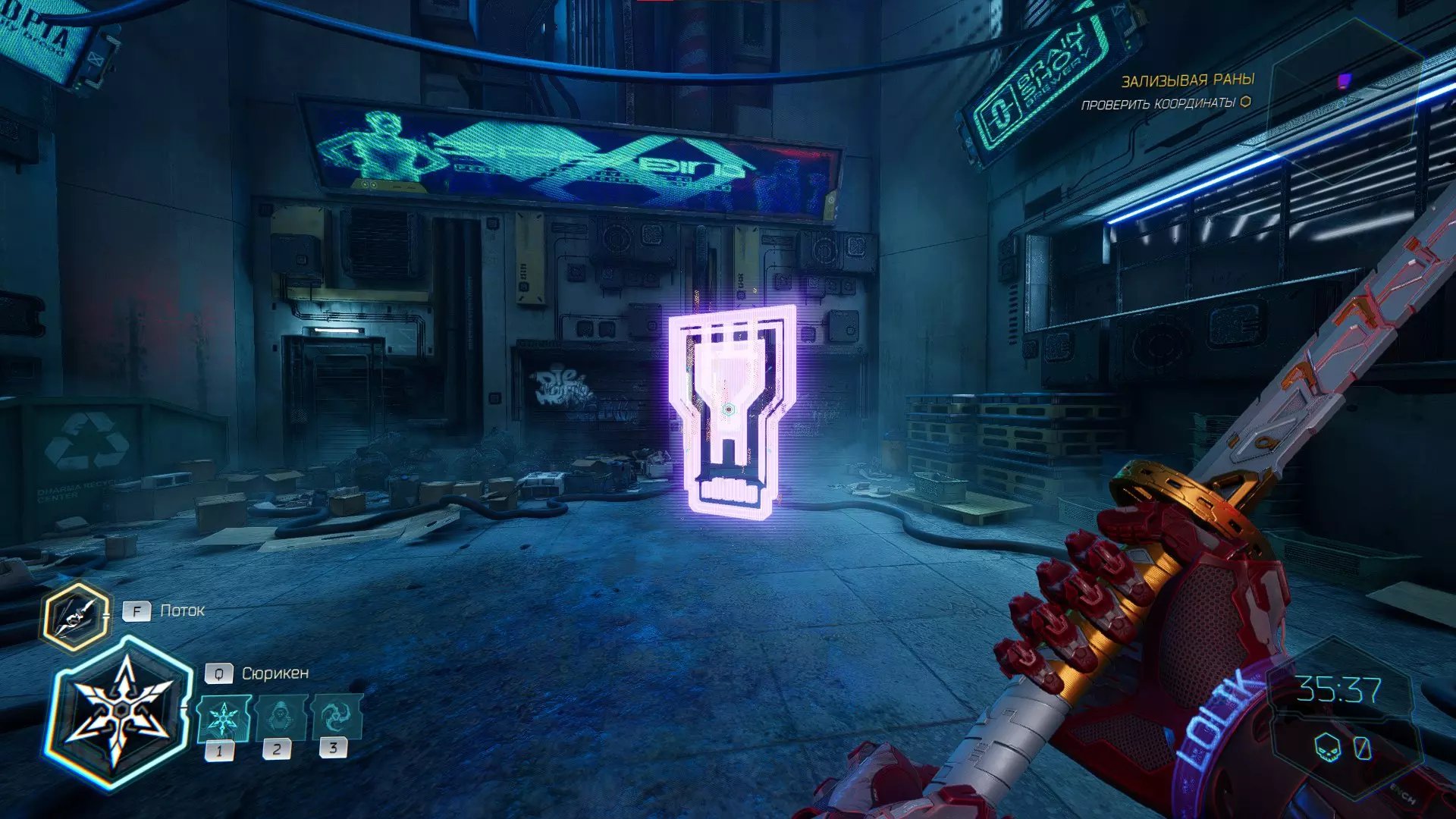 继续前进。飞到桥上,左上方会有一面墙,需要向墙投掷手里剑,以便吸附到平台上。对面会有另一个带有模块的小平台,飞到上面并拾取强化道具。 隐藏挑战【赛跑】:穿过所有数据传送门。