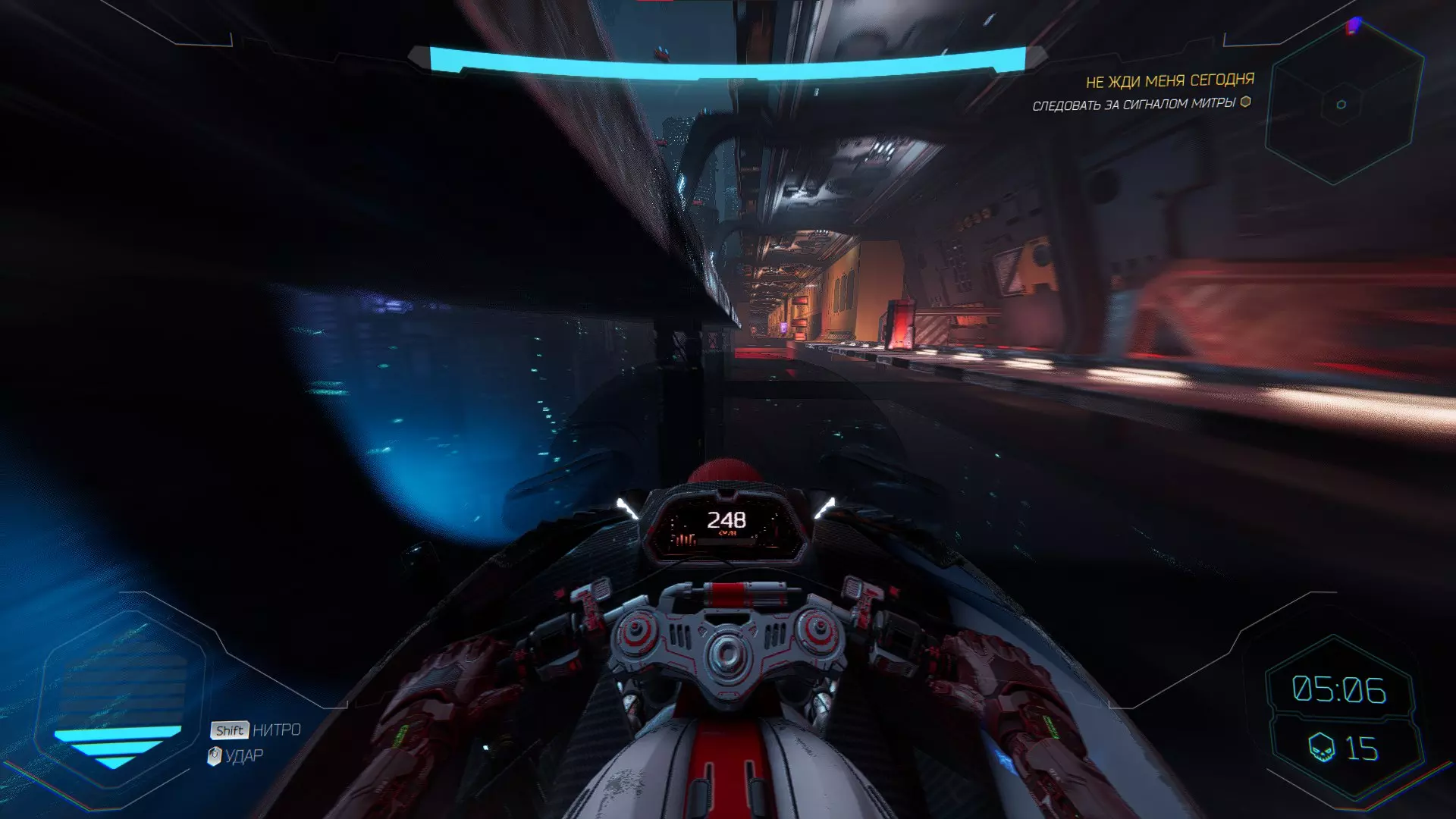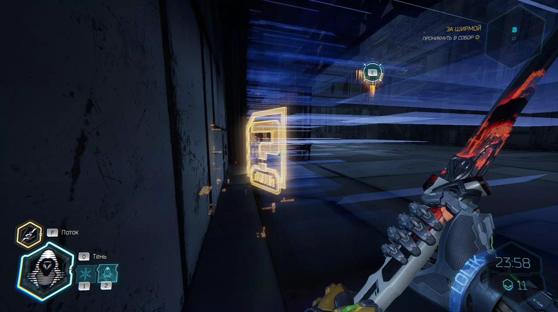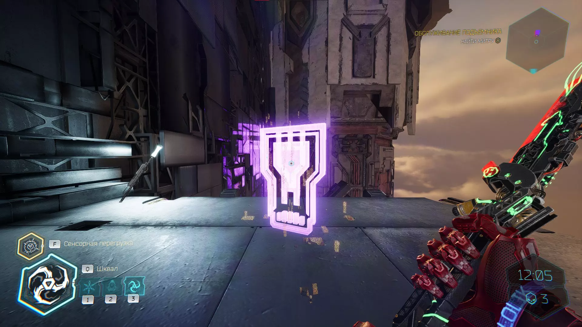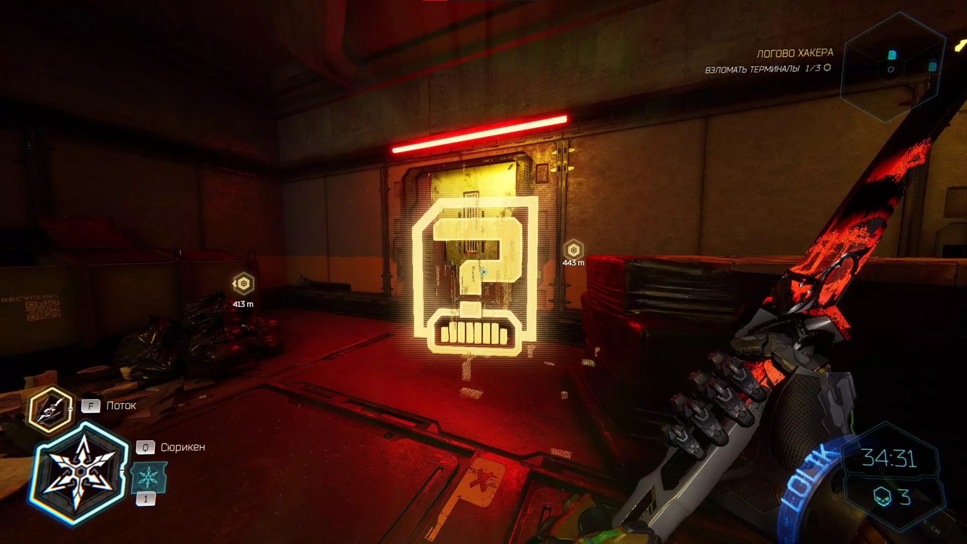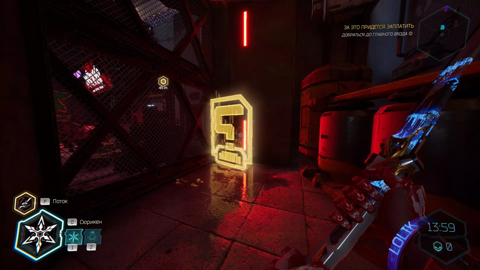继续前进。飞到桥上,左上方会有一面墙,需要向墙投掷手里剑,以便吸附到平台上。对面会有另一个带有模块的小平台,飞到上面并拾取强化道具。 隐藏挑战【赛跑】:穿过所有数据传送门。