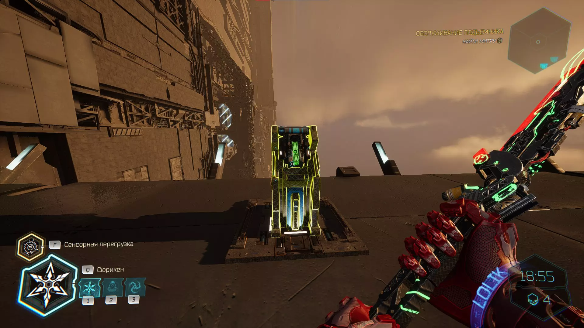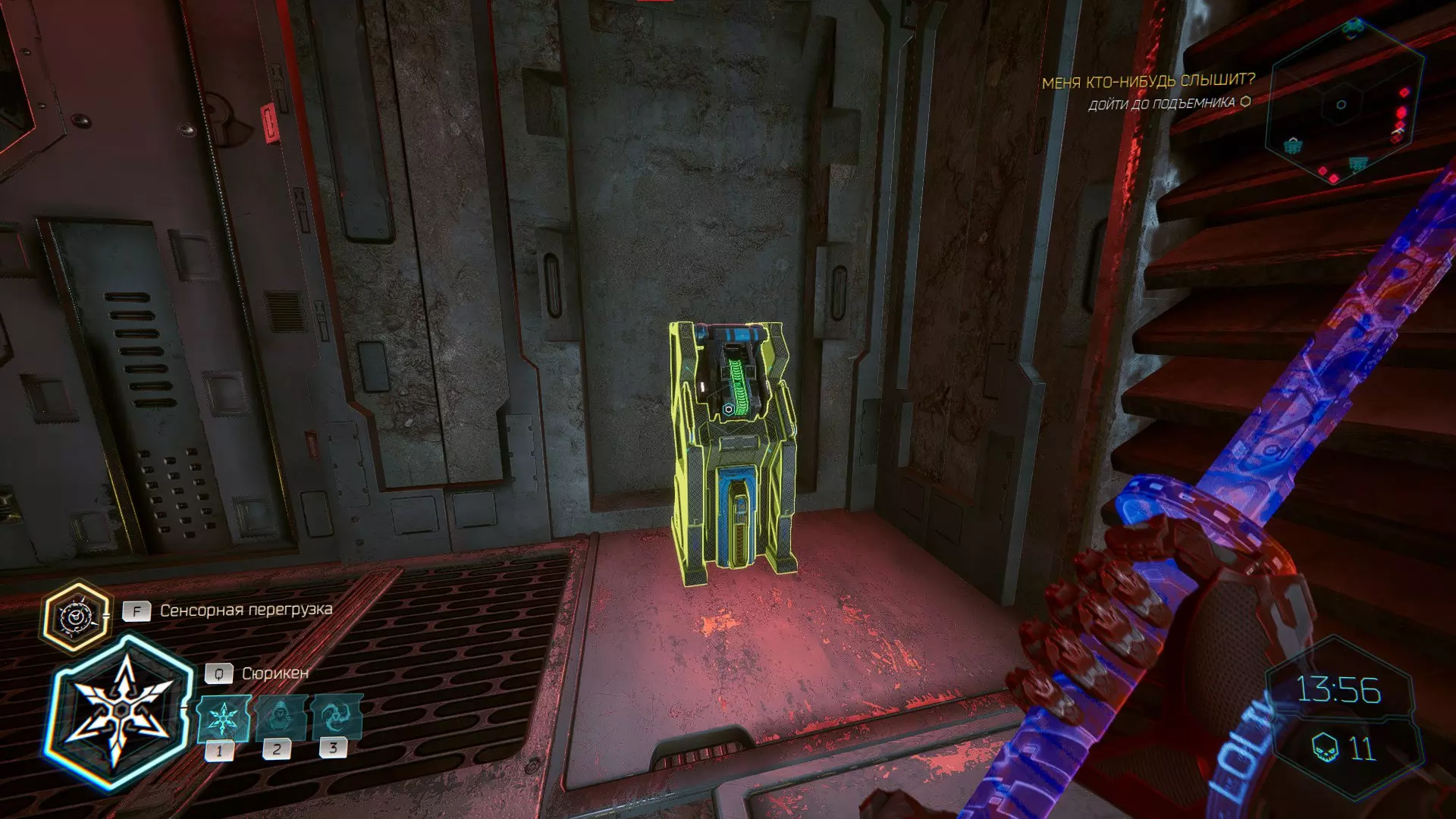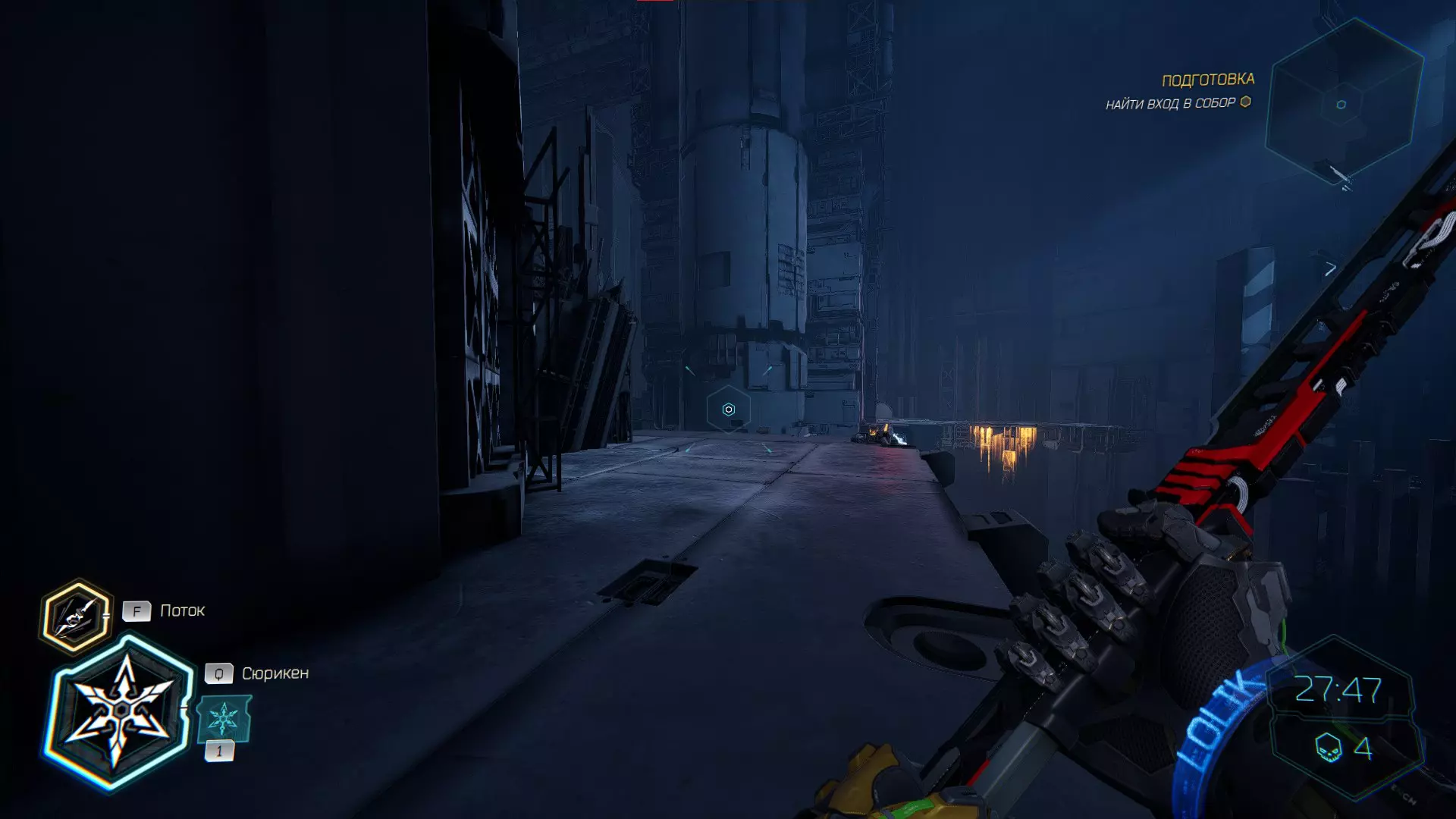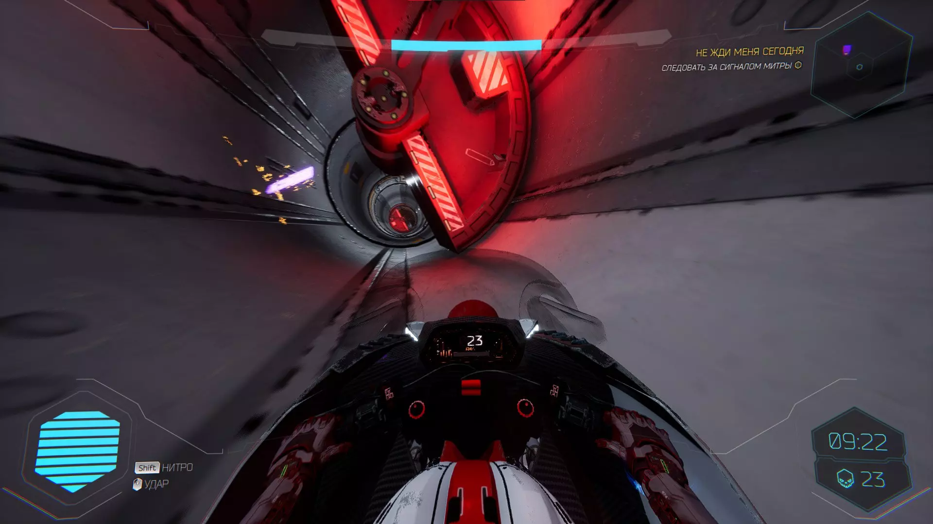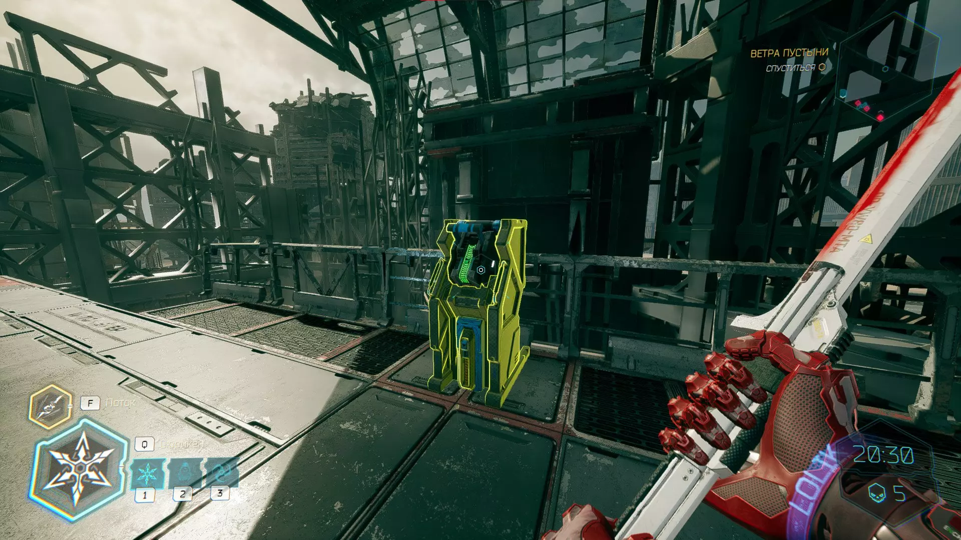 继续前进。飞到桥上,左上方会有一面墙,需要向墙投掷手里剑,以便吸附到平台上。对面会有另一个带有模块的小平台,飞到上面并拾取强化道具。 隐藏挑战【赛跑】:穿过所有数据传送门。
