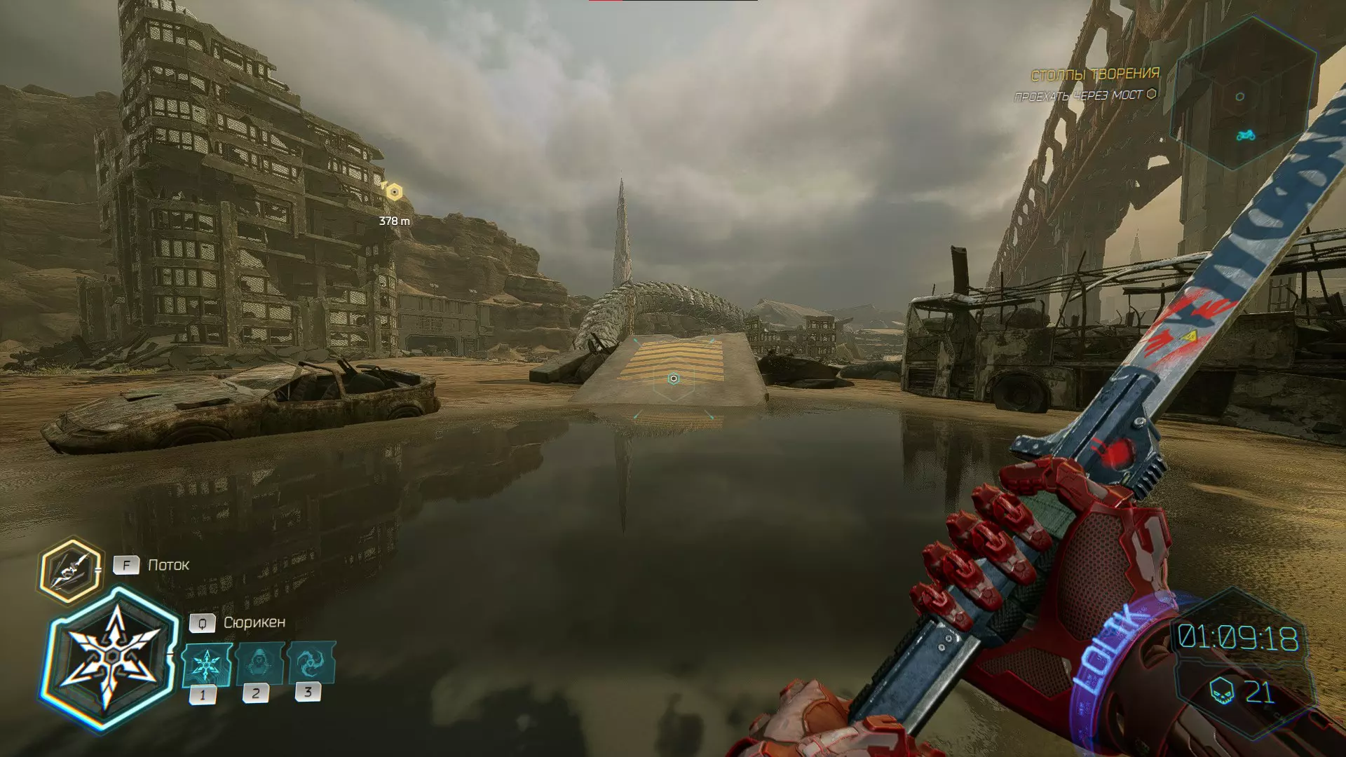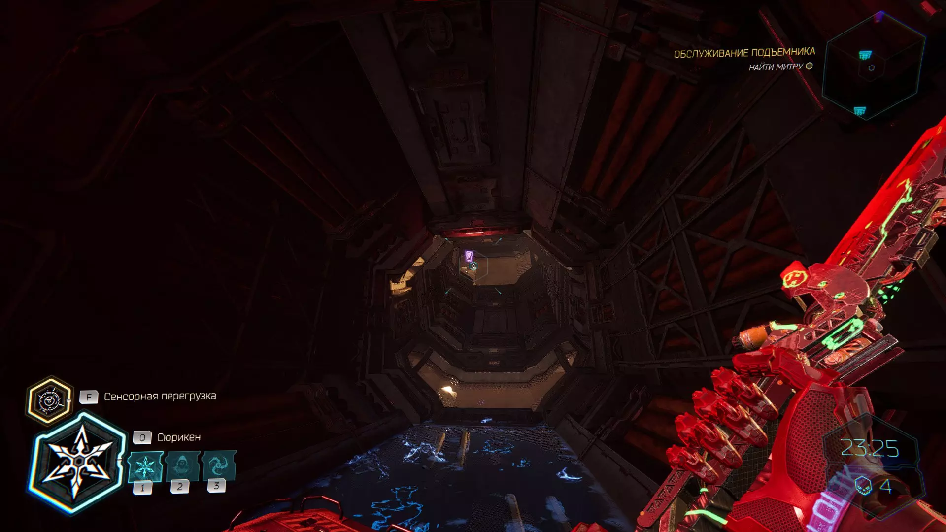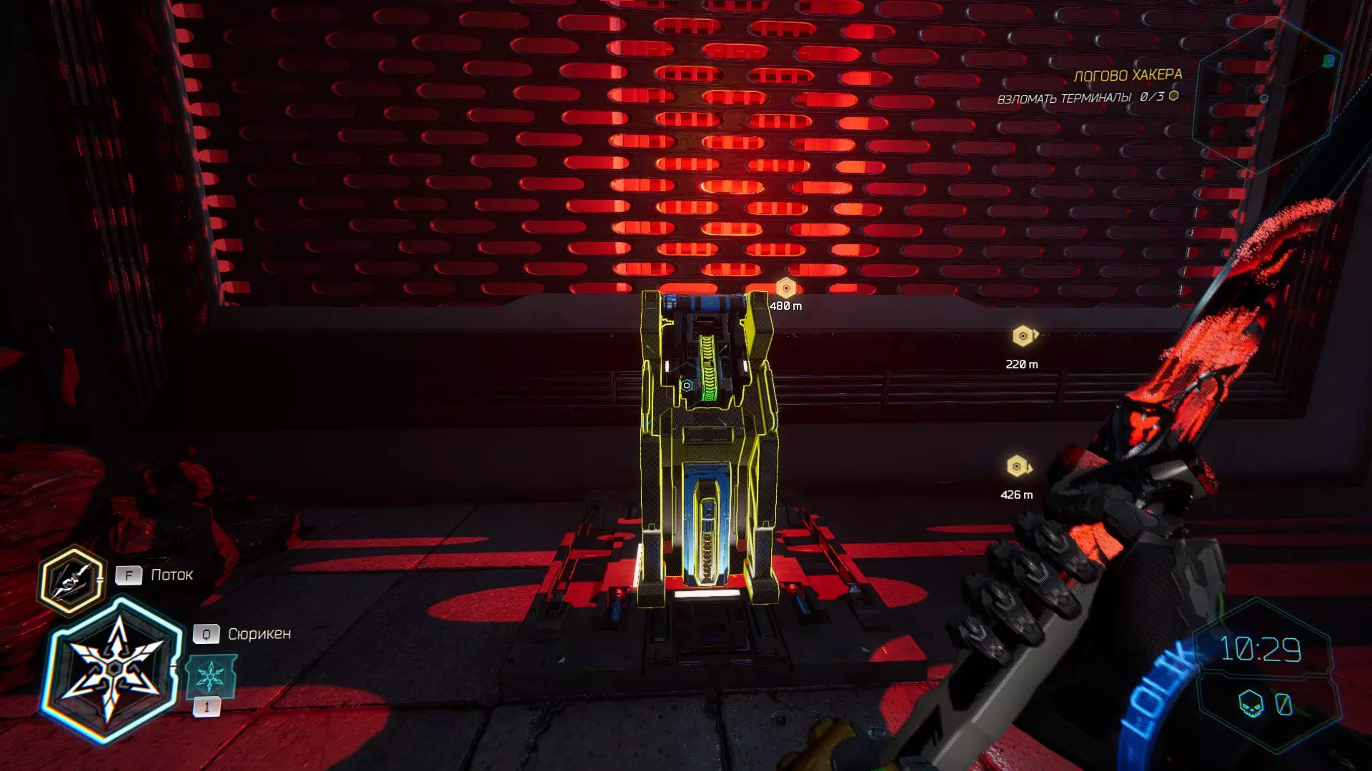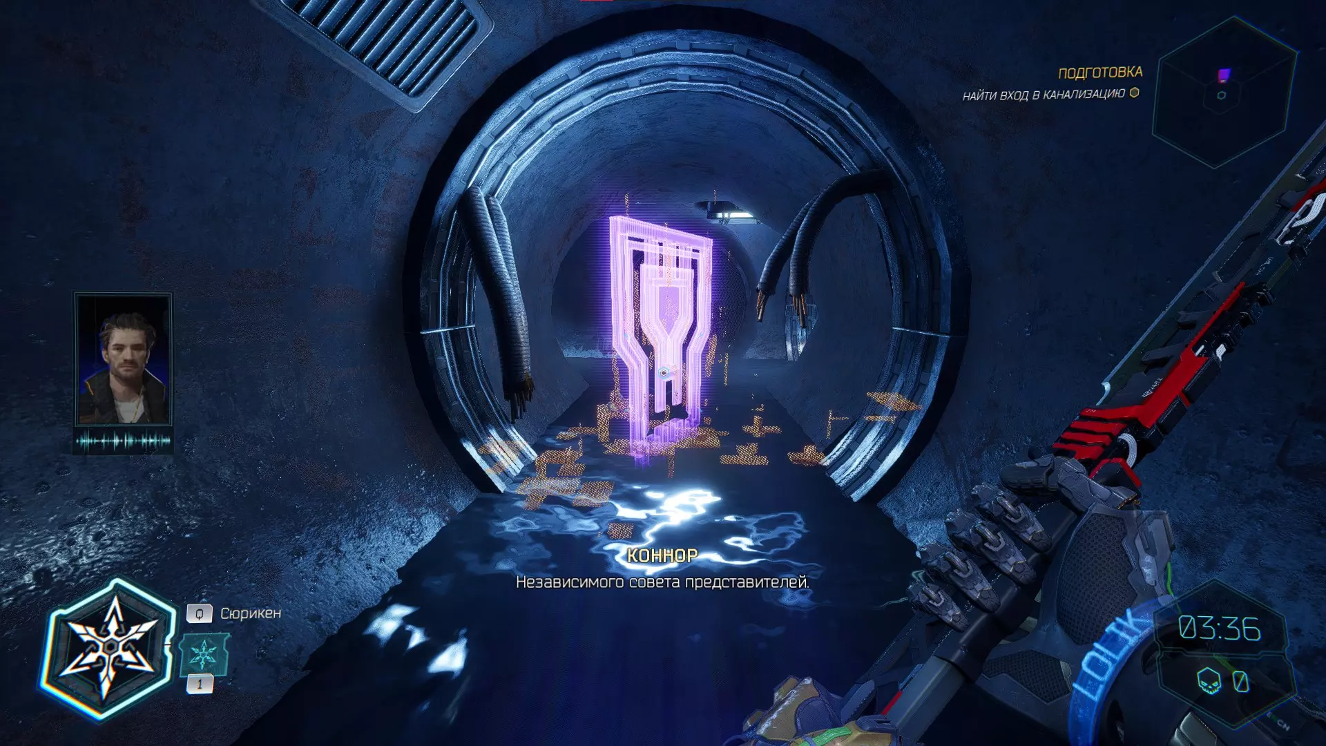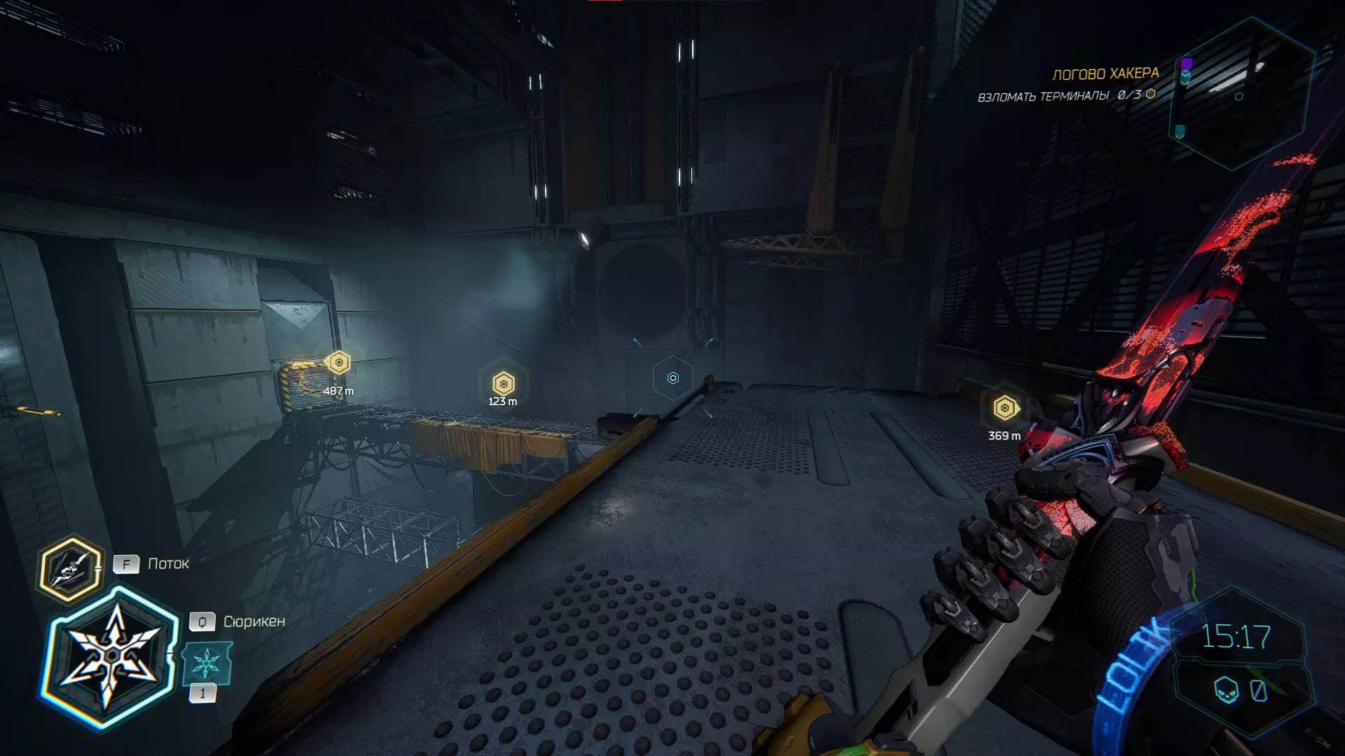 继续前进。飞到桥上,左上方会有一面墙,需要向墙投掷手里剑,以便吸附到平台上。对面会有另一个带有模块的小平台,飞到上面并拾取强化道具。 隐藏挑战【赛跑】:穿过所有数据传送门。