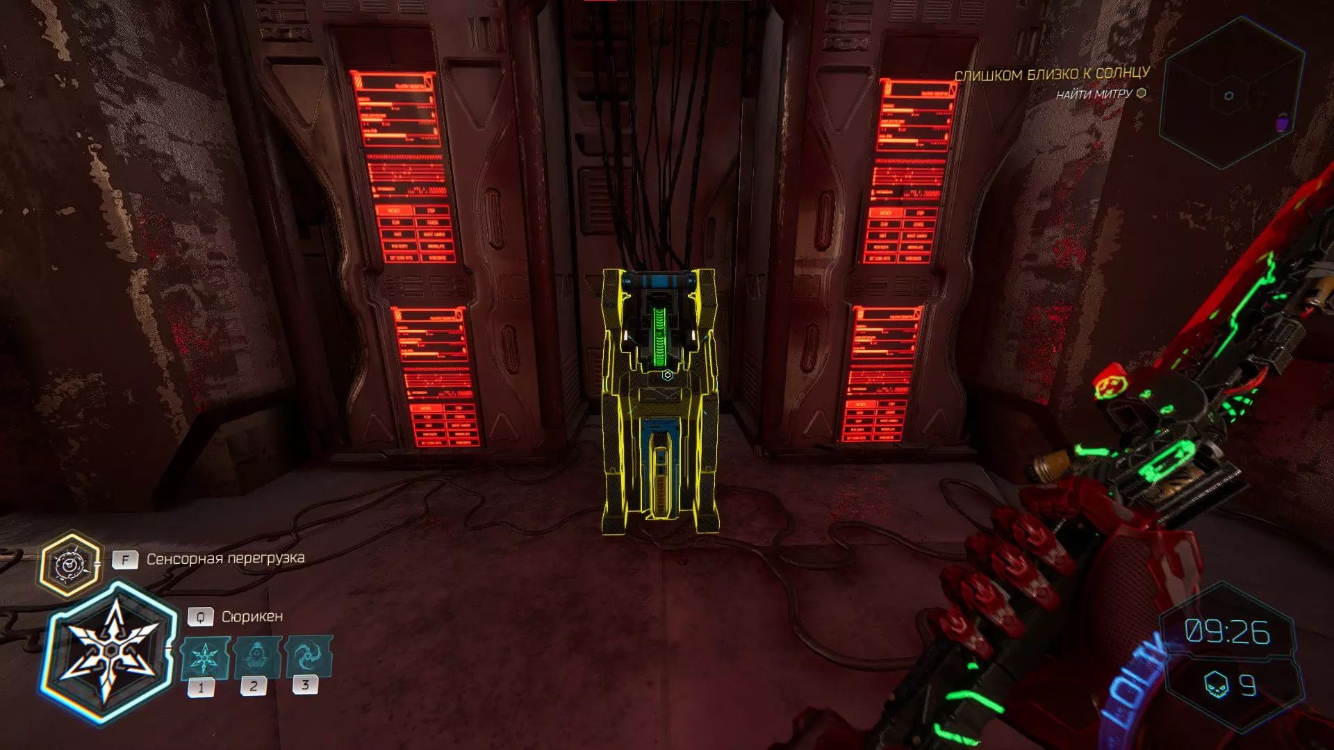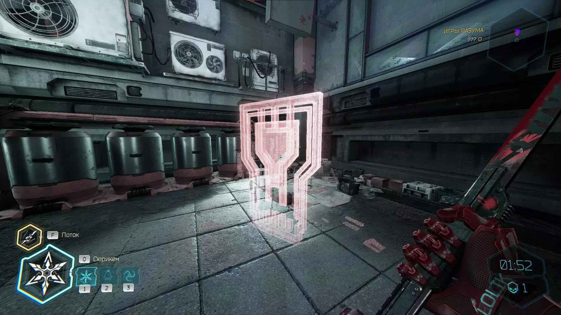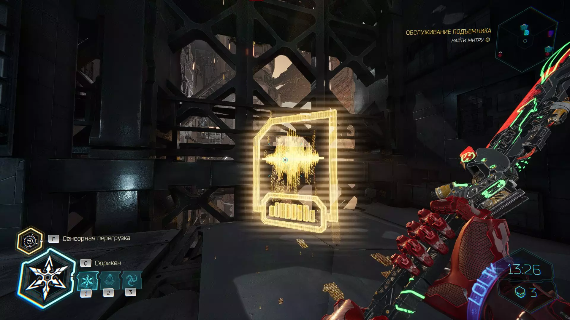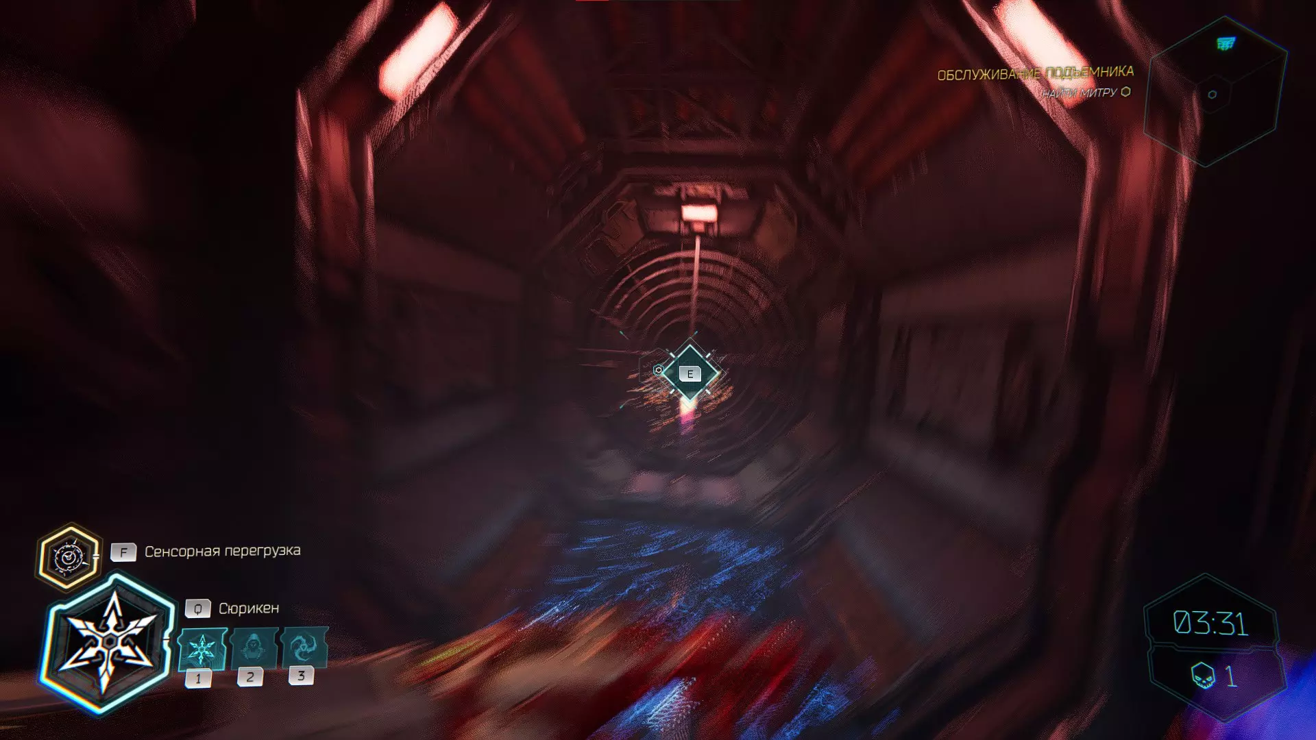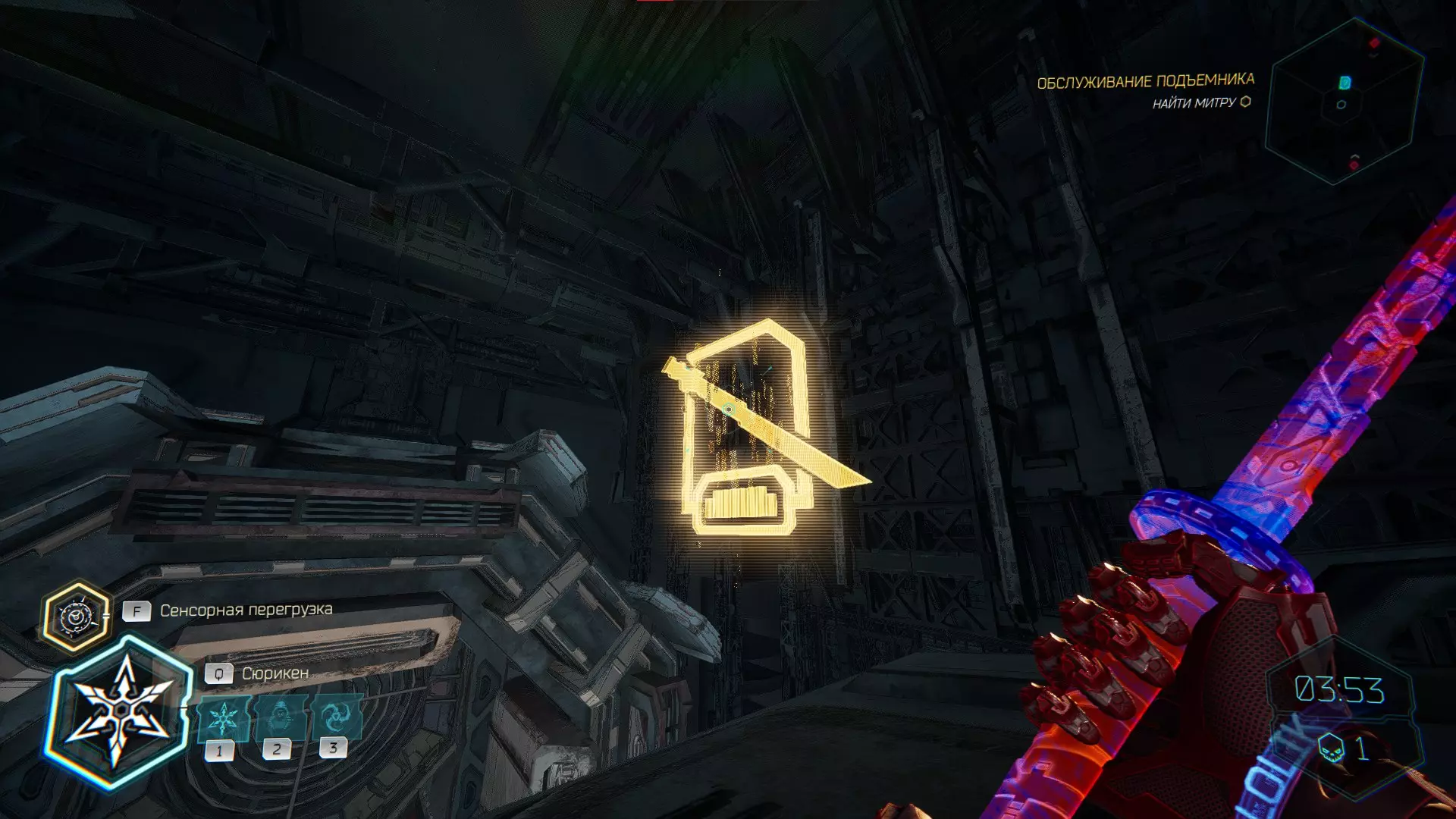 将手里剑投向电力护盾,然后借助通风机飞到上方平台。在右侧你会看到【内存碎片】。
