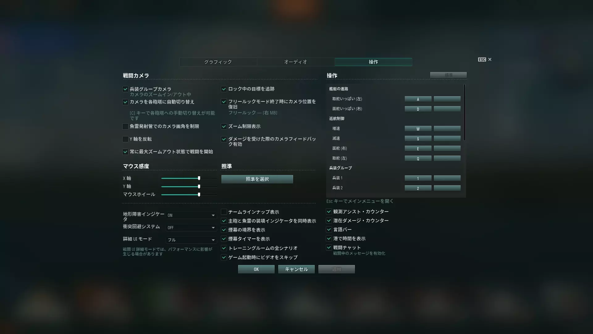 静态瞄准类型7与动态瞄准类型1的比较如下: 在距离15公里时,以全宽约40米(暂定)的大和为目标进行测量: - 静态瞄准类型7:约1.75刻度 - 动态瞄准类型1:约1刻度 在距离10公里时,以全宽约40米(暂定)的大和为目标进行测量: - 静态瞄准类型7:约2.25刻度 - 动态瞄准类型1:约1.5刻度 如果1刻度30节确实等于约15米(暂定),那么全宽约40米的大和应该显示为2.5刻度左右……但实际上,即便在10公里时1刻度30节等于约15米(暂定),瞄准显示也只有巡洋舰大小的宽度。不过,即便15公里外的1刻度=每秒30节的说法属实,实际速度却是其5倍的150节,约合每秒77米。现实情况是,直接瞄准正是以此为基准进行的。因此,按此计算,大和的全宽约为80米(´・ω・`)。请理解,这款游戏就是这样一款与现实毫无关联的休闲对战游戏。由于状态显示与实际游戏中瞄准接触到的信息存在偏差,所以越是认真瞄准、越是进行计算,误差就会越大,瞄准也就越容易出错。首先,接受这款游戏中的现实吧(´・ω・`) 调整界面 首先,将初始设置中默认关闭的功能开启,让重要信息能够显示在游戏画面上。 在对战游戏中,仅仅因为游戏画面提供的信息少就会处于不利地位。 在限制显示信息的情况下,依赖直觉和经验()只是浪费时间。 无论什么事情都无一例外,基础错误的盲目努力很容易白费时间。 这也违背了本指南轻松上手的宗旨,所以不推荐。 为了享受《战舰世界》,首先要充分利用所有可用的功能。