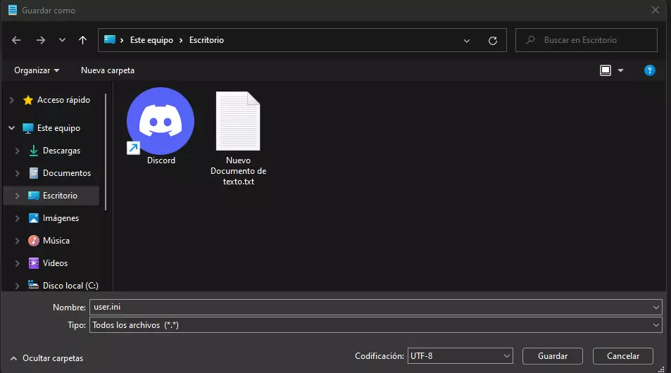 然后我们点击“文件”、“另存为”,将名称和扩展名设置为:user.ini,在保存类型中选择“所有文件”,然后保存。