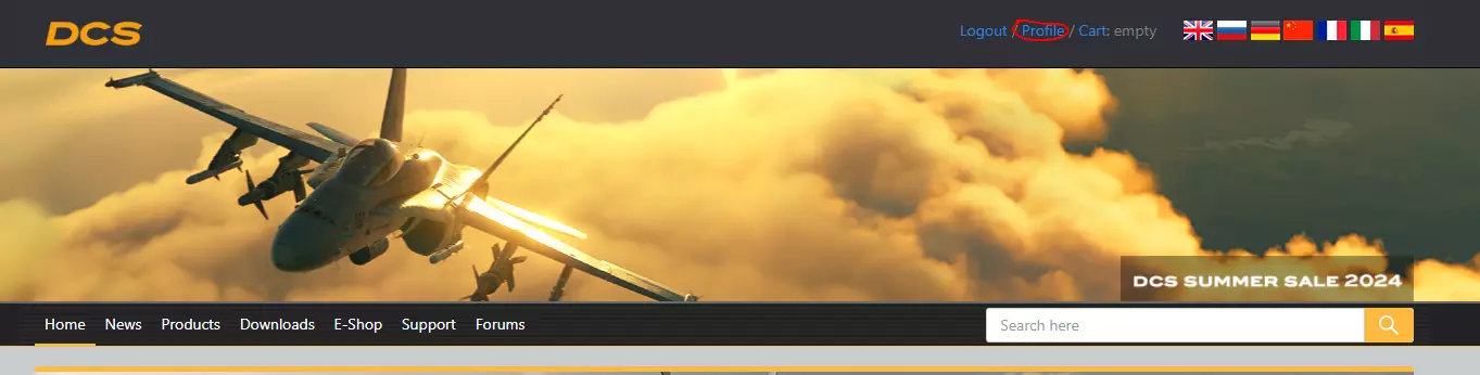 如何获取模块 现在你已确认相关说明,准备安装试用模块。 首先,你需要前往Eagle Dynamics DCS官网,登录后点击右上角的个人资料按钮。