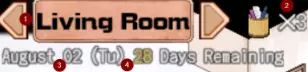 1. 当前位置和导航箭头 2. 剩余行动点数 3. 当前日期和星期 4. 剩余天数