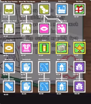 要解锁明里,需要使用面狐进行游戏。这是一条非常漫长的路。 每次面狐战斗需要消耗一点行动点。你可以选择一次性完成所有战斗,或者如果愿意的话,每天进行一次。面狐战斗仅在早上和白天开放。你需要拥有面狐卡片,该卡片可以在糖果店以500日元购买。所有卡片的功能相同,唯一的区别是卡片上的图案。游戏中的生命值等于耐力值(最高1000)。 比赛开始时会掷骰子决定谁先行动。习惯失败吧,这绝非偶然。门科 - 第一部分(前四场战斗可以在同一时间段内完成) 第一场战斗:门科 vs 男孩A 第二场战斗:门科 vs 男孩B 第三场战斗:门科 vs 女孩 第四场战斗:门科 vs 门泰 几天后的夜晚,在第二公园与门泰交谈 门科 - 第二部分 门泰回到第二公园,你需要在三个不同的日子里战胜他。在第三次击败门泰后,他会告诉你明里明天就会回来。 白天前往第二公园,与明里战斗。这场战斗你不能失败。在你获胜前,门泰会一直保持1点生命值。战斗结束后,明里将被解锁。 扭蛋 可以在糖果店右侧的自动售货机处购买扭蛋。每个扭蛋的价格为100日元和1点行动点。你获得的扭蛋是随机发放的。购买扭蛋后,扭蛋人会向你提出请求。如果你给扭蛋人集齐12个扭蛋,他会给你奖励。由于从机器中获得的扭蛋是随机的,你需要购买很多扭蛋才能凑齐扭蛋人需要的12个。扭蛋人晚上会出现在糕点店附近。奖励是【Sketchy】DVD光盘。要观看DVD,你需要拥有【夜行者】技能。在夜晚时,点击【夜晚】来推进时间,之后你将获得与某人共度良宵或在夜幕降临后四处游荡的机会。选择夜幕降临后的【散步】选项。前往客厅并点击电视,即可观看DVD。观看完DVD后,点击【深夜】并选择你想要共度良宵的女孩。以下是12个扭蛋(Gacha)按编号排列的顺序。