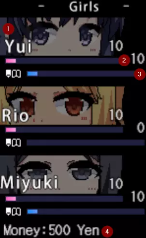本指南包含:游戏基础、额外任务、技能等内容。 【注意:本文含有剧透】 简介 游戏从一开始就在进行中,你并没有30天时间,因为会损失第一天和最后一天,所以你有四周共七天的工作时间。要完成所有任务,至少需要通关两次,甚至更多次,所以不要认为第一次就能成功。游戏共有10种不同结局。界面 屏幕右侧显示女孩们的状态、您的现金以及房屋地图。 1. 女孩姓名 2. 好感度等级 a. 每20点好感度会固定一次 b. 未完成家庭作业和未通过事件,您将无法提升好感度 3. 等级家庭作业 a. 每次提升好感度等级时,家庭作业会重置 b.家庭作业的最高分数为100分,但如果您完成得更多,将获得回忆点数。 4. 收银台中的资金