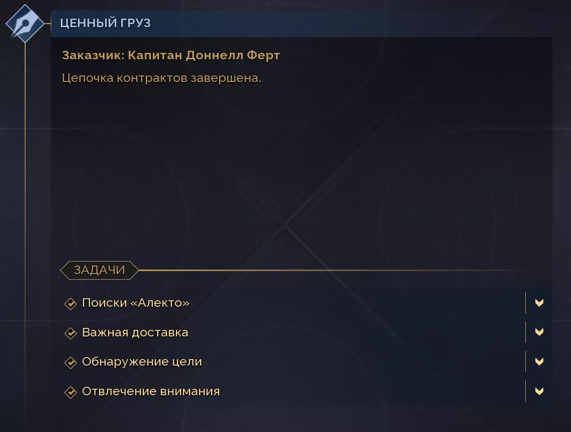 完成“教派”“危险交易”和“刀锋之上”系列任务。按J键追踪任务,选择目标任务后跟随指引进行。任务结束可获得成就。 除了额外任务(合约)外,还有主线任务(剧情)。 主线任务的完成方式类似,但内容更丰富多样,有时需要通过全球地图移动,因此需要自己的飞行翼。 过去、现在与未来