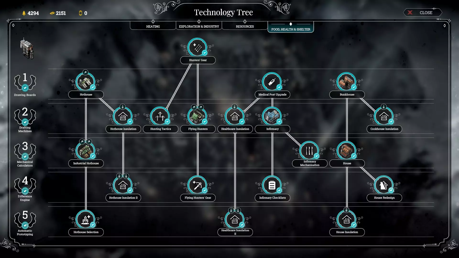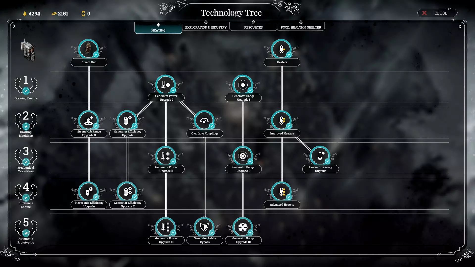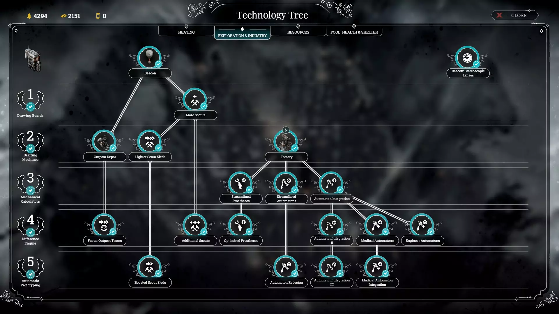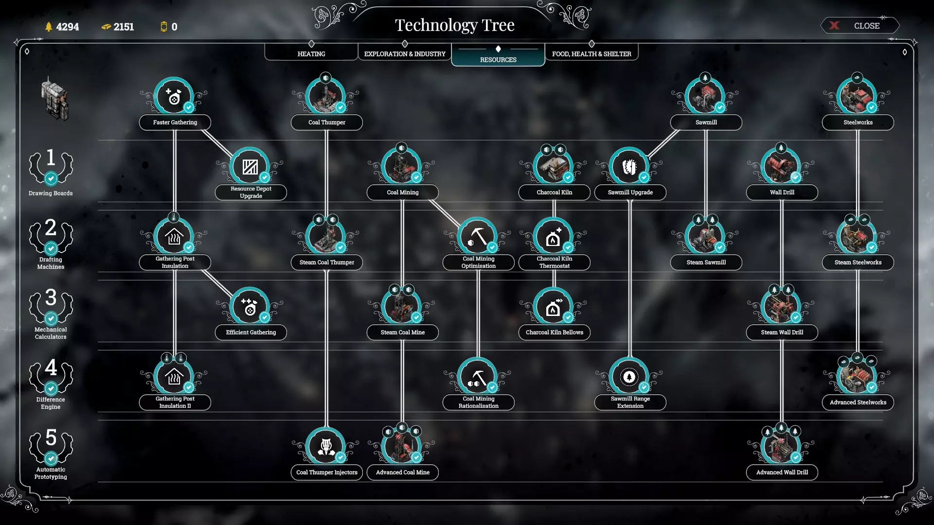 เทคโนโลยีด้าน Resources Faster gathering มักเป็นเทคโนโลยีแรกสุดที่คุณควรอัพตอนเริ่มเกม เมื่อคุณเก็บไม้จนจะหมดให้เริ่มทำการอัพ Sawmill และตามด้วย Steelworks ในเวลาที่ไล่เลี่ยกัน เทคโนโลยีด้านไม้นั้น Sawmill Upgrade ถือว่าคุ้มค่า หลังจากนั้นทำการเปิดโรงไม้อย่างน้อย 2 โรง เพราะ Sawmill ราคาถูกมาก(แค่10ไม้เอง) การมี Sawmill+upgrade 2-3 โรง จะทำให้คุณมีไม้ใช้เพียงพอไปอีกระยะหนึ่ง อีกอย่างไม้มักเป็นทรัพยากรที่ได้จากการสำรวจในปริมาณค่อนข้างมากอยู่แล้วด้วย หากคุณต้องการเสริมทรัพยากรทางด้านไม้จริงๆให้อัพ Wall drill 1 ขั้น และสร้างมันในทุกจุดที่สร้างได้ ผลผลิตจาก Wall drill จะทำให้ดุลด้านไม้ของคุณแข็งแกร่งขึ้นไปอีก แต่การอัพเกรดเพิ่มขั้น Wall drill นั้นไม่จำเป็นเท่าไหร่ เพราะมันใช้ steam core มากขึ้น ขณะที่ได้ไม้ต่อวันเพิ่มกลับมาไม่คุ้มค่าเอาเสียเลย Steam sawmill ไม่จำเป็นนัก (แต่อัพไปก็ไม่ถือว่าพลาด) เพราะหากต้องการไม้เพิ่ม คุณสามารถเพิ่มจำนวน Sawmill ได้เสมอ (ซึ่งจริงๆ 3 Sawmill + 2 Wall drill ก็แทบเหลือใช้บานเบอะแล้ว) Sawmill range extension ก็ไม่จำเป็นนักเช่นกัน เพราะย้ายตำแหน่งเองก็ได้ ลองคิดดูว่าคุณจะต้องมานั่งย้ายไอ้ Sawmill (ราคา10ไม้) สักกี่ครั้งใน1เกมกันเชียว ทางด้านทรัพยากรเหล็ก มันจะมีจำกัดพื้นที่ตั้งพวก Steelworks แค่ 2 จุดในแต่ละด่าน และเนื่องจากการที่ตั้งโรงงานได้จำกัด ช่วงต้นถึงกลางเกมจึงเป็นทรัพยากรที่ผลิตได้น้อยที่สุด ถือเป็นทรัพยากรคอขวด(ทรัพยากรที่มักขาด) ทุกครั้งที่คุณไต่ tier เทคโนโลยีขึ้นไป ควรเร่งปลดล็อคโรงเหล็กระดับสูงขึ้นไปทุกครั้งเพื่อเพิ่มผลผลิตเหล็ก (อีกอย่างคือโรงเหล็กไม่ใช้ steam core) การได้มาซึ่งทรัพยากรถ่านหินมี 3 วิธี คือ coal thumper / coal mining / charcoal kiln Coal mining ทั้งหลายเหมาะกับต้นเกมที่ประชากรยังจำกัด อัตราถ่านต่อคนทำงานค่อนข้างน่าพึงพอใจ ตัวโรงงานเก็บความร้อนได้ดีพอสมควร แต่ข้อเสียคือมันใช้ steam core ในการสร้างและอัพเกรด Coal thumper เหมาะกับการเสริมทรัพยากรถ่านในช่วงกลางเกมถึงท้ายเกม เพราะถึงตอนนั้นคุณจะมีแรงงานประชากรจำนวนมาก ซึ่งวิธีการเก็บถ่านจาก Coal thumper เราจะได้ถ่านจำนวนมากจริงๆ แต่มันต้องสร้าง gathering post ติดๆกันแล้วสั่งให้คนงานประจำ gathering post เก็บถ่านให้ ซึ่งต้องใช้ gathering post 2 อัน ต่อ 1 coal thumper และต้องใช้ gathering post 4 อัน ต่อ 1 steam coal thumper (สรุปคือโดยรวมต่อ 1 complexคุณจะได้ถ่านหินจำนวนมาก แต่ก็ต้องใช้คนงานมากด้วยเช่นกัน) แถมอัพแค่ตัว Thumpers ไม่พอคุณยังต้องเสียเวลามานั่งอัพ gathering post insulation และ effecient gathering อีกด้วยเพื่อให้การเก็บมีประสิทธิภาพเต็มที่และคนงานไม่ป่วยง่าย (เพราะ gathering post เก็บความร้อนได้ไม่ค่อยดี) อย่างไรก็ตามเนื่องจากการสร้าง Thumpers ไม่ใช้ Steam core ทำให้เราสามา