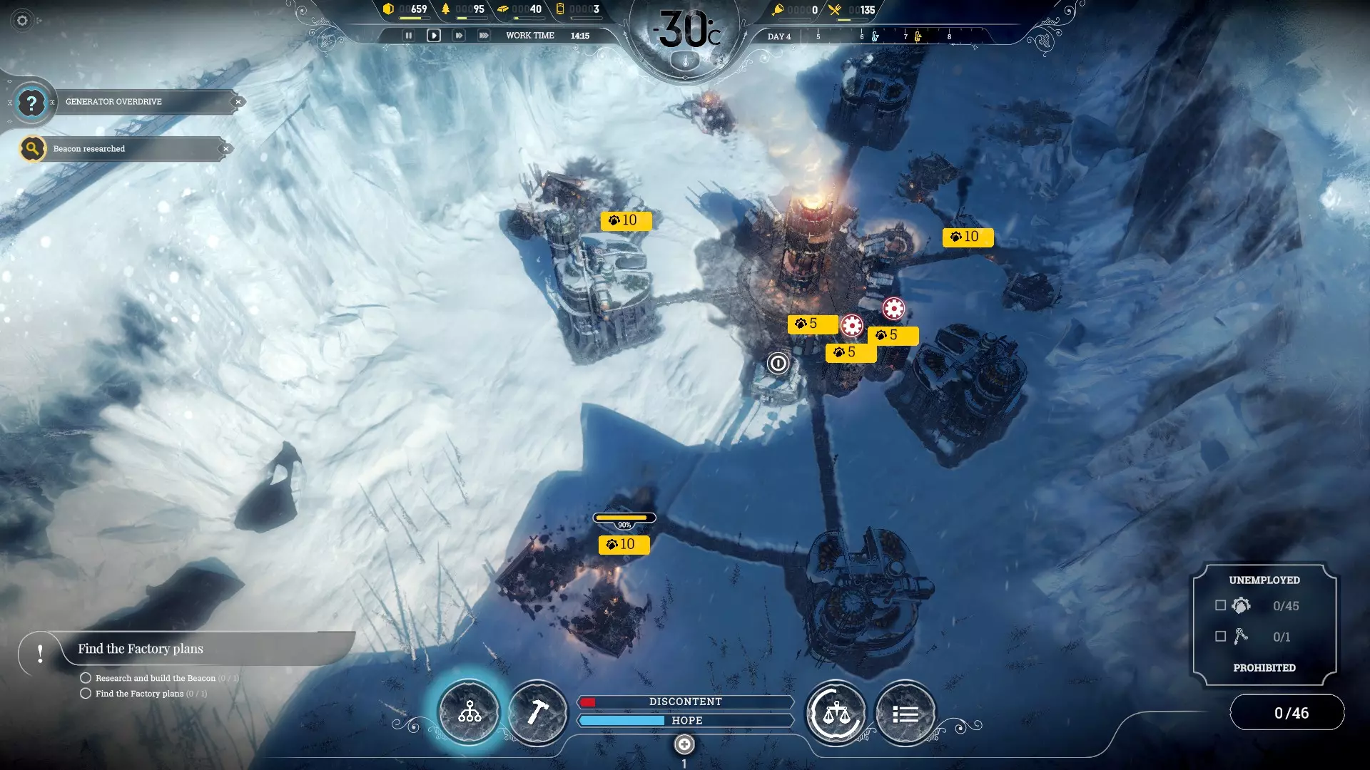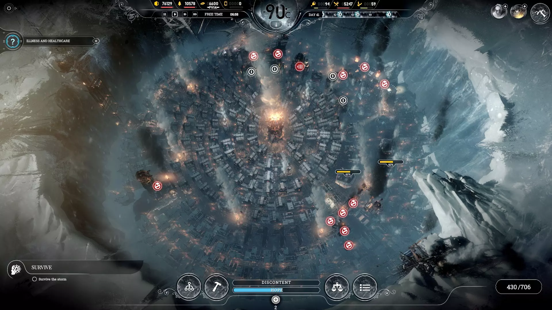 เทคโนโลยีด้าน Food, Health and Shelter การได้มาซึ่งอาหารมี 2 แบบหลัก คือล่าเอา (Hunter's hut) หรือปลูกเองจากเรือนเพาะชำ (Hot house) ทางที่ดีให้ตัดสินใจเลือกทางใดทางหนึ่งแต่ต้นเกม และวิจัยด้านนั้นให้ลึกเพื่อให้ได้ผลผลิตจำนวนมาก สายเนื้อ (Hunter's hut) นั้นสิ้นเปลืองแรงงานคนจำนวนมาก ขณะที่สายผัก (Hot house) เองก็สิ้นเปลือง Steam core จำนวนนึงด้วยเช่นกัน ผมมองว่าคุณสามารถกำหนดแผนการเล่นเป็น combo โดยใช้ทางเลือกแหล่งที่มาของถ่านหินและอาหารได้ กล่าวคือ (Hot house + Coal Thumper) หรือ (Hunter's hut + Coal mining) หลักการของ combo พวกนี้คือ มีของอย่างหนึ่งที่ใช้ Steam core ในการสร้างแต่ใช้กำลังคนน้อย ดังนั้นคนที่เหลือก็จะถูกโยกไปยังอีกส่วนที่ใช้กำลังคนมากแต่ไม่ต้องการ steam core ในการสร้าง อย่างไรก็ตามนี่เป็น Idea คร่าวๆเท่านั้น จริงๆช่วงค่อนท้ายเกมคุณควรมีการได้มาซึ่งถ่านหินและอาหารจากทั้ง 2 แหล่งอยู่ดี ขึ้นกับว่าจะเลือกเน้นไปที่แบบไหนมากกว่ากัน ตอนเริ่มเกม คุณจะอัพ Hunter's gear หรือไม่ก็ไม่ผิด เพราะช่วงแรกคุณอาจหาอาหารด้วย Hunter hut 1-2 อันไปก่อน พอคนเริ่มจะเยอะขึ้น ค่อยมาเลือกการผลิตอาหารเน้นไปที่สายใดสายหนึ่งทีหลัง แต่หากคุณต้องการเล่นสายผัก (Hot house) อาจข้าม Hunter's gear ไปได้เลย และมุ่งเอา Hot house มาเป็นแหล่งอาหารหลัก อย่างไรก็ตามสายนี้คุณสามารถสร้าง Hunter's hut เสริมได้เป็นระยะ (เพราะมันเป็นสิ่งก่อสร้างที่สร้างได้แต่ต้น) ด้าน Health คุณจะเริ่มอัพก็ต่อเมื่อคนป่วยเริ่มเพิ่มจำนวนมากขึ้นเรื่อยๆ จนคุณรู้สึกว่าอาจรักษาไม่ทัน จุดสำคัญคือ พยายามสังเกตว่าคนป่วยจากอะไรแล้วไปแก้ที่ต้นเหตุด้วยเสมอ เช่น ป่วยจากที่ทำงานเย็นเกินไปก็พิจารณาอัพเกรดเตาหรือ Heater ไม่ใช่รอแก้แต่ที่ปลายเหตุอย่างเดียว หากพบว่าสาเหตุที่ทำให้คนป่วยคือการนอนในเต๊นท์ห่วยๆแล้วล่ะก็ คุณต้องอัพบ้านระดับสูงขึ้นและสร้างมันเพื่อแก้ไขปัญหาที่ต้นเหตุ (ระหว่างนี้อาจประคองจำนวนผู้ป่วยโดยการสร้างสถานพยาบาลเพิ่มเติมไปก่อน) สาย Health หากคนไม่ป่วยมากก็ไม่จำเป็นต้องอัพเกรดให้ลึก ยกเว้นเตรียมรับเหตุการณ์เฉพาะหน้า เช่น เตรียมรับกลุ่มผู้อพยพที่มีคนป่วยอยู่ด้วยจำนวนมาก หรือเตรียมรับมือพายุหิมะสุดท้ายในด่าน New home การอัพเกรด Shelter ควรหาจังหวะทำต่อเนื่องตลอดทั้งเกม ยิ่งผ่านไปหลายๆวันอากาศเริ่มเย็นลง คุณยิ่งควรอัพลงไปให้ได้ House เป็นอย่างน้อย (House ในเกมนี้ดีสมเป็นสิ่งก่อสร้างสุดสายมาก) หากอัพ House เสร็จและมีเวลาเหลือ อีกทางเลือกหนึ่งที่น่าสนใจคือ House redesign ที่ลดไม้และเหล็กที่ใช้ในการสร้างบ้านลง ยิ่งอัพเร็วย่อมประหยัดได้มาก ตัวมันเสียเวลาอัพแค่ครั้งเดียว และคืนทุนหลังจากสร้างบ้า
